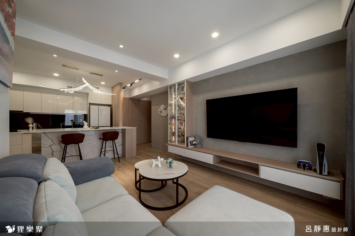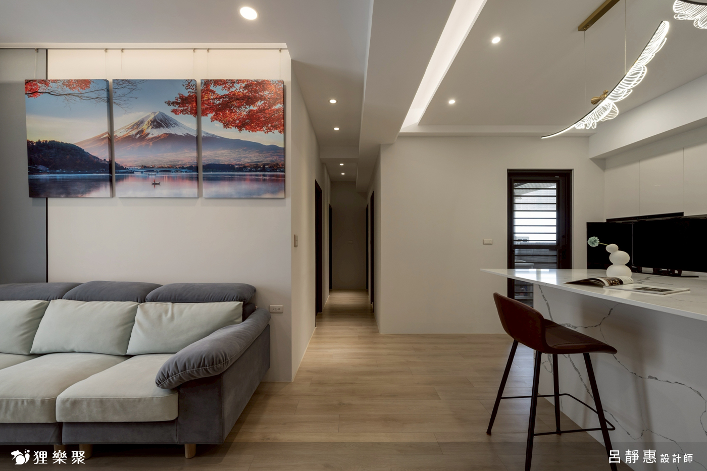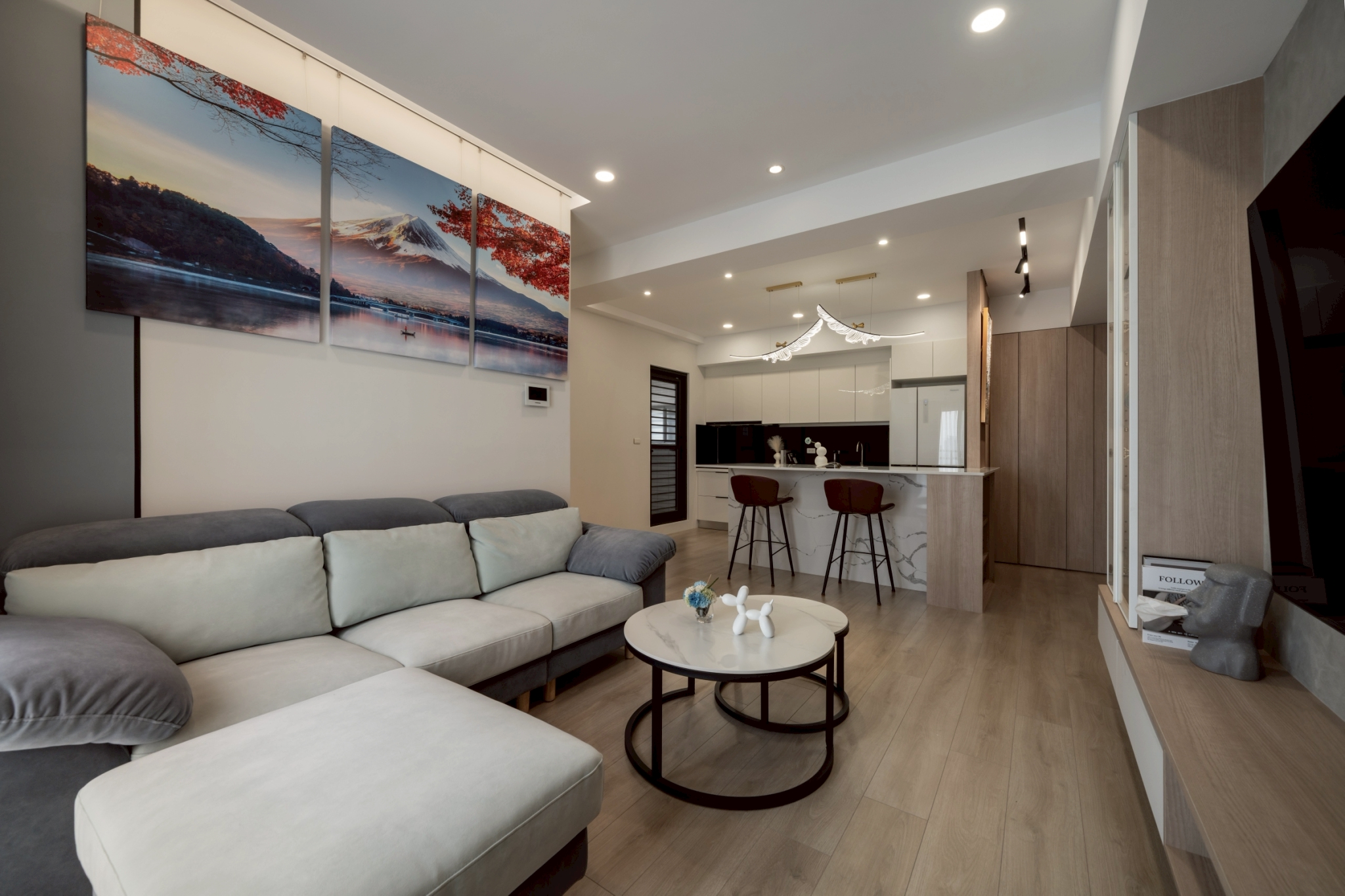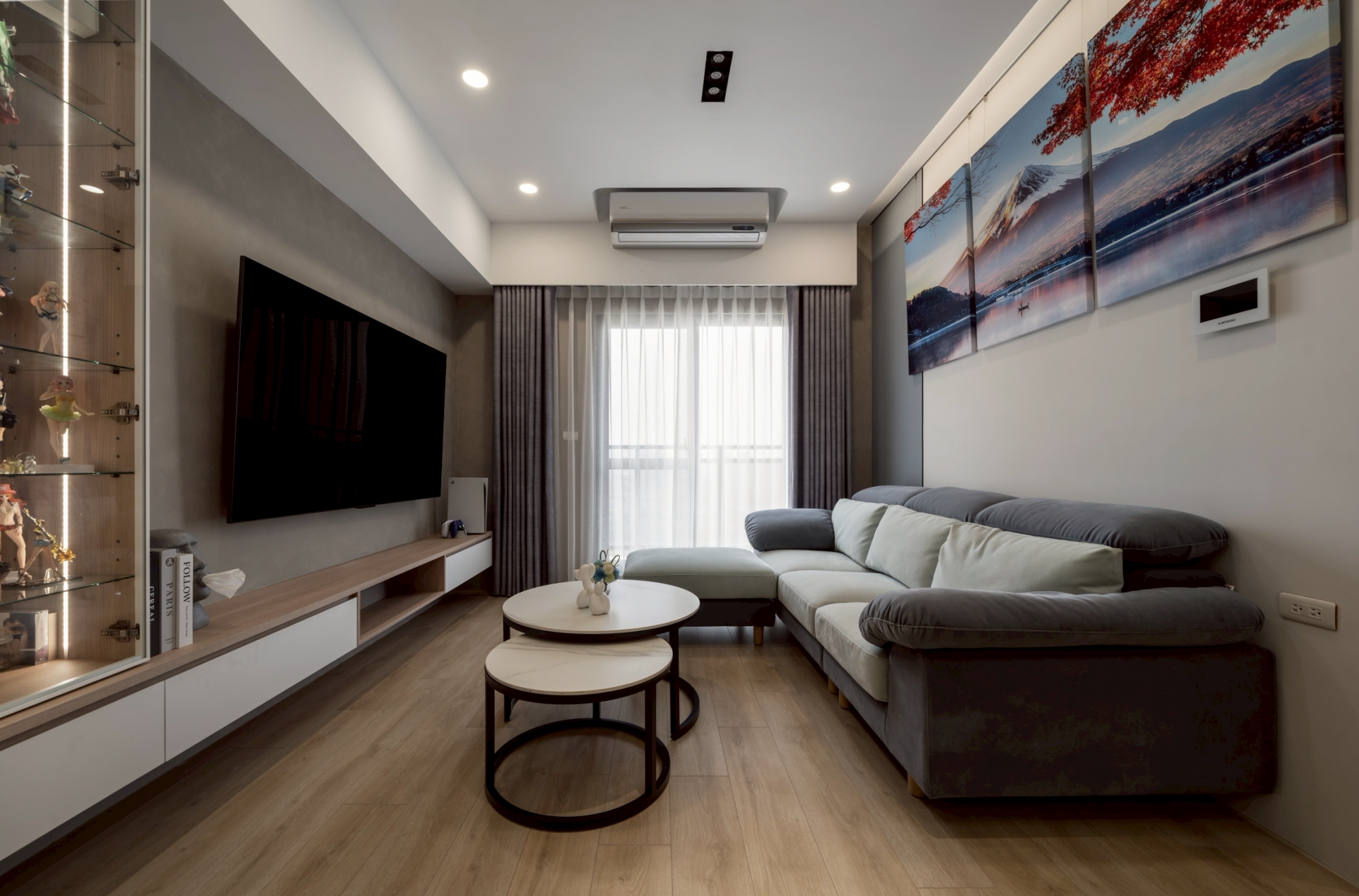 進門玄關處,設計師以中國庭院的框景手法,透過視覺錯覺線條做對稱設計,弱化量體,分區打造收納櫃,以現代北歐風大地色系串起玄關與客餐廳,讓屋主能輕鬆收納電器及鞋具。客廳區域以灰色電視牆作為主視覺,襯上現代風筆直線條打造展示櫃,能自由擺設心愛小物;沙發背牆則大面積留白,透過藝術掛畫點綴,為居家增添溫度,讓客廳成為下班後放鬆舒壓的療癒之所。