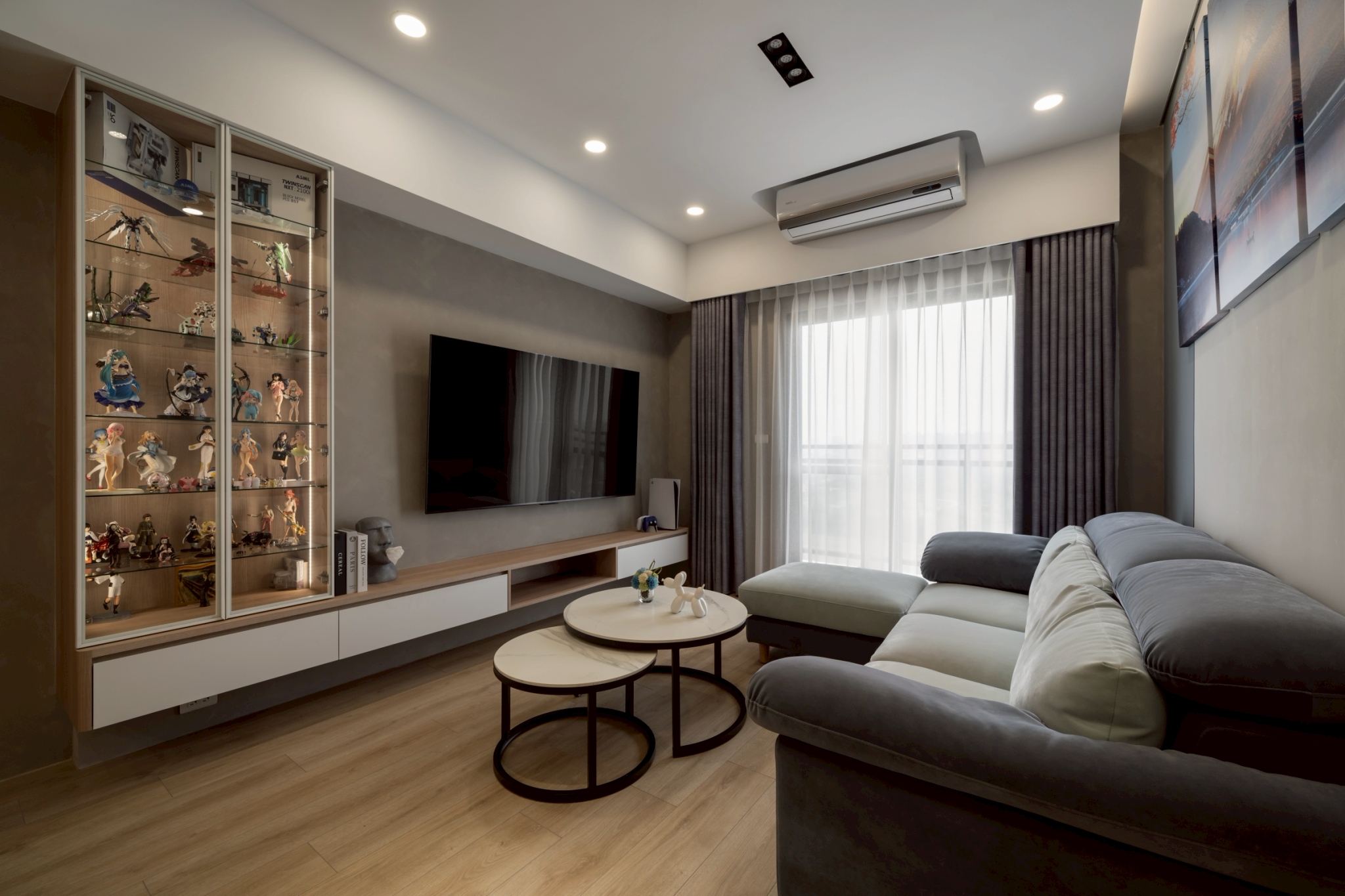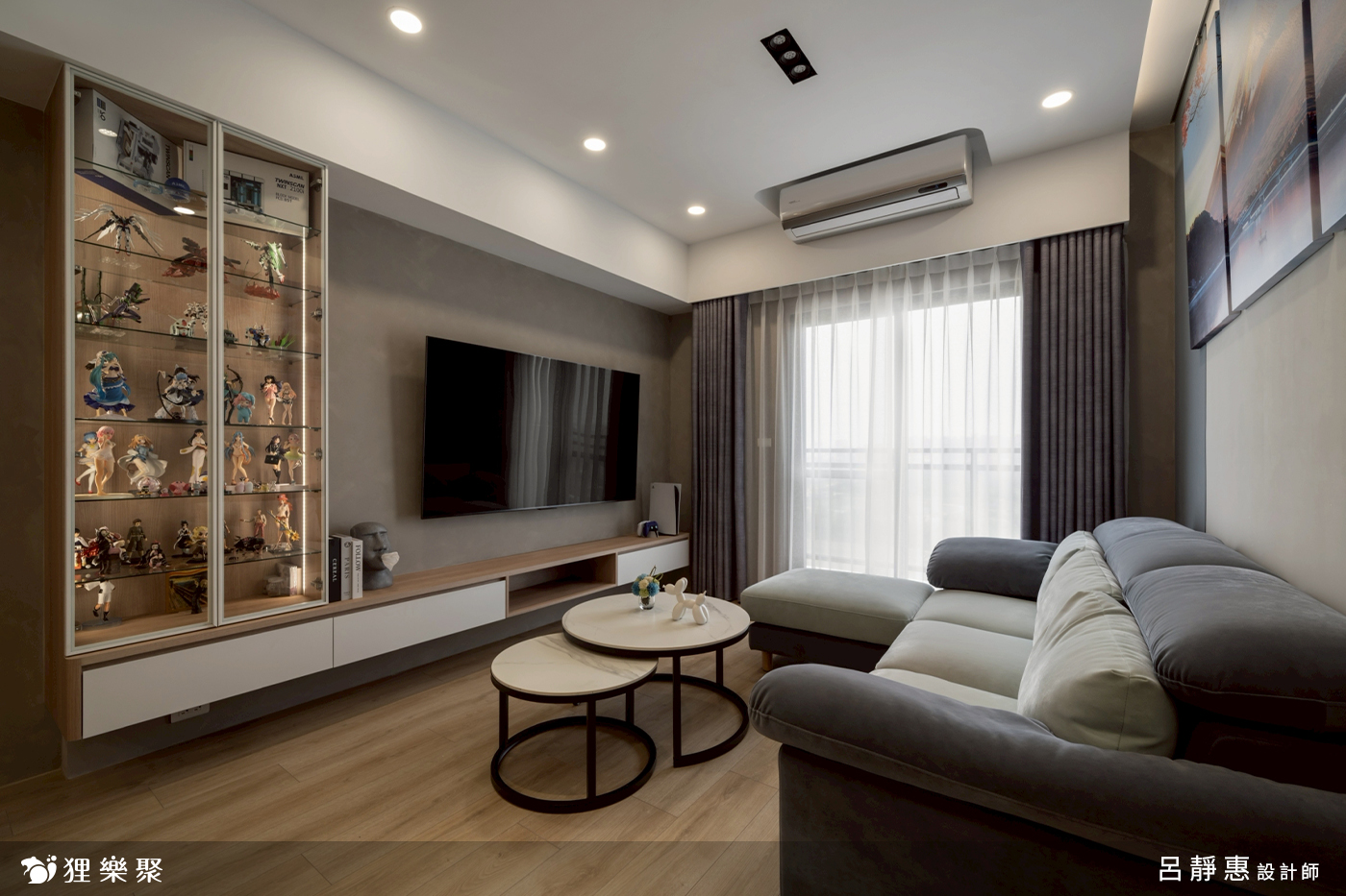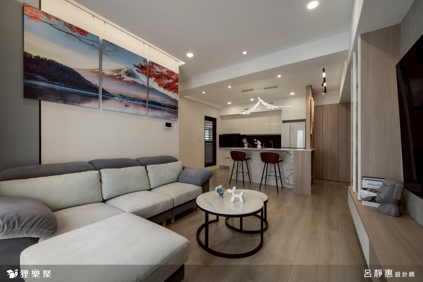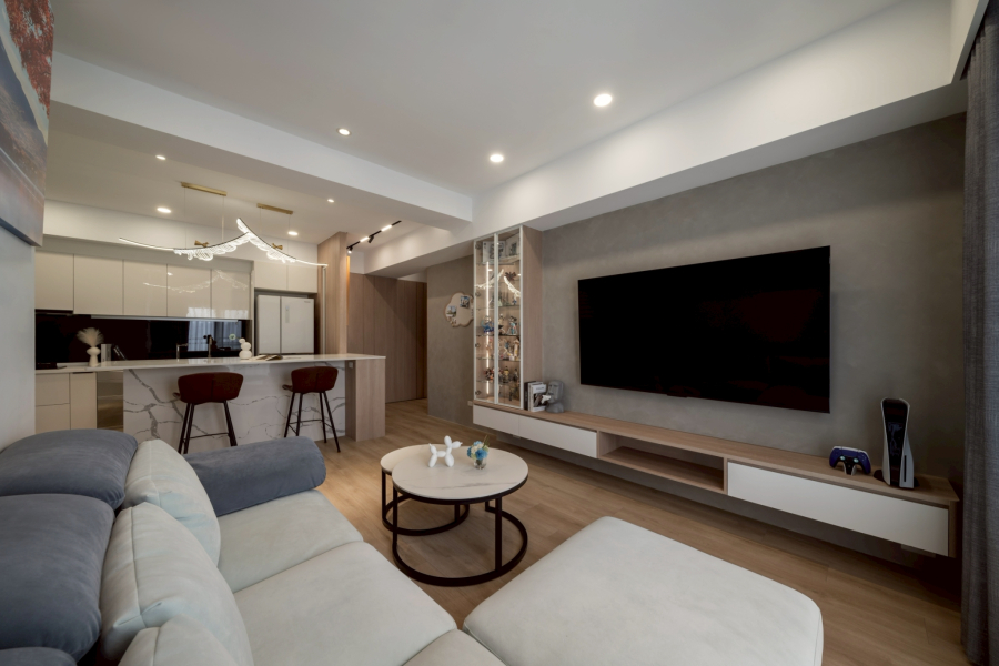 進門玄關處,設計師以中國庭院的框景手法,透過視覺錯覺線條做對稱設計,弱化量體,分區打造收納櫃,以現代北歐風大地色系串起玄關與客餐廳,讓屋主能輕鬆收納電器及鞋具。客廳區域以灰色電視牆作為主視覺,襯上現代風筆直線條打造展示櫃,能自由擺設心愛小物;沙發背牆則大面積留白,透過藝術掛畫點綴,為居家增添溫度,讓客廳成為下班後放鬆舒壓的療癒之所。
