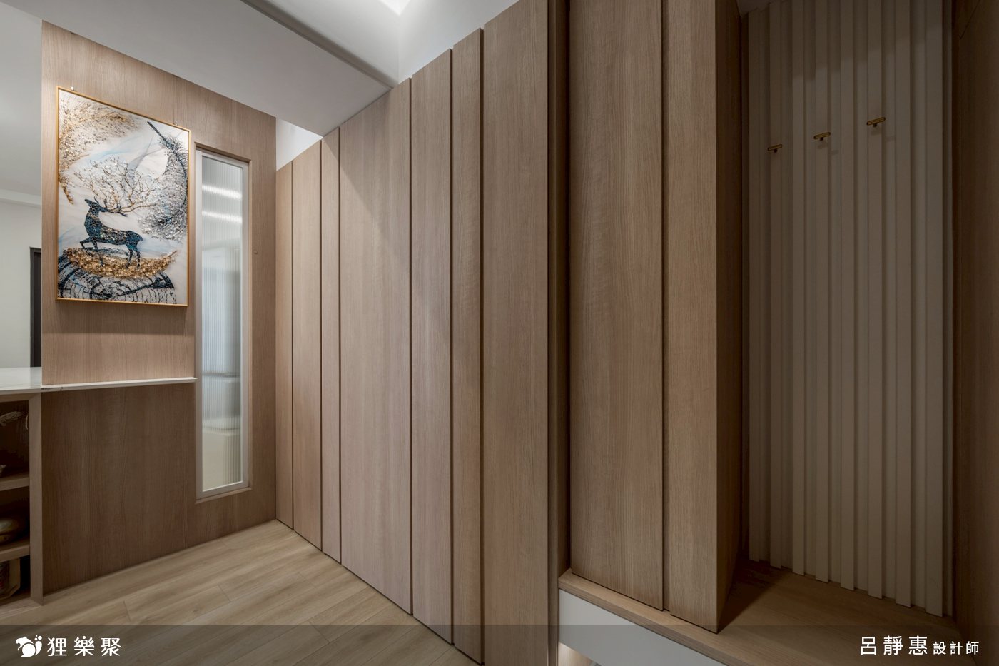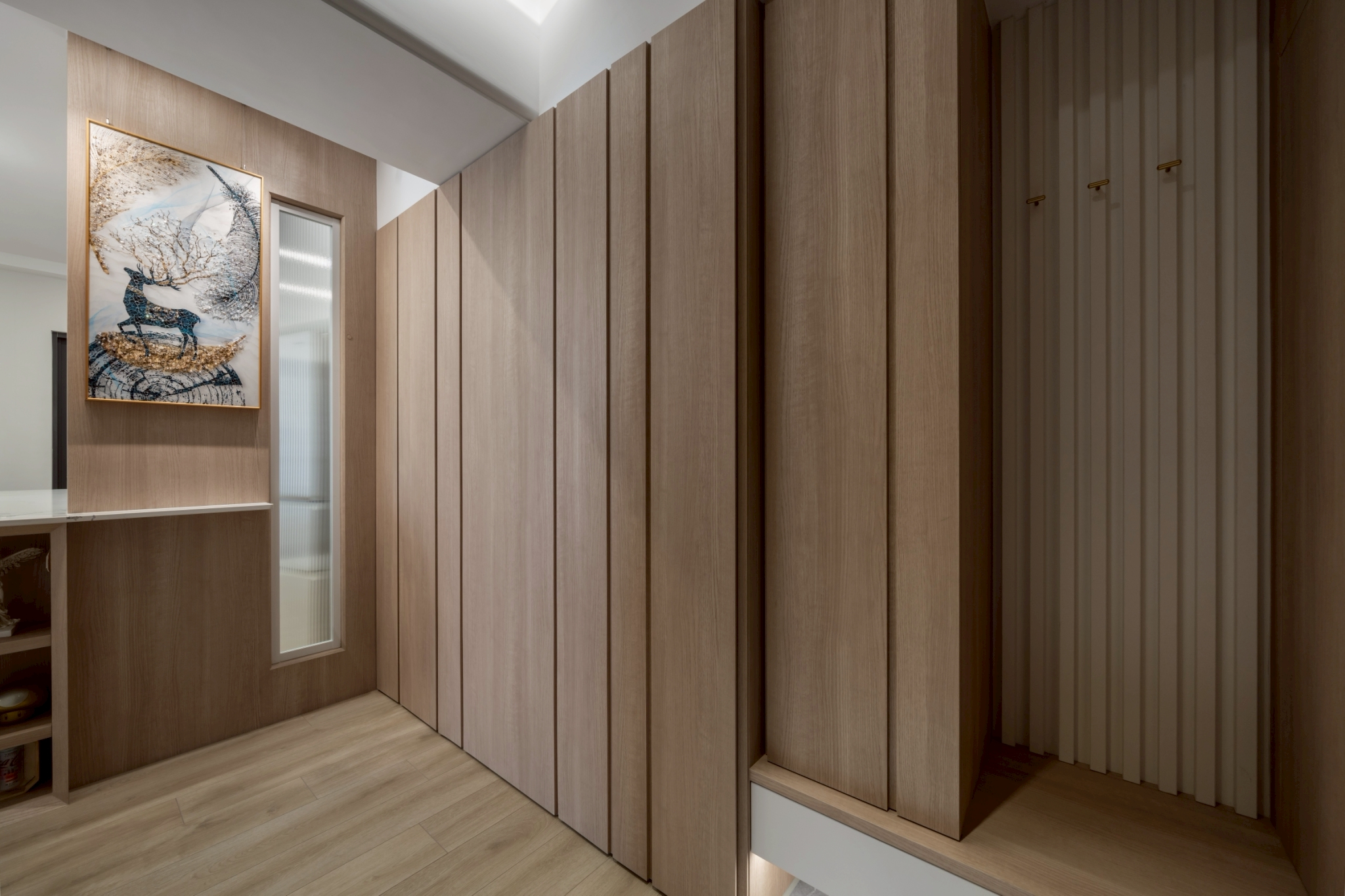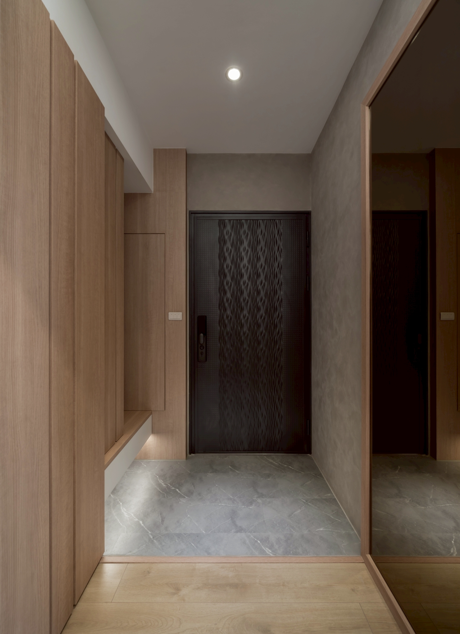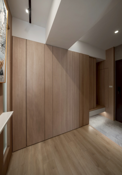 身處都市高壓環境,屋主渴望擁有一個能舒緩壓力、放鬆心情的家。設計師採用北歐風暖色系與現代風簡約線條,讓整體空間更顯通透柔和。玄關部分結合中國庭院框景元素,透過視覺錯覺線條規劃對稱設計收納牆面,方便屋主擺放電器與鞋具,放大使用率的同時也使空間保有寬敞感受。公領域則以灰白色調與木元素搭配,並於餐廚區設計了中島,不論備料、用餐皆很方便,完美結合美感與實用性。臥室部分延續北歐風的明亮與現代風俐落的線條,打造實用的收納櫃,圍塑靜謐且舒適的休憩空間。透過現代北歐風的舒適與實用設計,創造質感機能兼具的42坪木質宅。現代北歐風收納宅