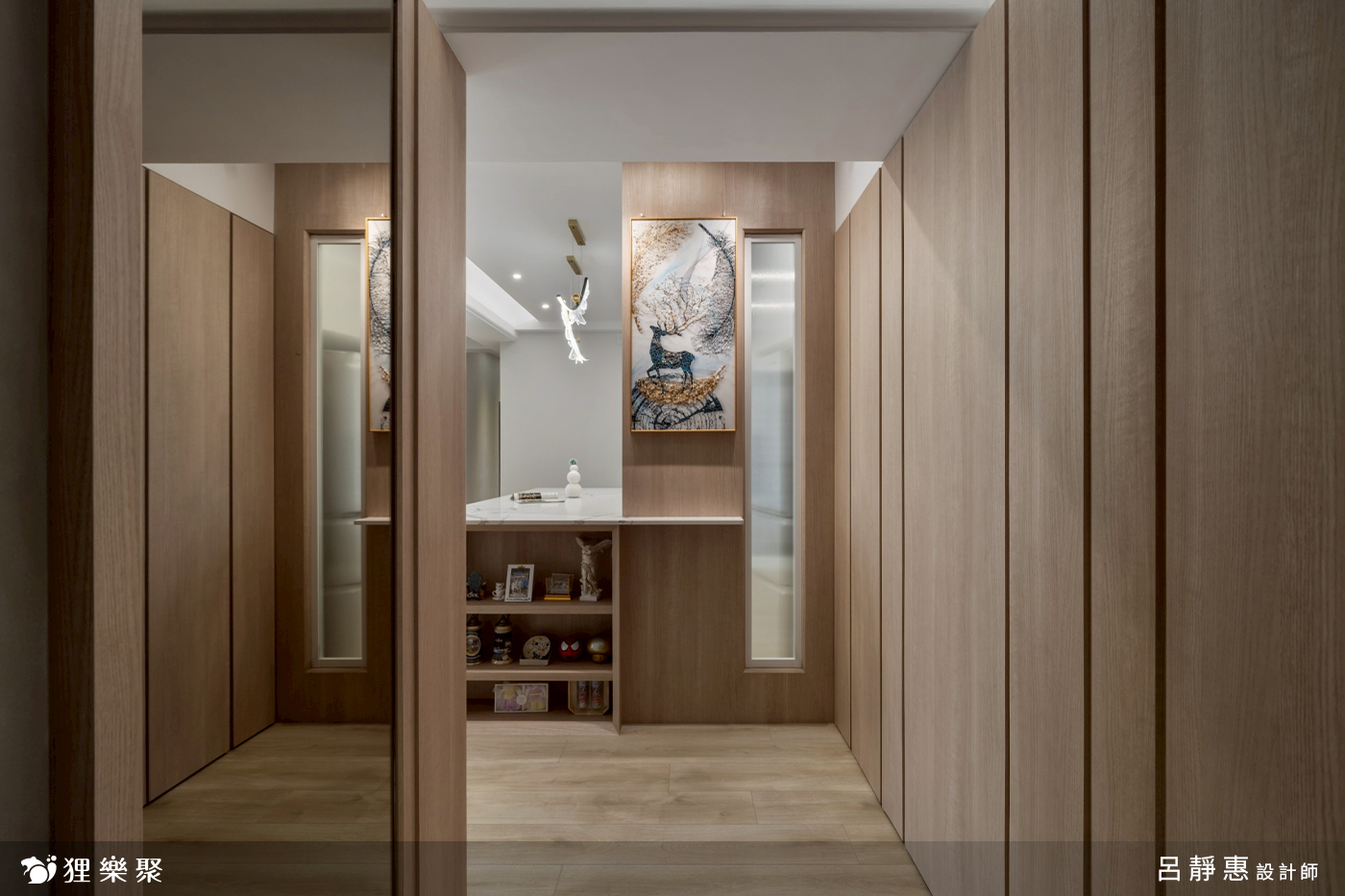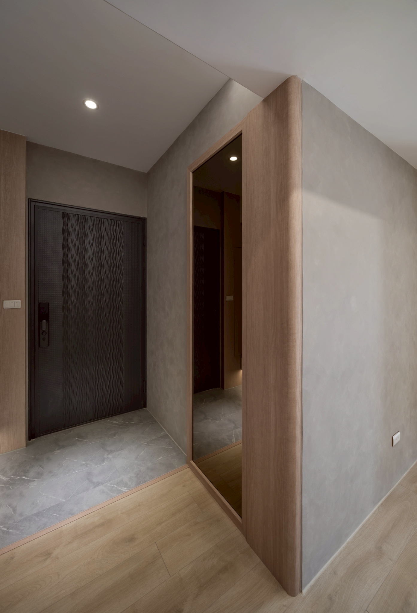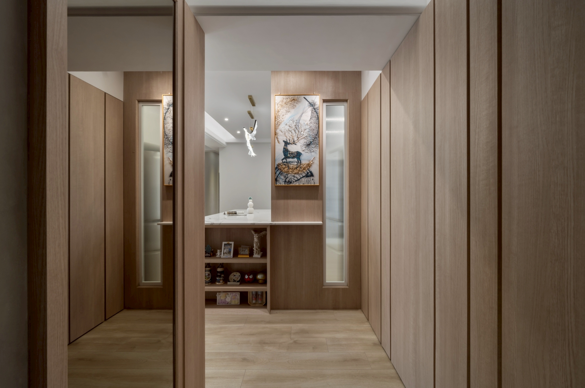 身處都市高壓環境,屋主渴望擁有一個能舒緩壓力、放鬆心情的家。設計師採用北歐風暖色系與現代風簡約線條,讓整體空間更顯通透柔和。玄關部分結合中國庭院框景元素,透過視覺錯覺線條規劃對稱設計收納牆面,方便屋主擺放電器與鞋具,放大使用率的同時也使空間保有寬敞感受。公領域則以灰白色調與木元素搭配,並於餐廚區設計了中島,不論備料、用餐皆很方便,完美結合美感與實用性。臥室部分延續北歐風的明亮與現代風俐落的線條,打造實用的收納櫃,圍塑靜謐且舒適的休憩空間。透過現代北歐風的舒適與實用設計,創造質感機能兼具的42坪木質宅。現代北歐風收納宅