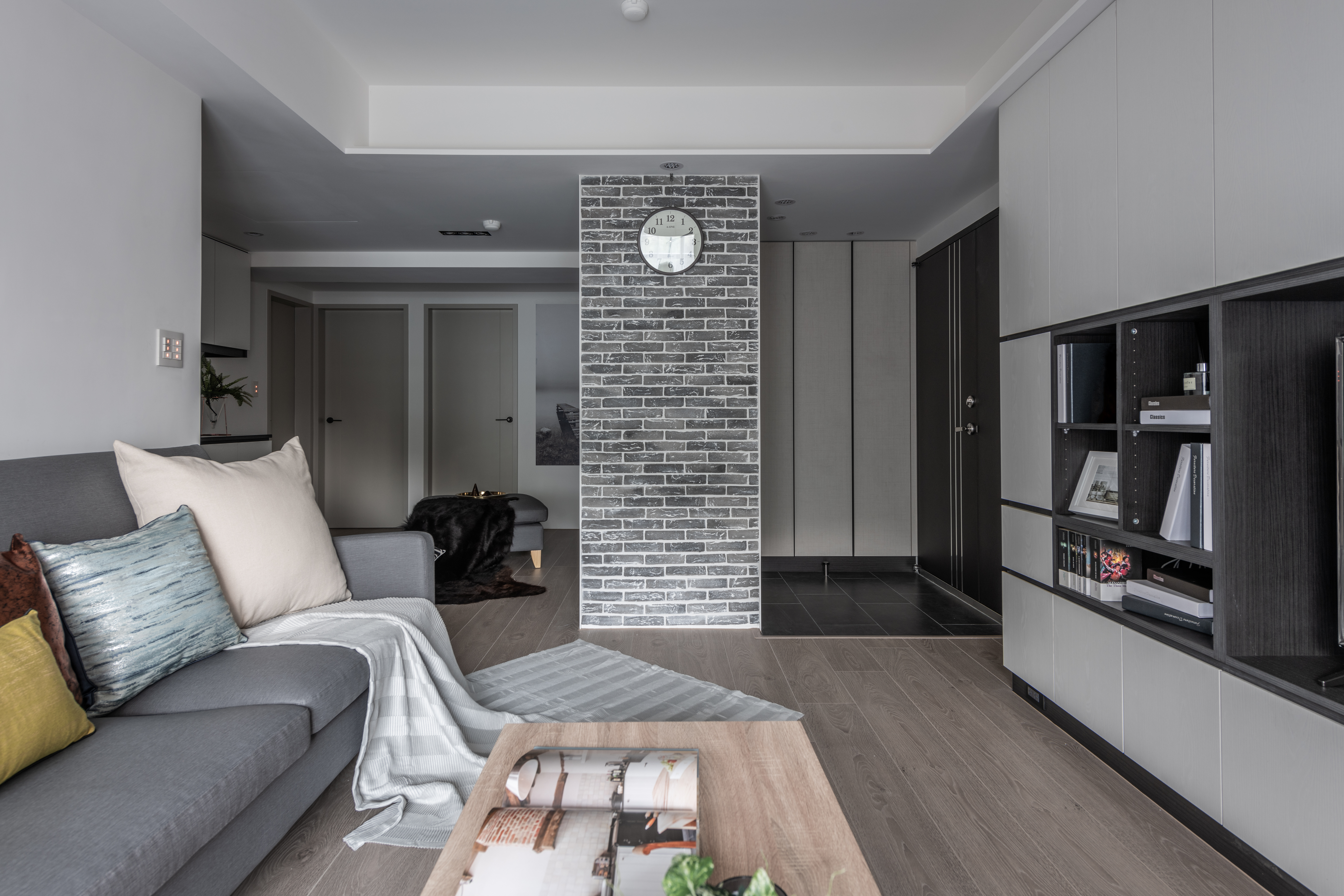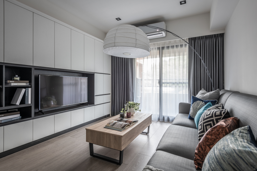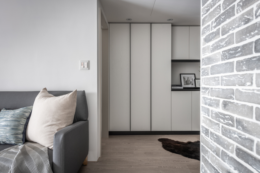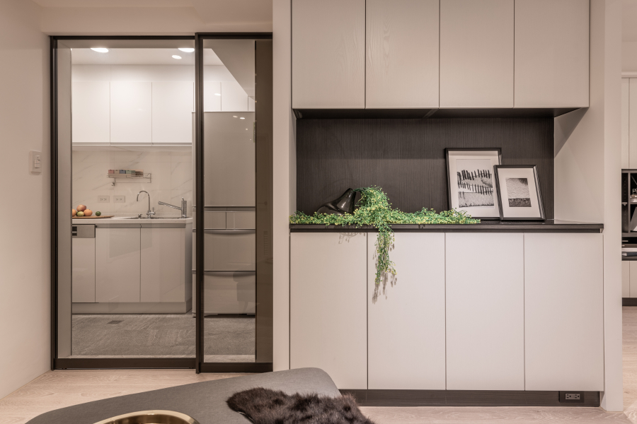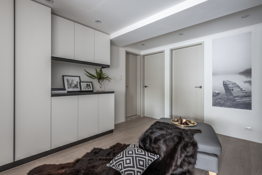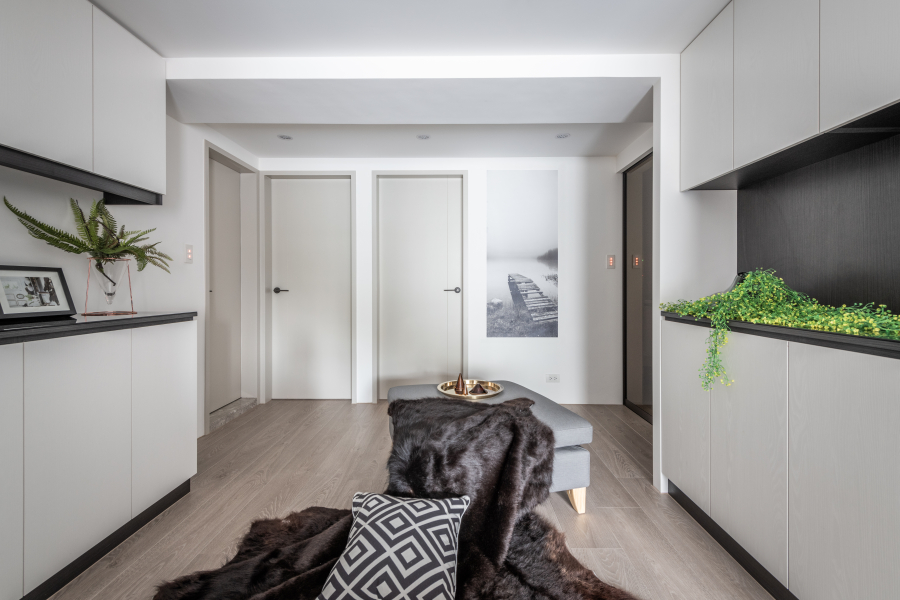 設計理念:嘗試在有限的空間內達到務實的大量收納及足夠的視覺留白,取得這兩者間平衡的關鍵在於用色及動線配置。善用本物件方位座向的優勢,把光線引導到最深處,同時也保有一定的隱私及明確的空間劃分。廚房及多功能過渡空間的曖昧關係使得該二空間使用時無壓迫之餘,更能保有良好的互動性。