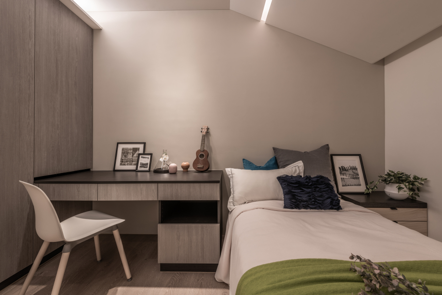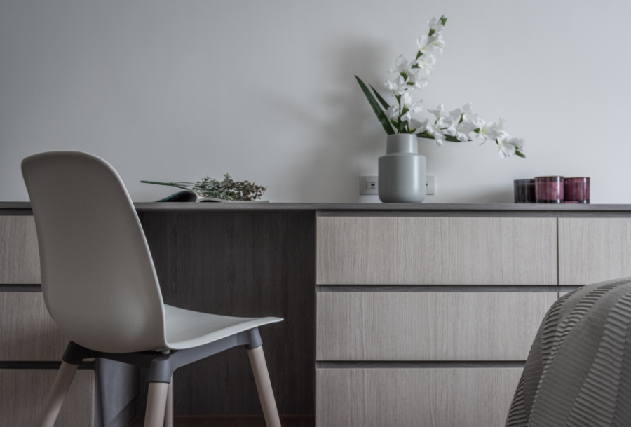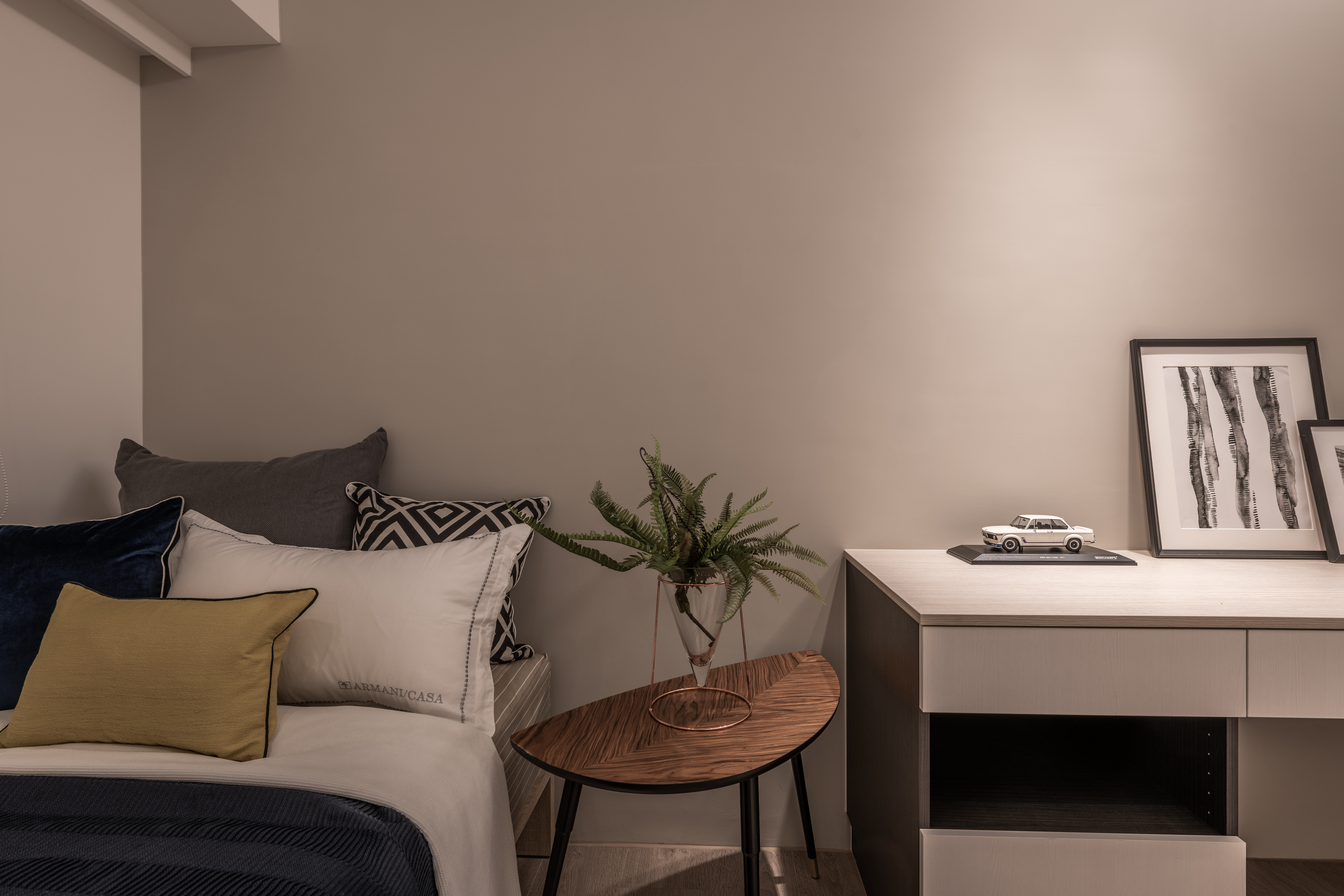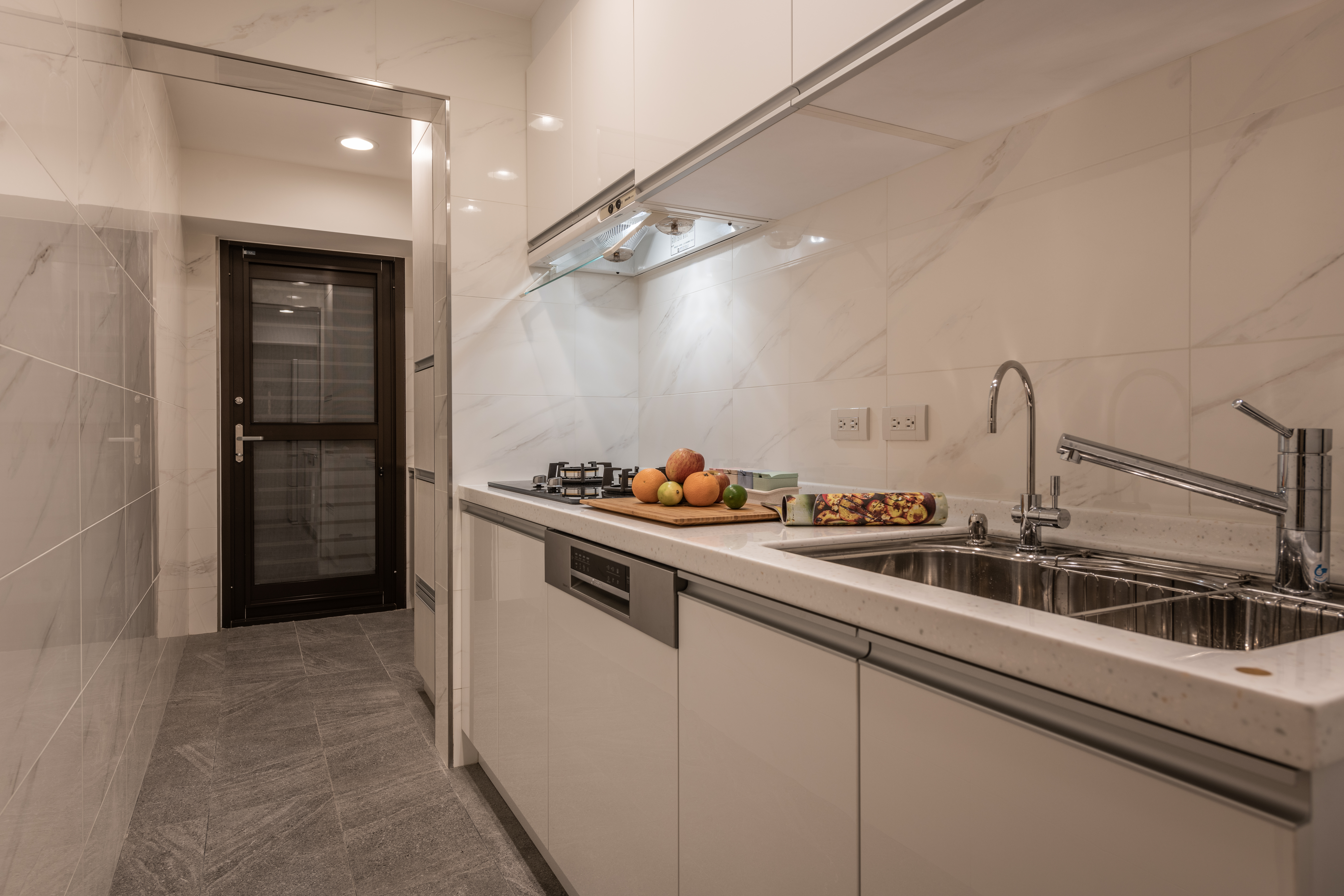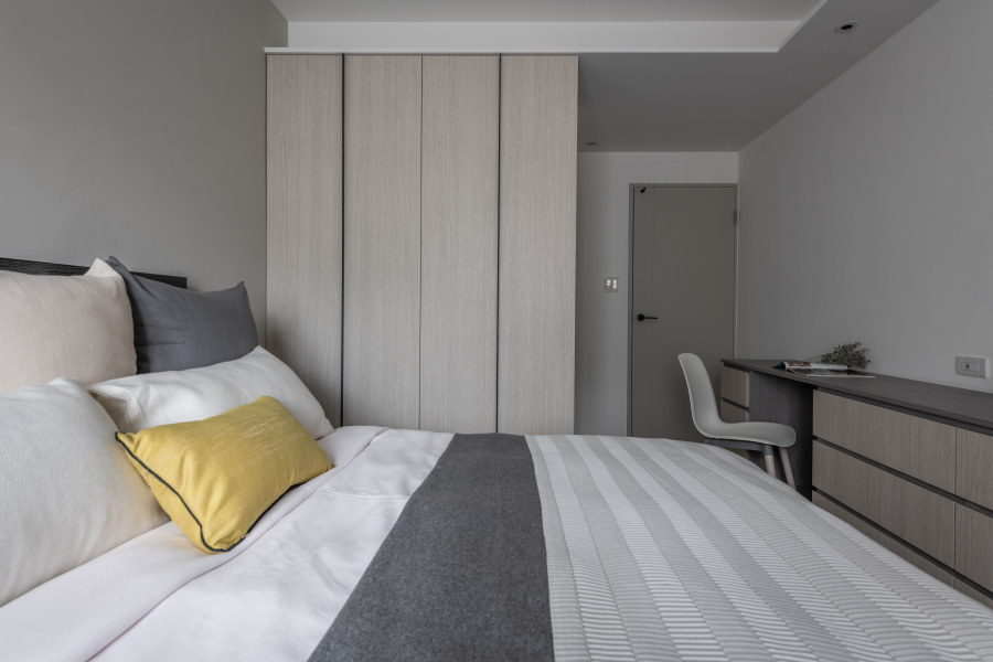 設計理念:嘗試在有限的空間內達到務實的大量收納及足夠的視覺留白,取得這兩者間平衡的關鍵在於用色及動線配置。善用本物件方位座向的優勢,把光線引導到最深處,同時也保有一定的隱私及明確的空間劃分。廚房及多功能過渡空間的曖昧關係使得該二空間使用時無壓迫之餘,更能保有良好的互動性。