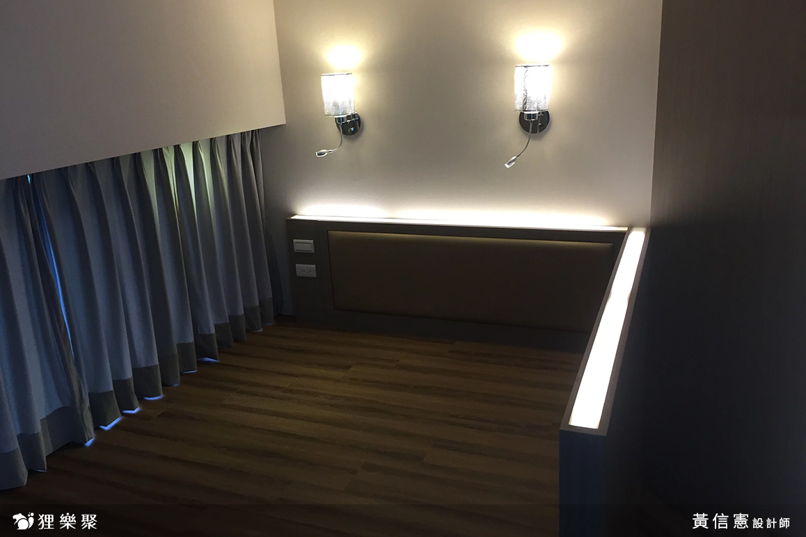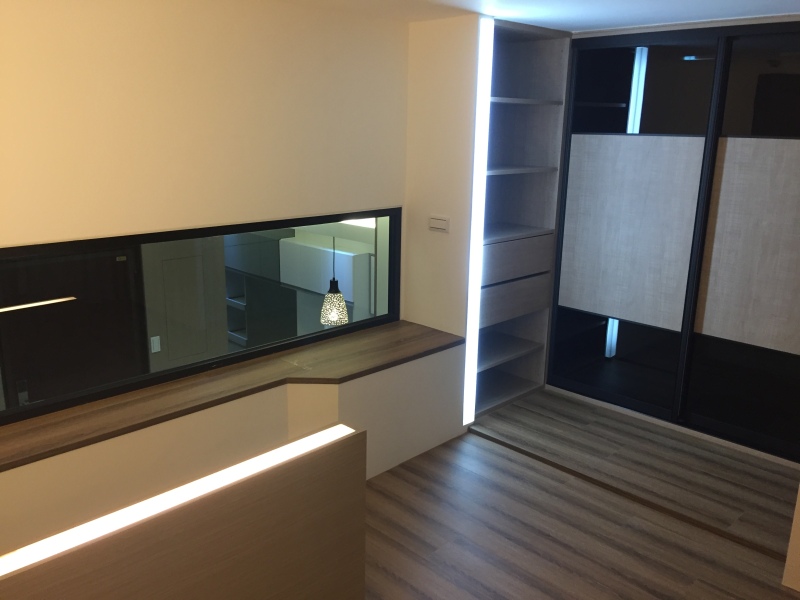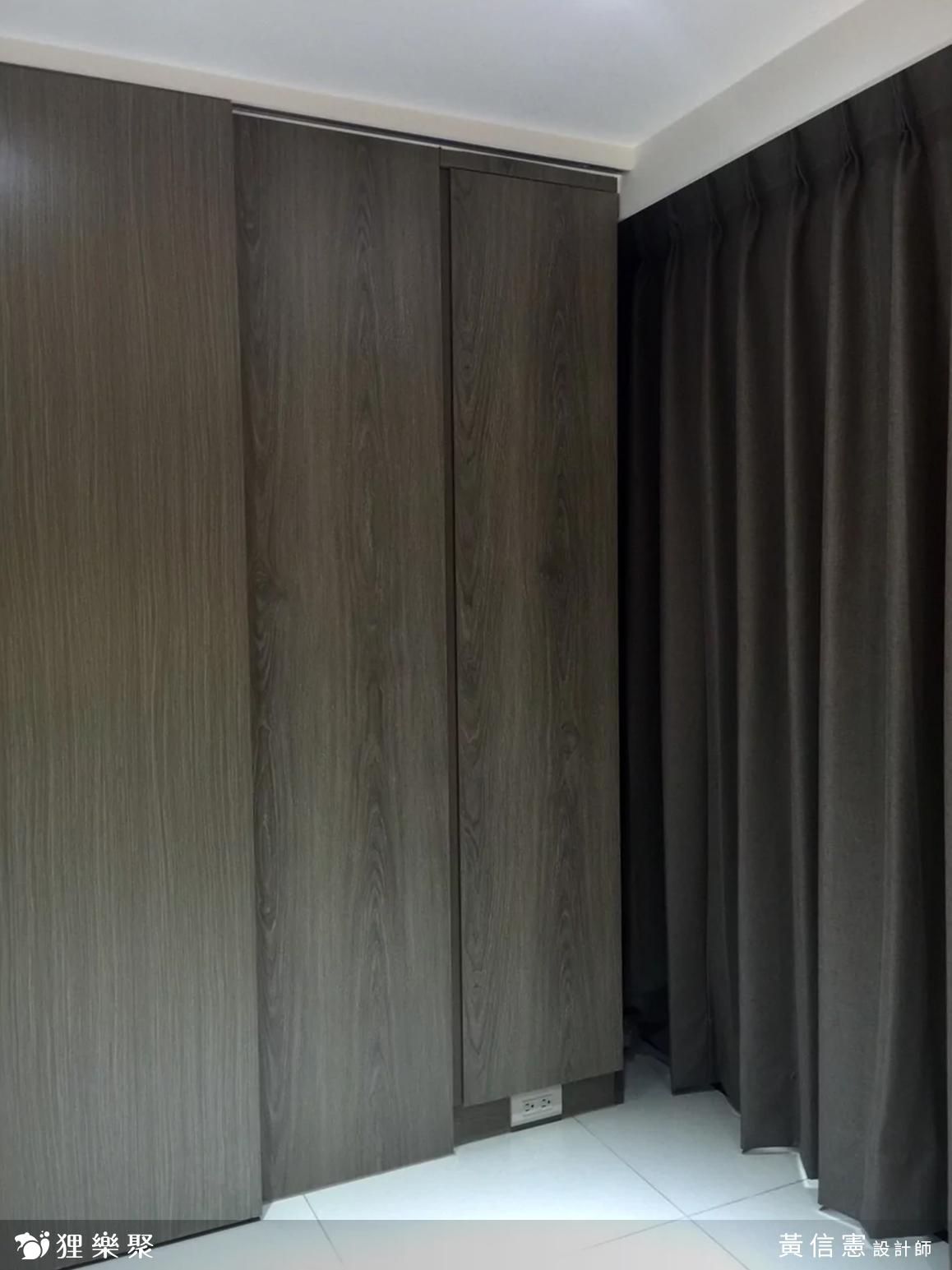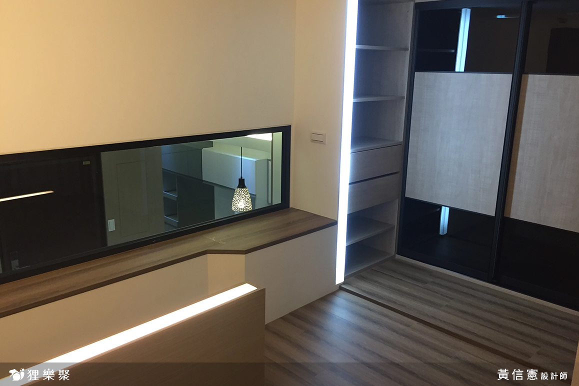 隨著階梯拾級而上為屋主睡眠休息的臥室空間,設計師透過直條紋的壁紙延伸視覺,化解整體壓迫感,也解決了二樓高度較低的問題,搭配沉穩的深木色地板與潔白牆面結合,構築出靜謐氛圍,搭配烤漆鐵建玻璃拉門延伸視野,創造充足的衣物收納,充分利用小宅的每一寸空間。