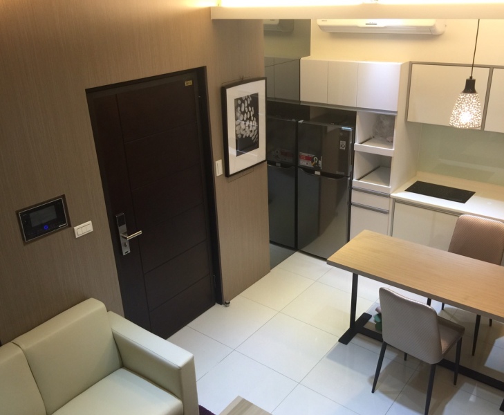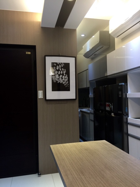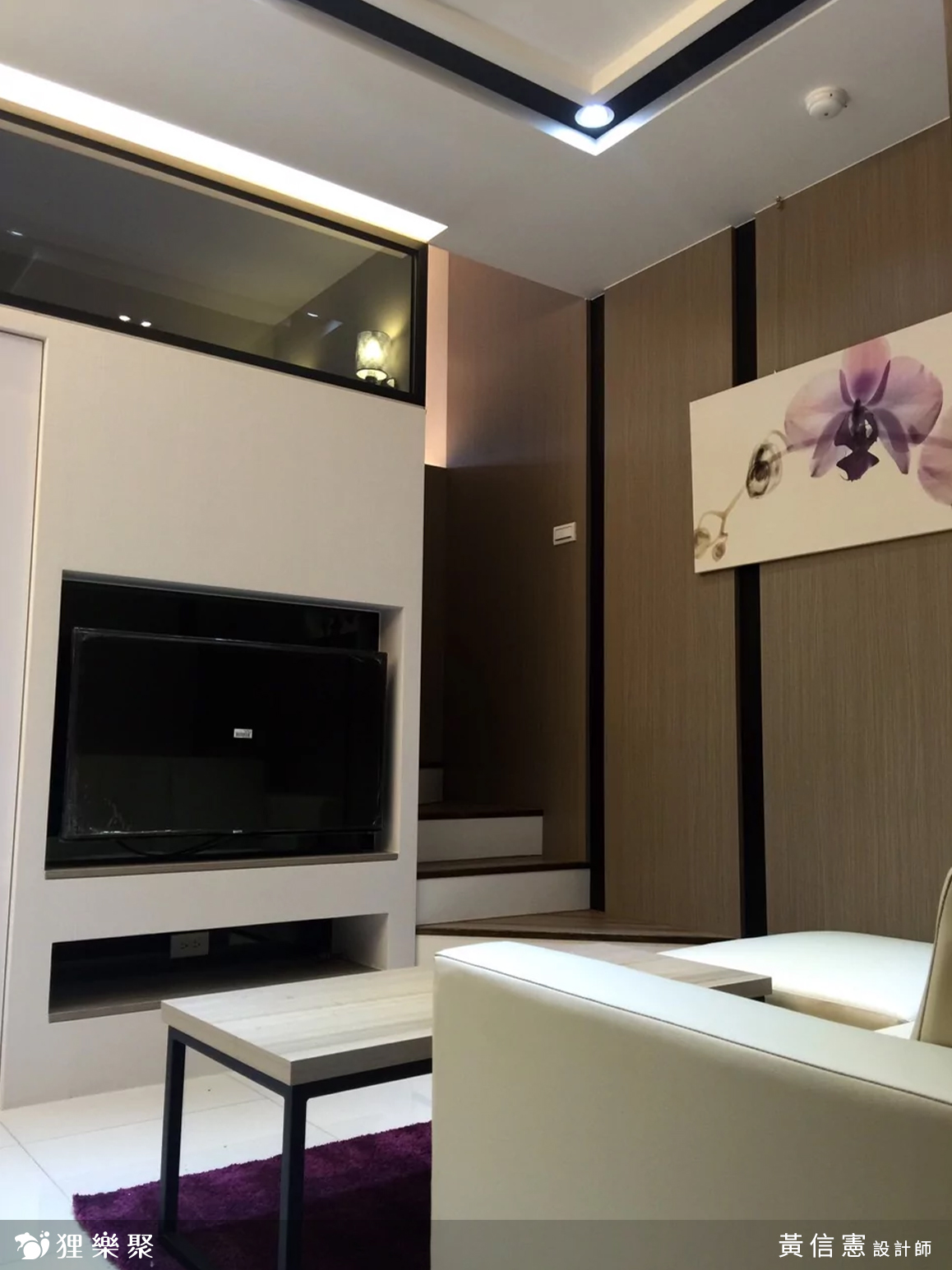 一樓為客廳、廚房和一間小房間,客廳以染白拋光木皮牆面、拋光地磚搭配電視牆頂部的玻璃元素,使空間感得以延伸,襯上訂製的白色皮質沙發、地毯共構出屋主簡潔且低調的沉著品味,讓整體空間更富層次。小房間則規劃為儲藏室,透過隱藏門設計使之融入居家,使視覺感一致且美觀。