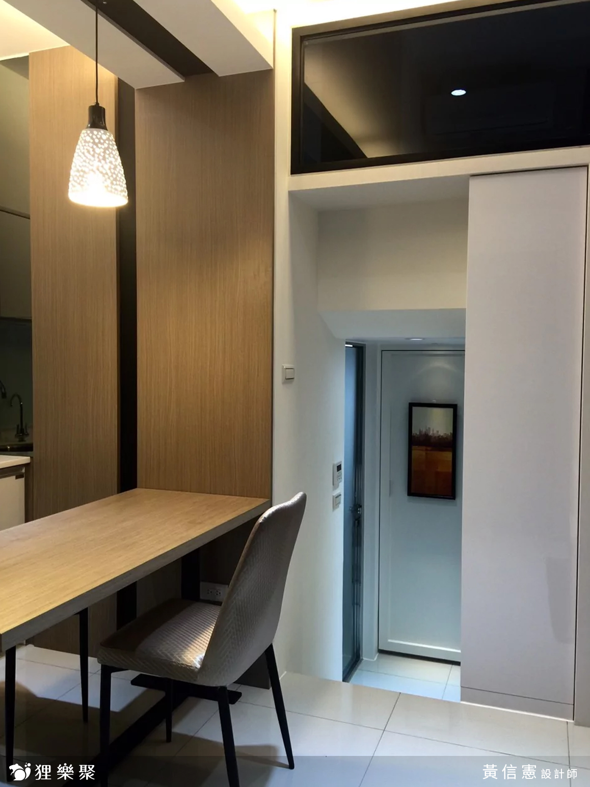 客餐廳為屋主生活的核心,設計師以染白拋光木皮牆面結合局部鏡面設計,運用反射效果放大空間,使視覺感更加通透,展現開闊質樸的氛圍,雖然坪數不大,三五好友相聚時也仍能保有寬敞舒適的空間感。