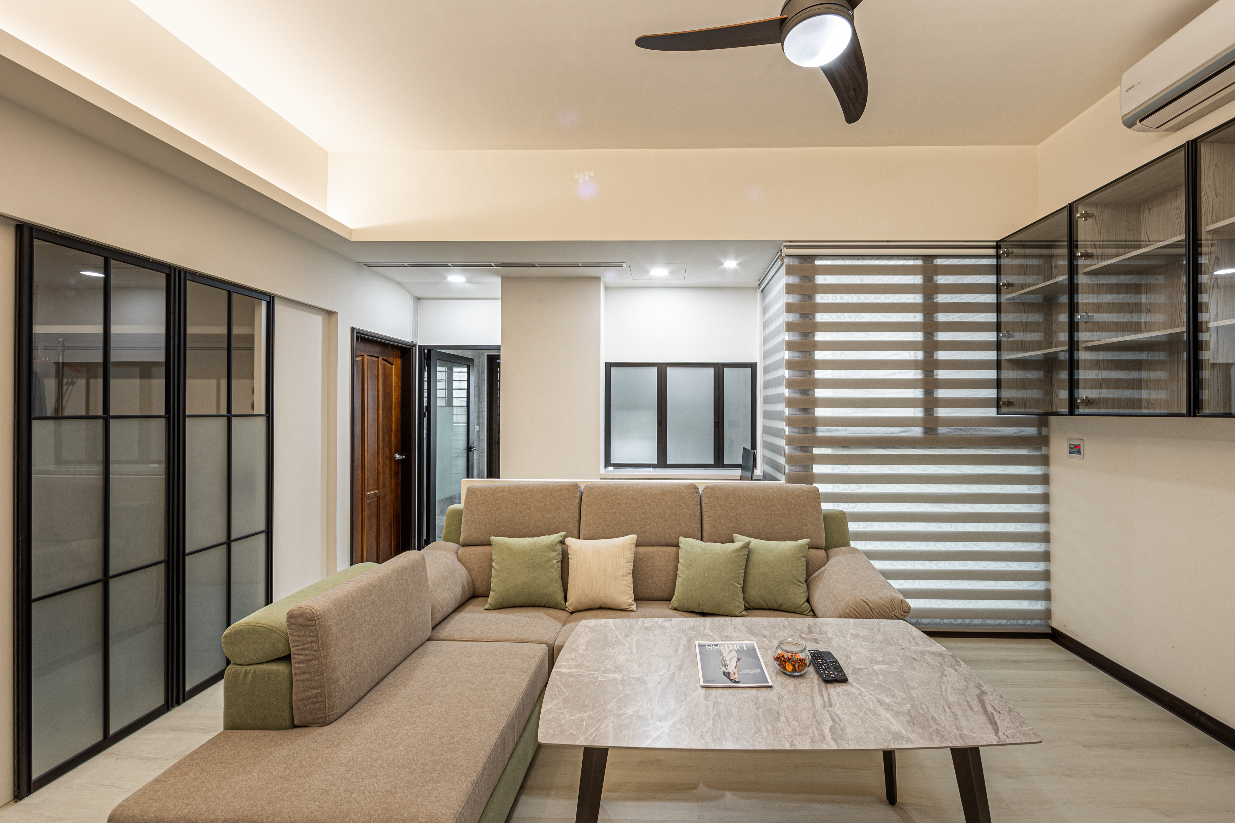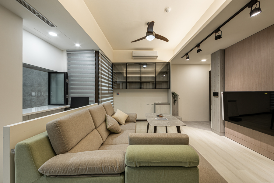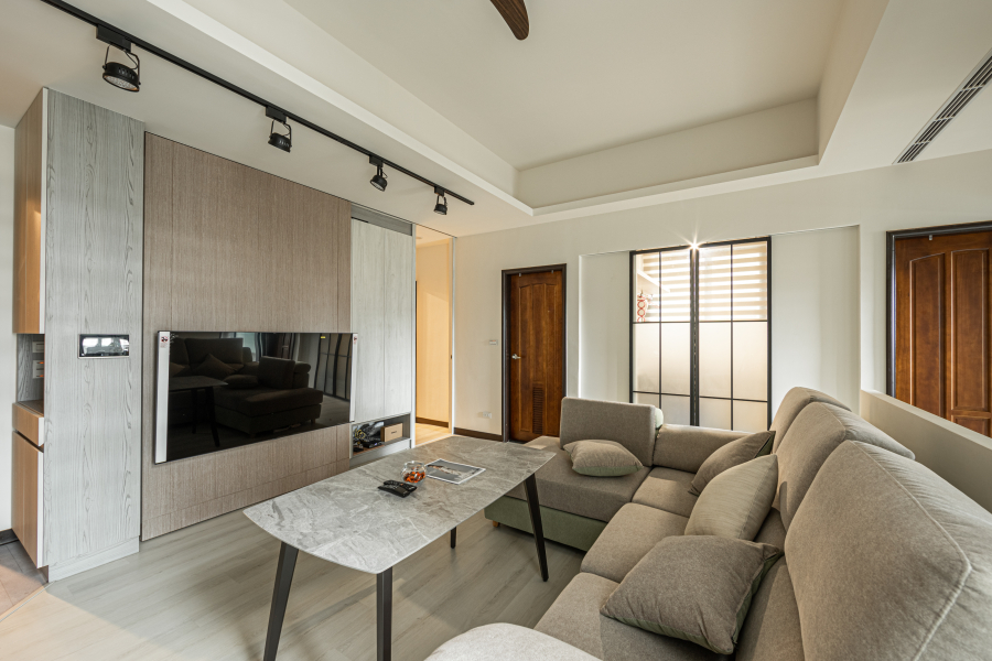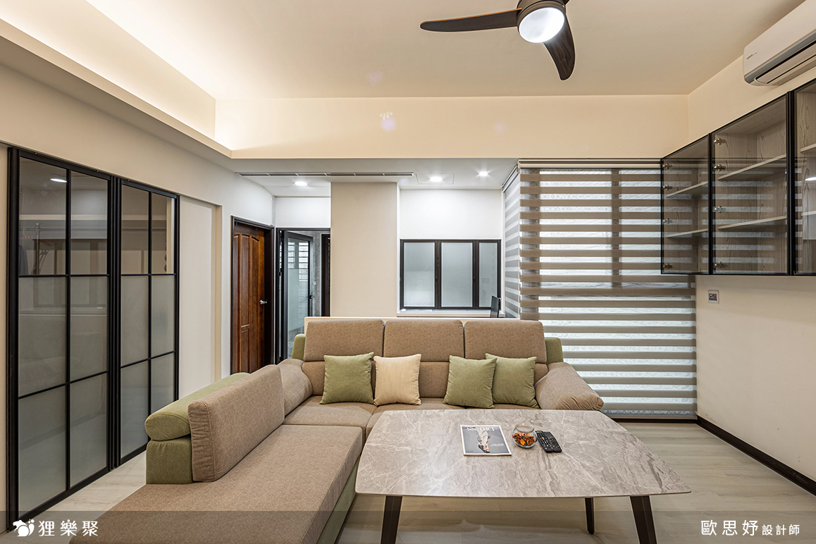 屋主夫妻喜歡採光好的空間,所以選擇了客廳有著大面積落地窗的屋型,良好的採光襯上暖白的空間色調、寬敞的L型沙發,讓人一進門就有明亮通透的空間感受,客廳區域採用防水的石塑超耐磨地板,阻絕地板返潮的問題,打造乾爽又透亮的北歐簡約宅。