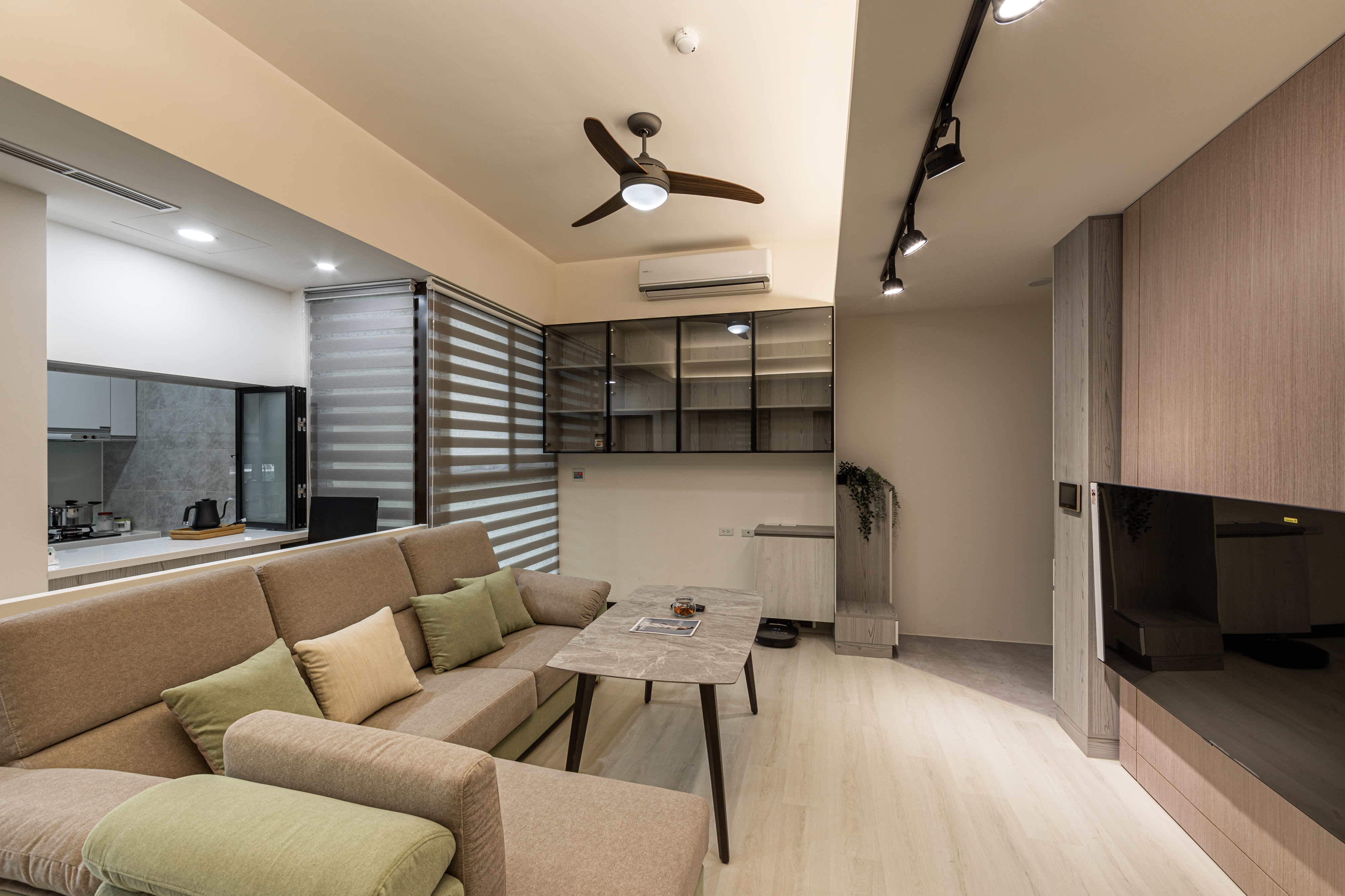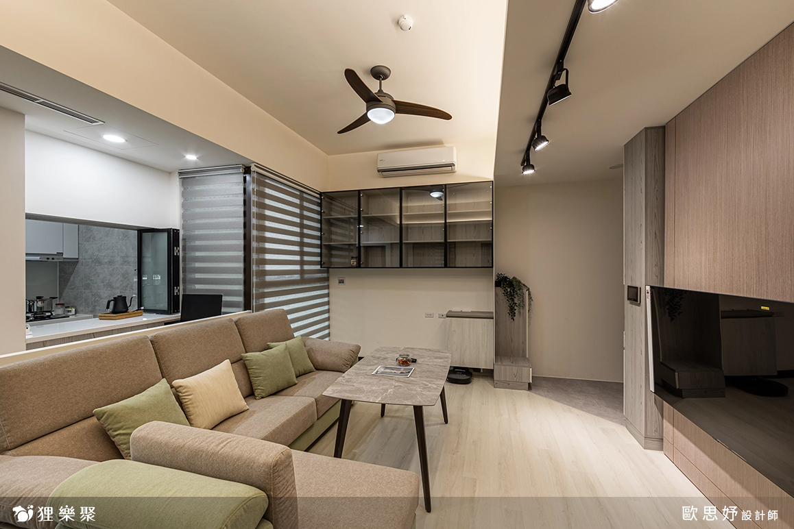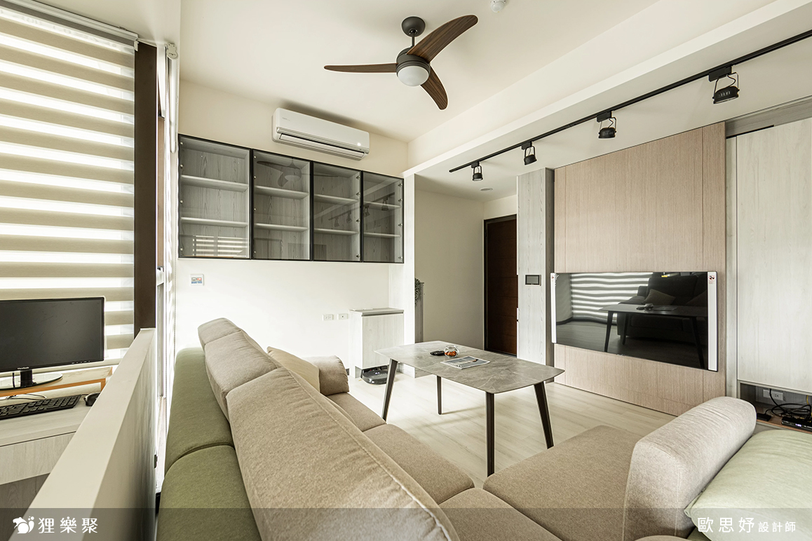 坪數不大,收納規劃更不能馬虎!設計師透過木質的滑門電視櫃設計,將儲物空間藏於無形,讓屋主方便拿取、收納,同時遮掩雜亂感,搭配一旁的白色機電櫃,方便擺放機上盒等所需電器,不僅使用上更加靈活,也使客廳充滿溫暖感。此外,客廳一側除了展示櫃體外,設計師還還在下方規劃了掃地機器人的家,不僅美觀,也滿足屋主的各項生活所需。