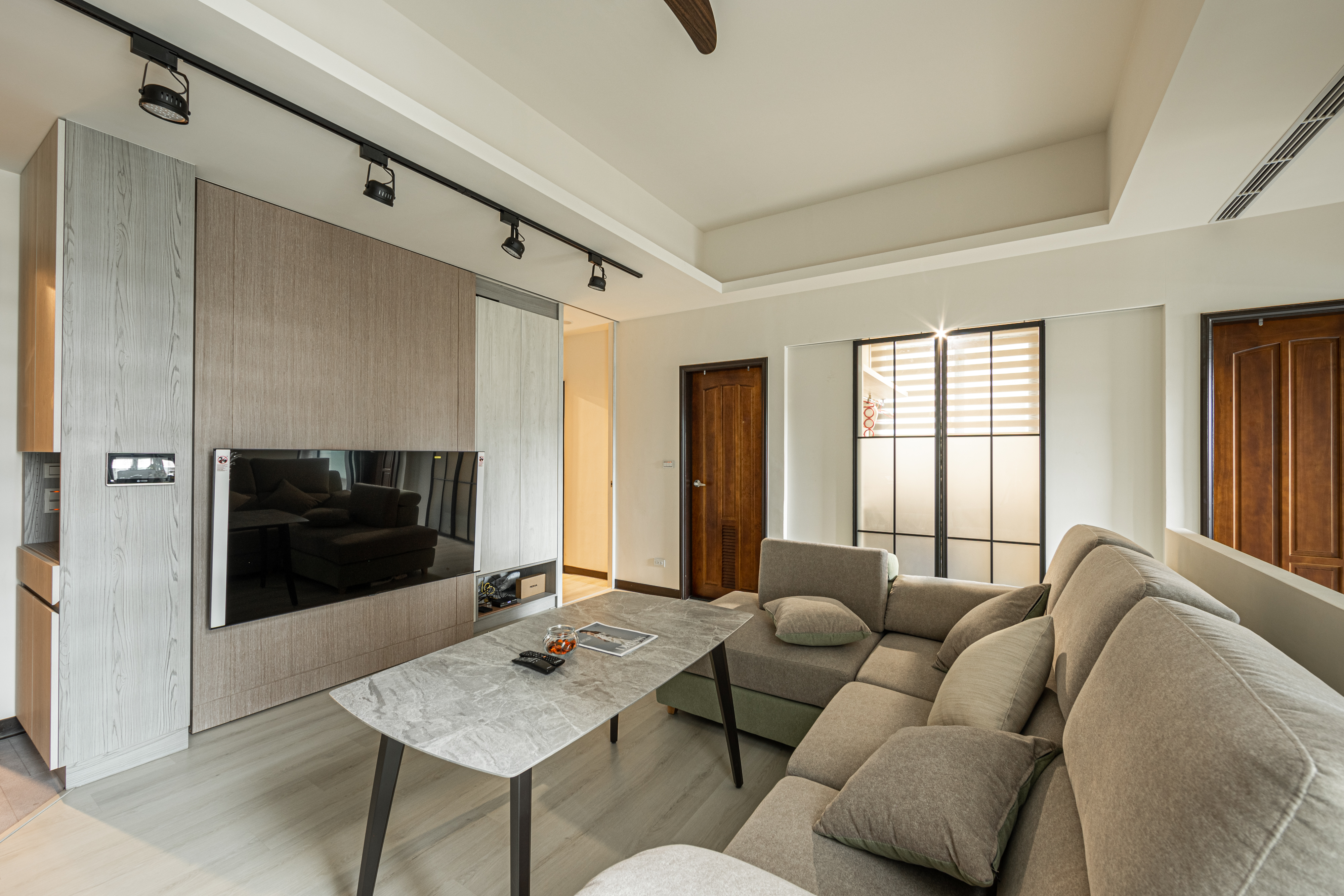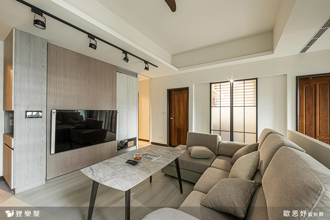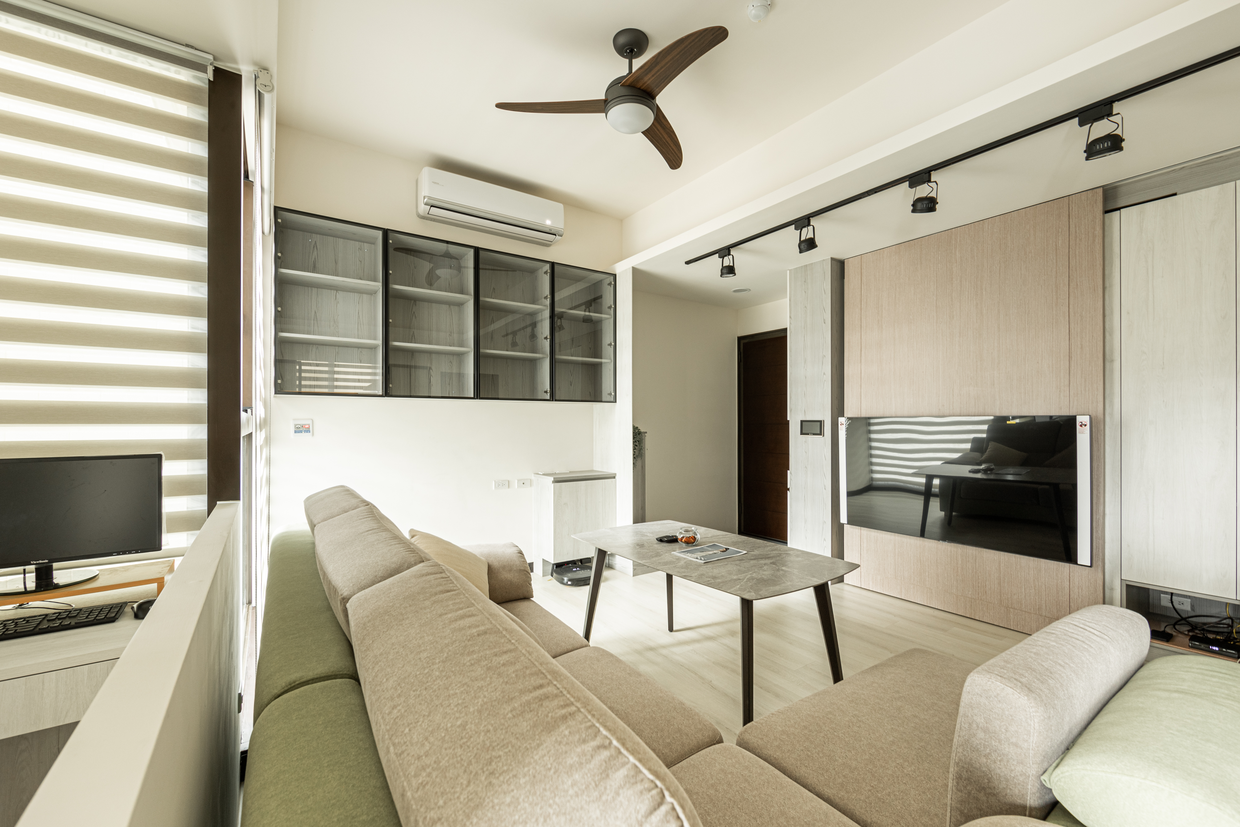 坪數不大,收納規劃更不能馬虎!設計師透過木質的滑門電視櫃設計,將儲物空間藏於無形,讓屋主方便拿取、收納,同時遮掩雜亂感,搭配一旁的白色機電櫃,方便擺放機上盒等所需電器,不僅使用上更加靈活,也使客廳充滿溫暖感。此外,客廳一側除了展示櫃體外,設計師還還在下方規劃了掃地機器人的家,不僅美觀,也滿足屋主的各項生活所需。