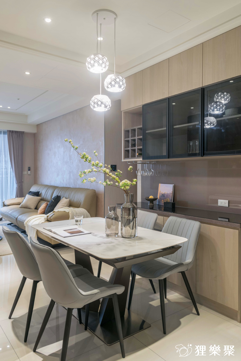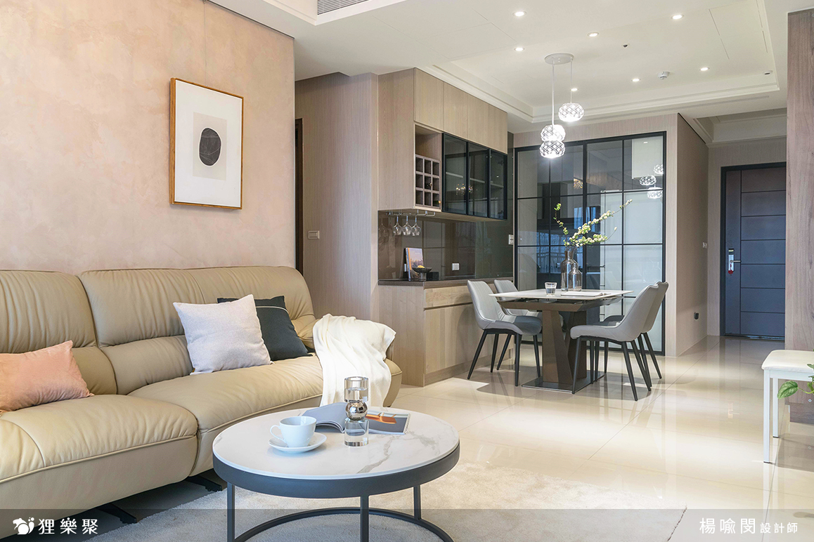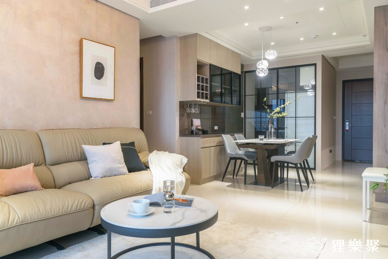近年來一直都很熱門的現代簡約風可以呈現出大氣質感的氛圍,搭配不同的燈光設計或軟裝,甚至能讓一個看似普通的三房兩廳如同小豪宅般擁有低調的奢華感。設計師在這個新成屋設計中捨去使用經典的黑白灰,而是透過溫暖的木紋色板材和線條俐落的黑色鋁框門,讓空間多一份家的溫馨感,卻又不失現代簡約風設計的沉穩和簡潔,客廳使用了白晶鑽大理石電視牆,晶透的光澤感和大面積的大理石帶來了磅礡的氣勢,為現代簡約風設計添上華麗的一筆。