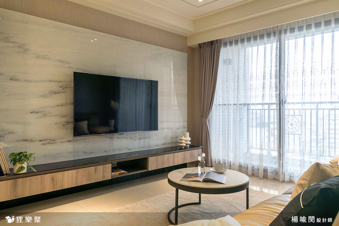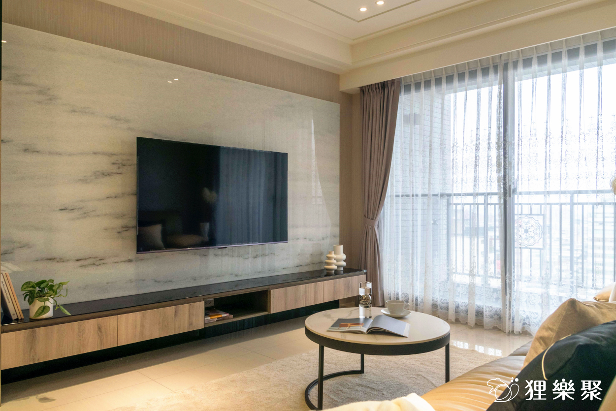 ▲ 客廳使用了白晶鑽大理石電視牆