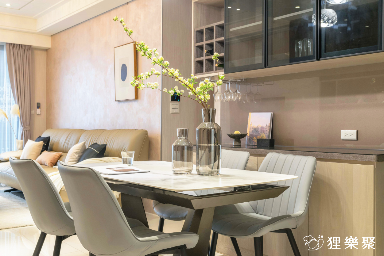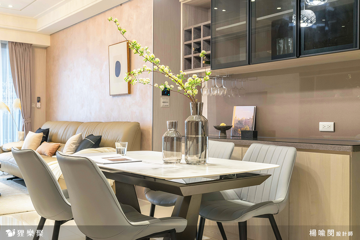 在牆面設計上使用了壁紙、油漆跳色、特殊塗料等等,豐富的色彩紋理讓每個空間都充滿不同的個性。要展現出小豪宅的氣勢,燈具絕對是不可或缺的一環!客廳及餐廳的主燈選擇了造型相當華麗的吊燈,並搭配小嵌燈做為輔助,臥室則以嵌燈和軌道燈為主,並在主臥的化妝桌輔以造型壁燈,營造出精緻、時尚的氛圍。