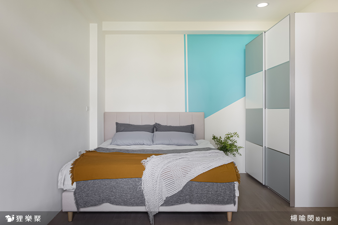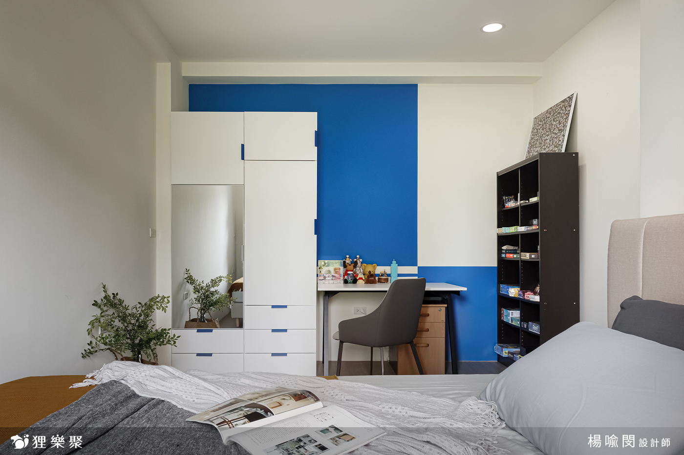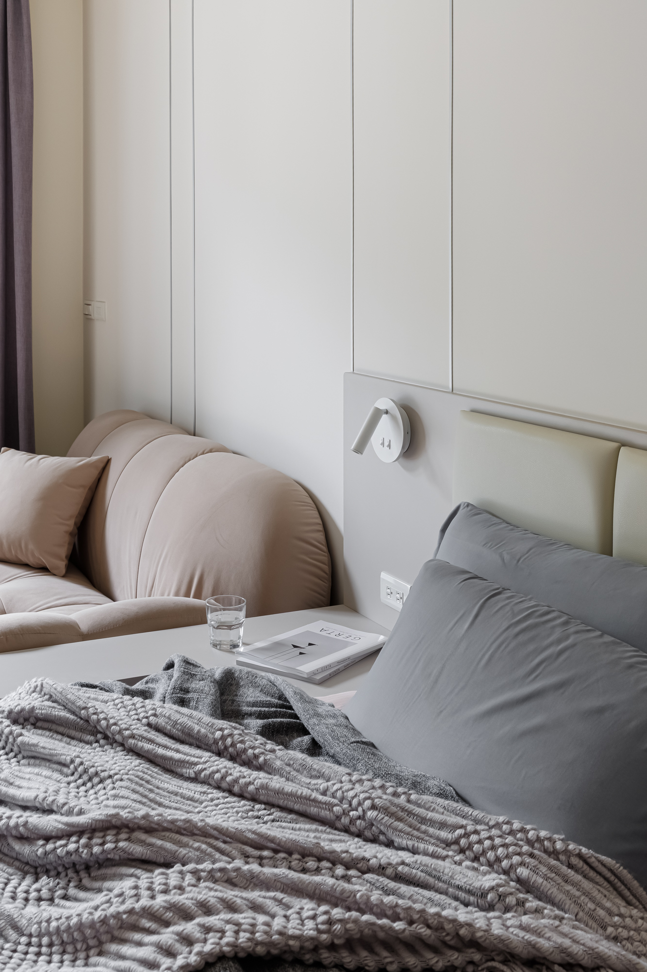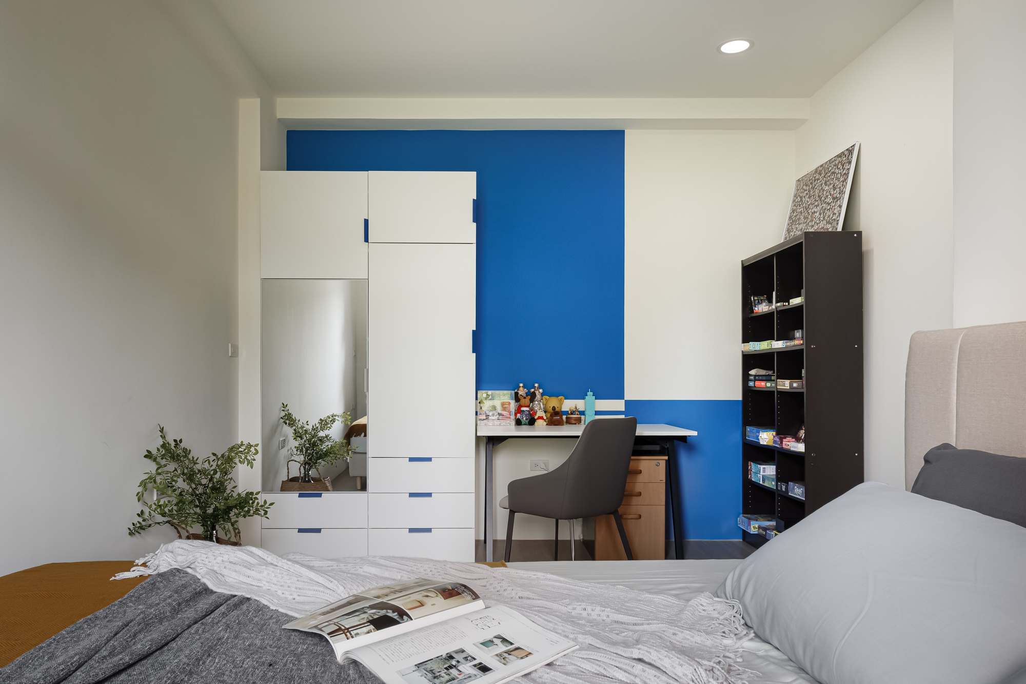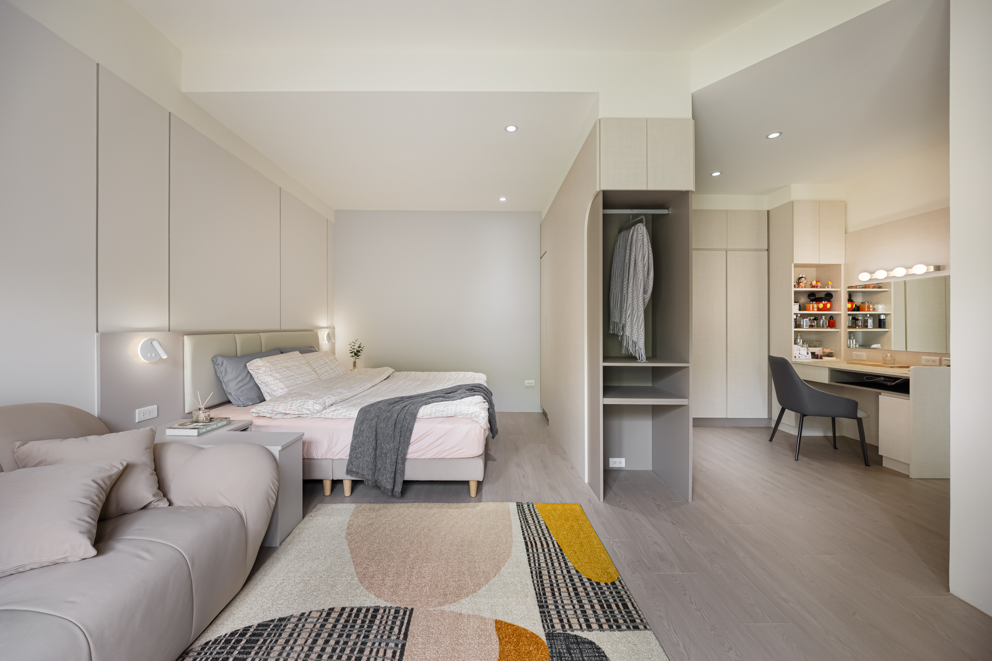 主臥室以奶油風為基調,搭配溫柔的燕麥色、弧形小沙發與輕盈家具鋪陳,襯上床頭兩盞暖光壁燈,使空間如包裹於雲朵般療癒,打造舒適的奶油北歐睡眠氛圍。男孩房以現代風格為主體,透過幾何造型跳色牆面,結合簡約現代感收納家具,展現充滿活力的年輕語彙,搭配北歐木質元素彰顯年輕人獨有的個性感與創造力。