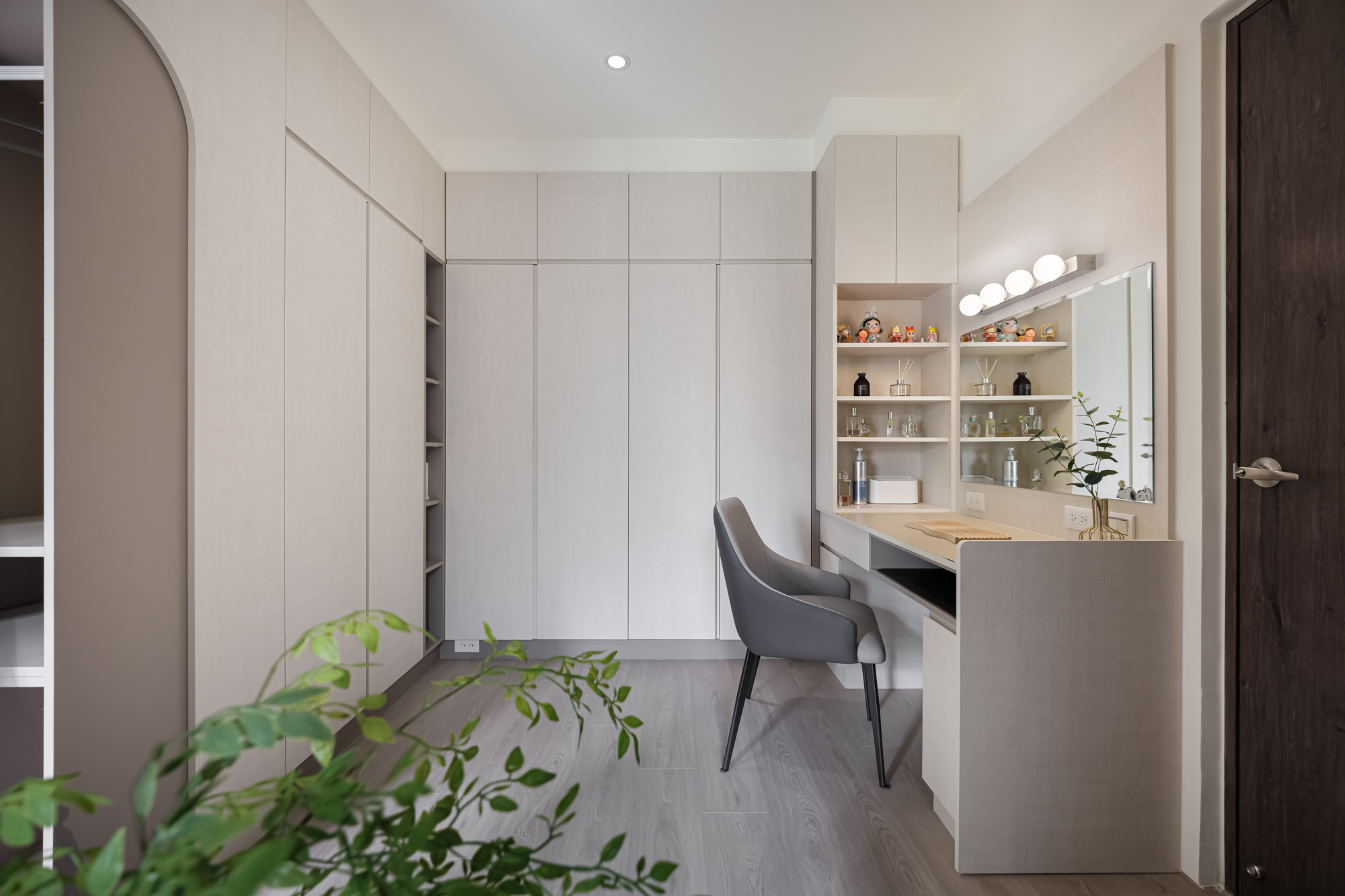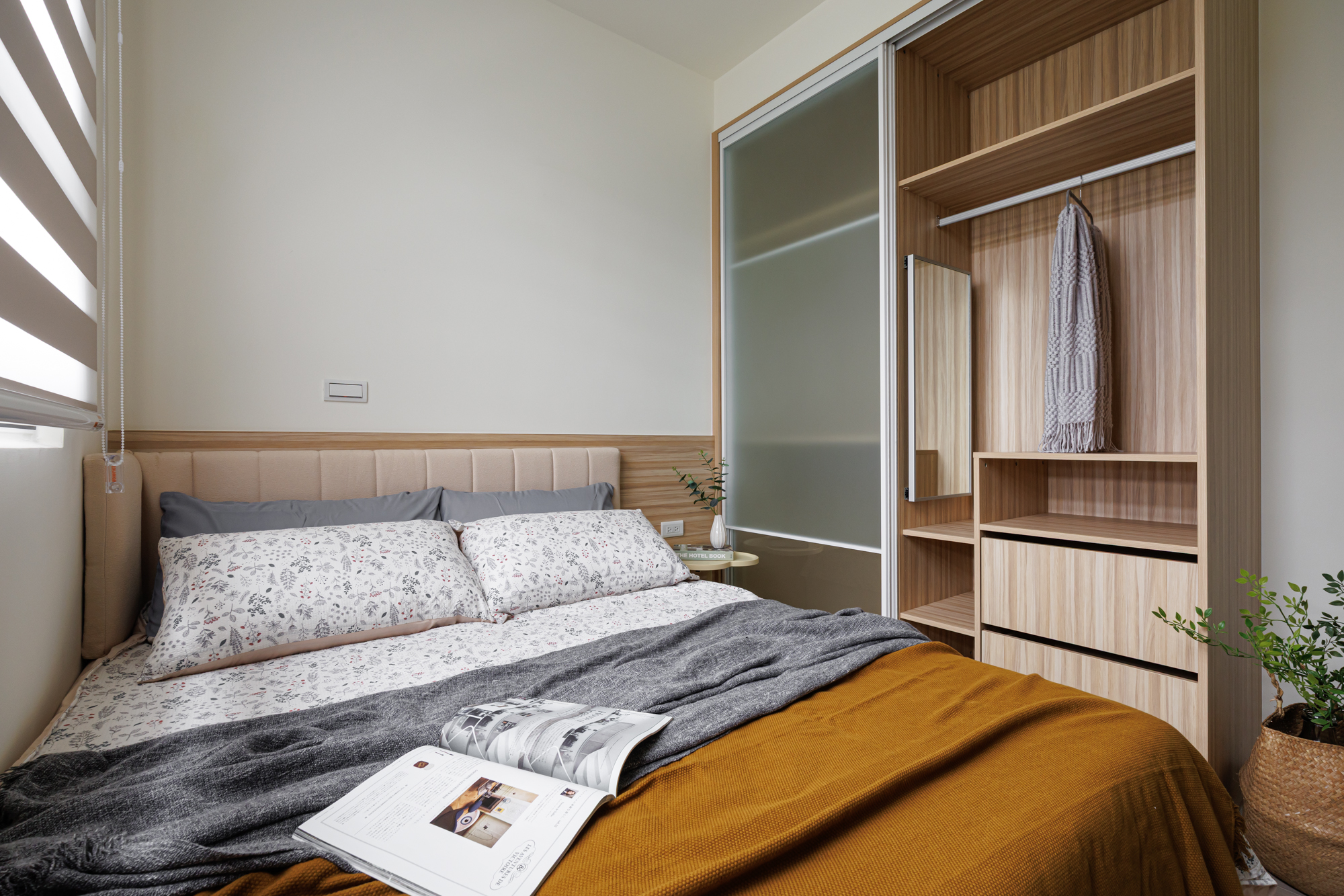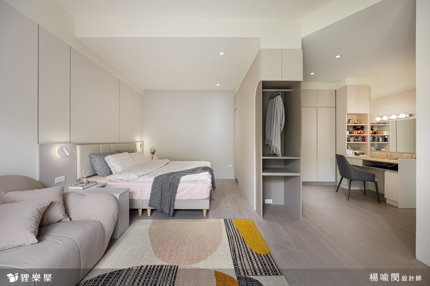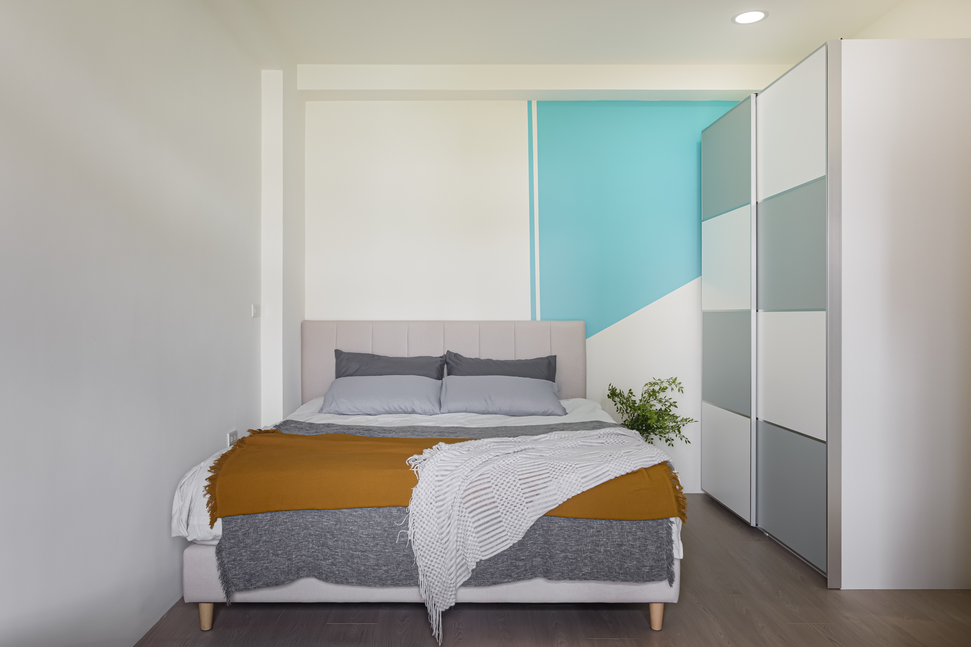 主臥室以奶油風為基調,搭配溫柔的燕麥色、弧形小沙發與輕盈家具鋪陳,襯上床頭兩盞暖光壁燈,使空間如包裹於雲朵般療癒,打造舒適的奶油北歐睡眠氛圍。男孩房以現代風格為主體,透過幾何造型跳色牆面,結合簡約現代感收納家具,展現充滿活力的年輕語彙,搭配北歐木質元素彰顯年輕人獨有的個性感與創造力。