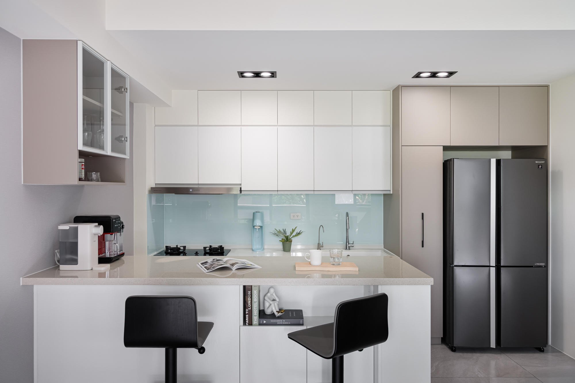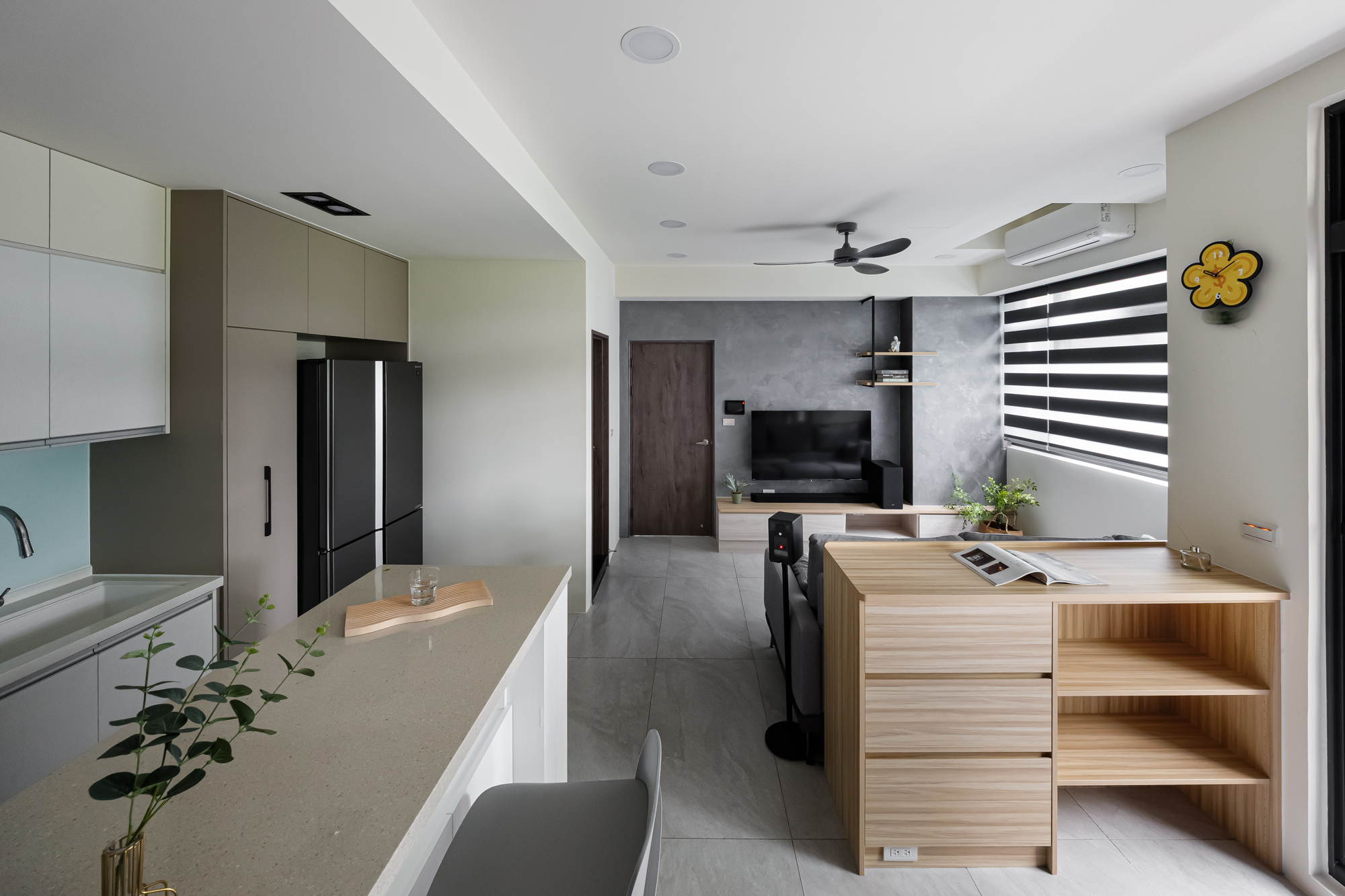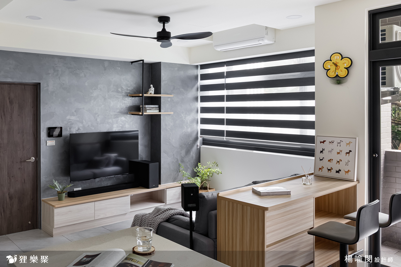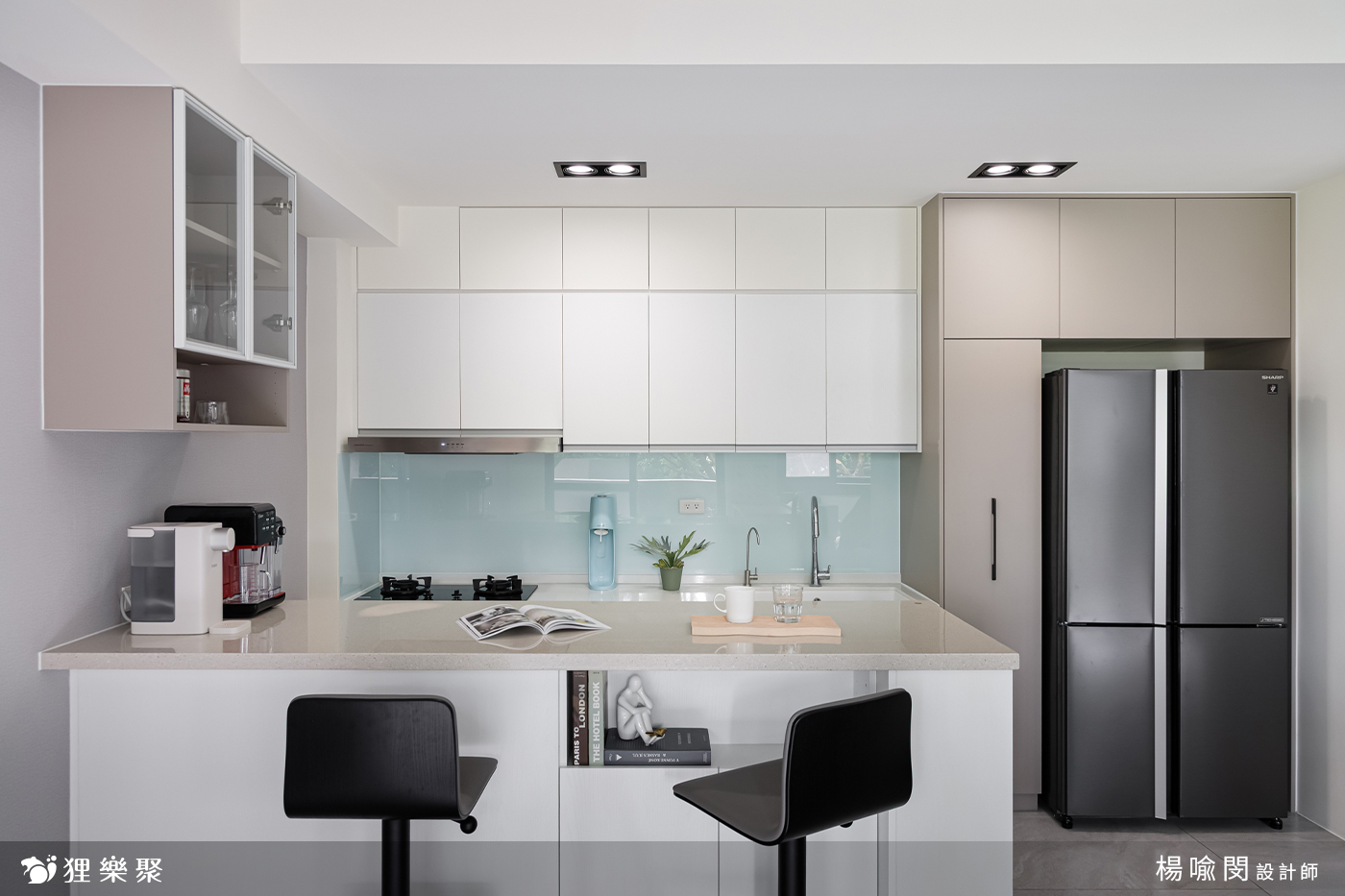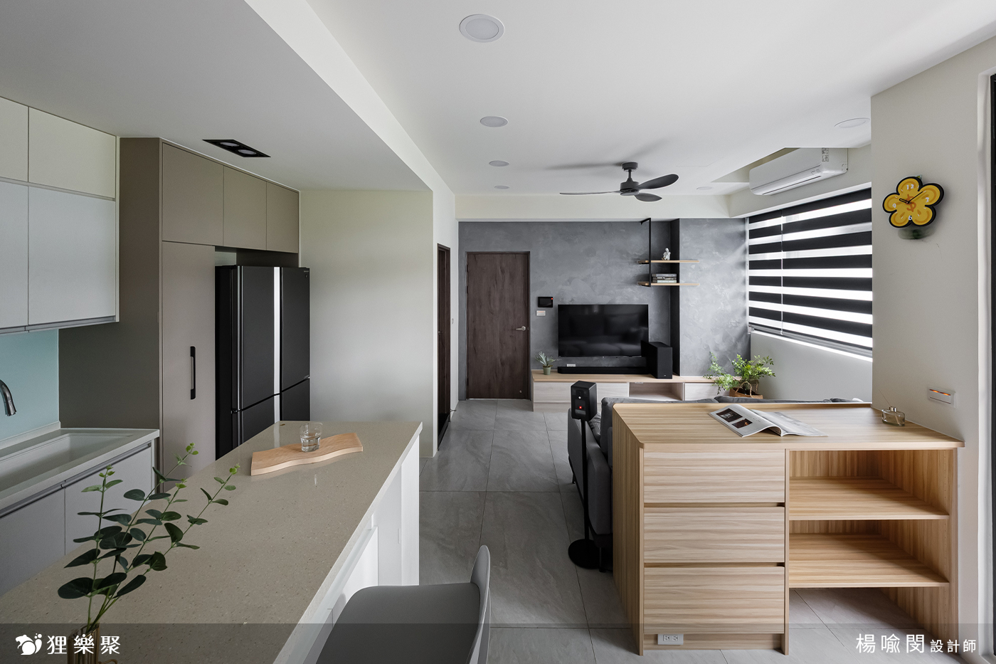 客廳以現代簡約為主軸,電視牆選用義大利金屬漆牆面展現低調感,融合北歐自然木材質櫃體妝點,營造溫馨且俐落的氛圍。中島餐廚區以白色、米色搭配,呈現簡約耐看的空間表情,若親友來訪也能在此自在相聚、下廚談天,以質感與實用共塑家人情感核心,圍塑明亮且質感的公領域空間。