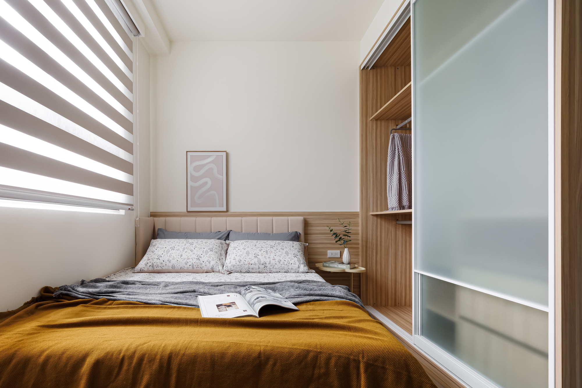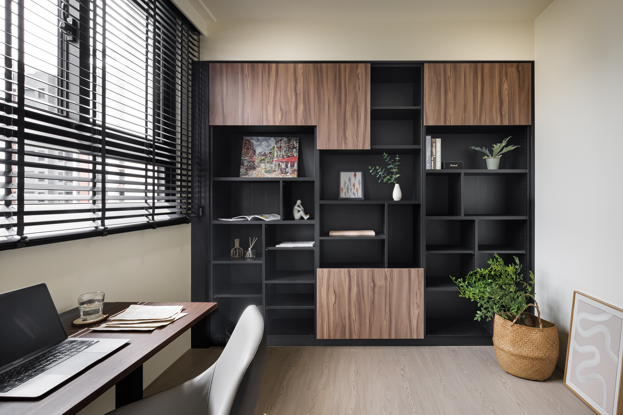 孝親房以日式風為主調,透過細緻的淺木色調、極簡線條與大面積留白,展現自然的寧靜氛圍,使長輩享有安定、溫和的休憩環境。書房則選用胡桃木材質櫃體,搭配深色木百葉,使得空間幽靜且有層次感,營造沉穩氛圍,是沉澱思緒、靜心閱讀的最佳場域。