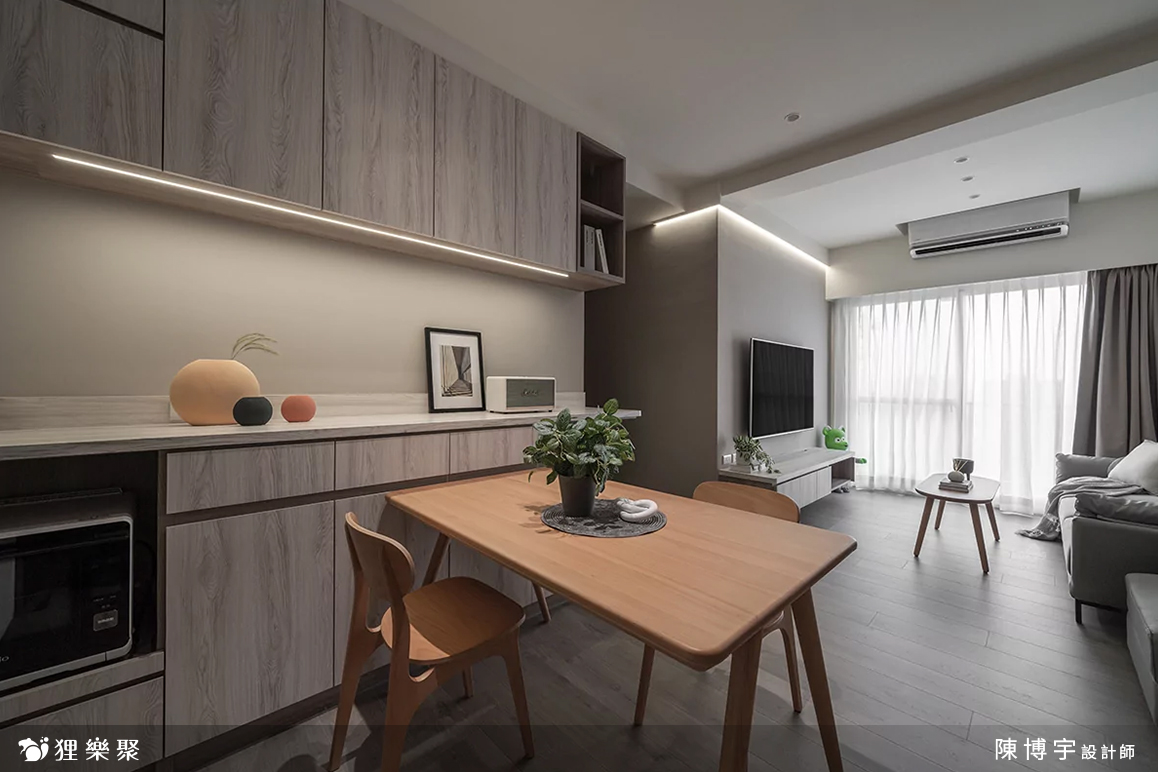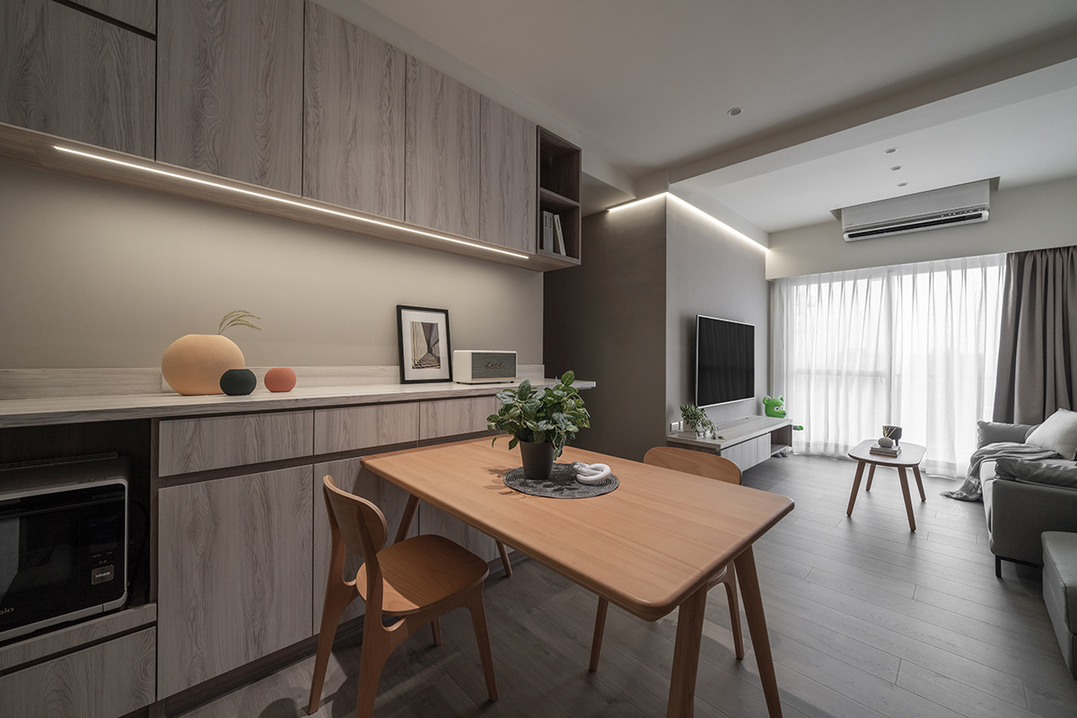 空間照明基本上以嵌燈為主,而在餐邊櫃的吊櫃下方增添鋁槽燈,營造溫馨的氣氛之餘,也讓放置在餐邊櫃的物品能夠看得更清楚、更方便使用;電視牆連接走廊上方的部分則使用了洗牆燈,成為這個日式簡約風裝潢的一個小亮點。