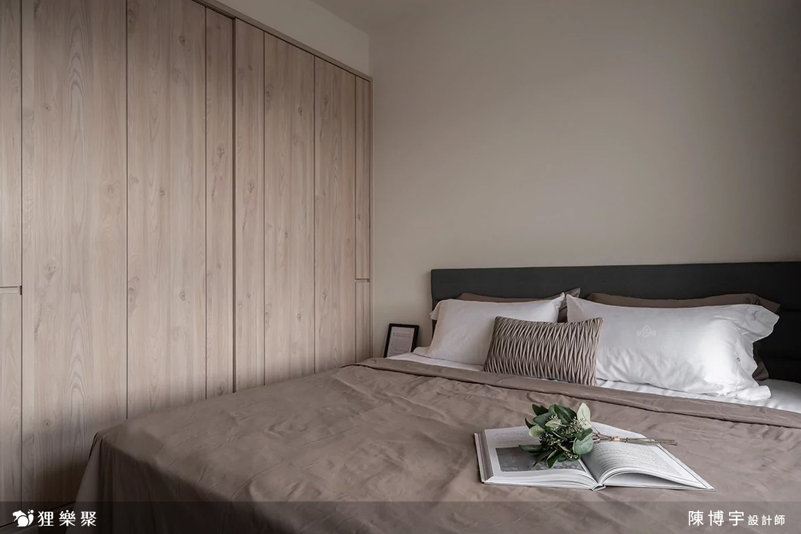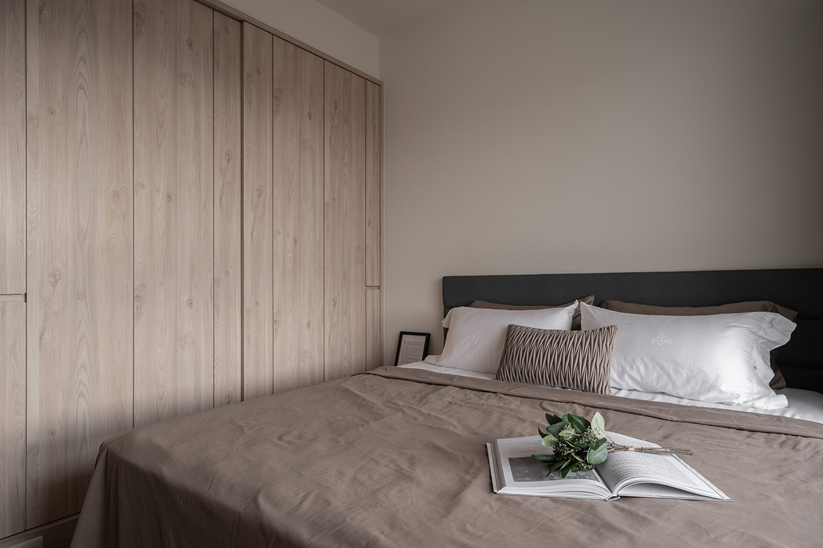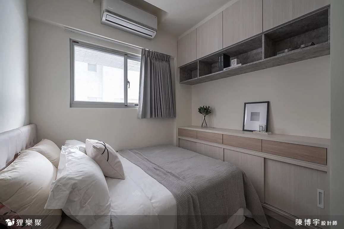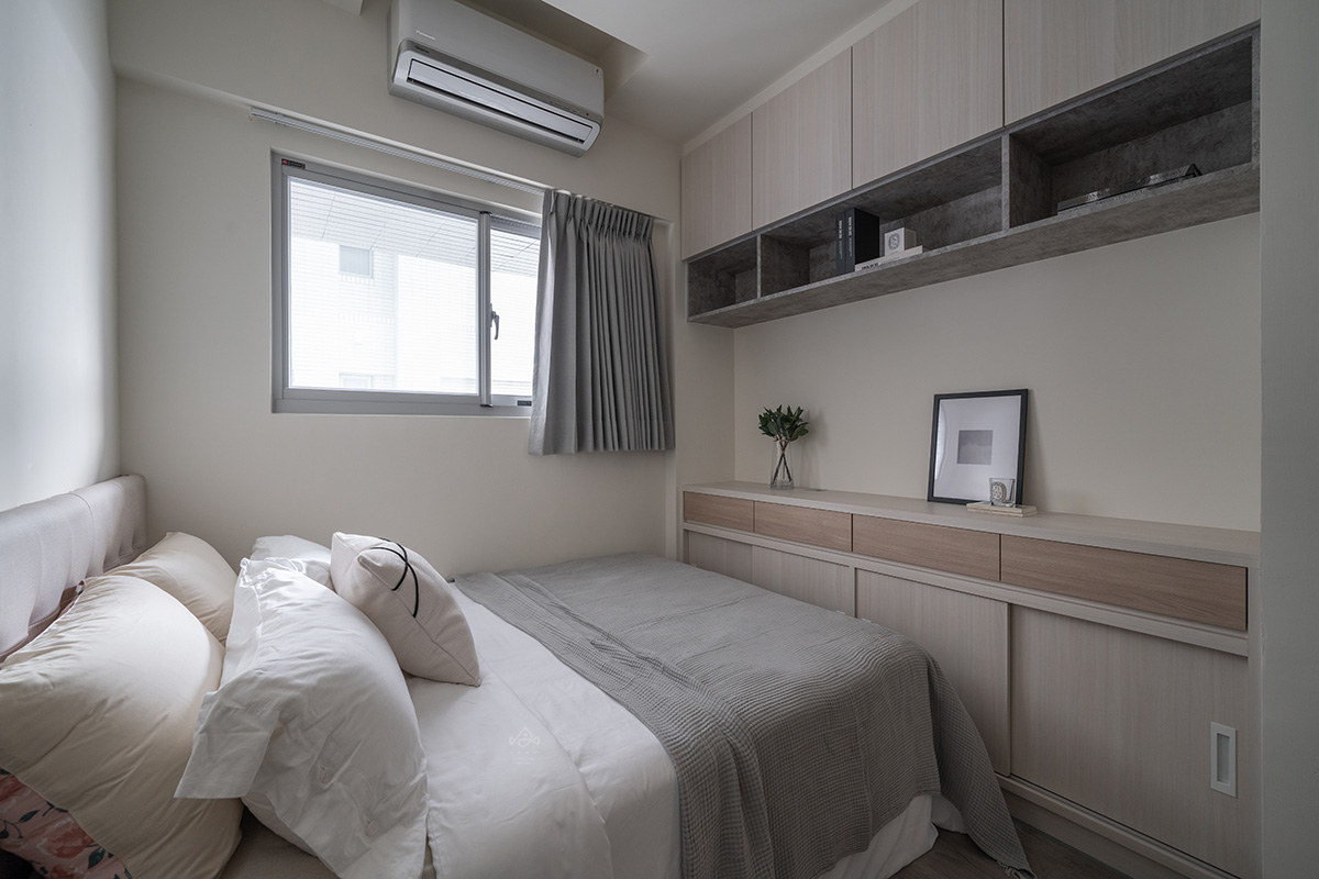 這個日式簡約風裝潢設計最需費心的部分在於收納空間的規劃,由於坪數偏小,睡床放進去就已占掉大部分的空間,但生活中仍然需要收納櫃來分類擺放雜物,所以主臥及次臥皆規劃了推拉門設計的衣櫃、收納櫃,避免對開門片在打開時撞到其餘家具,造成打不開的問題,而次臥也利用吊櫃和矮櫃的形式,減輕櫃體帶來的壓迫感,是一個實用與美觀並具的日式簡約風裝潢設計。
