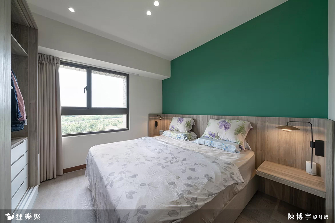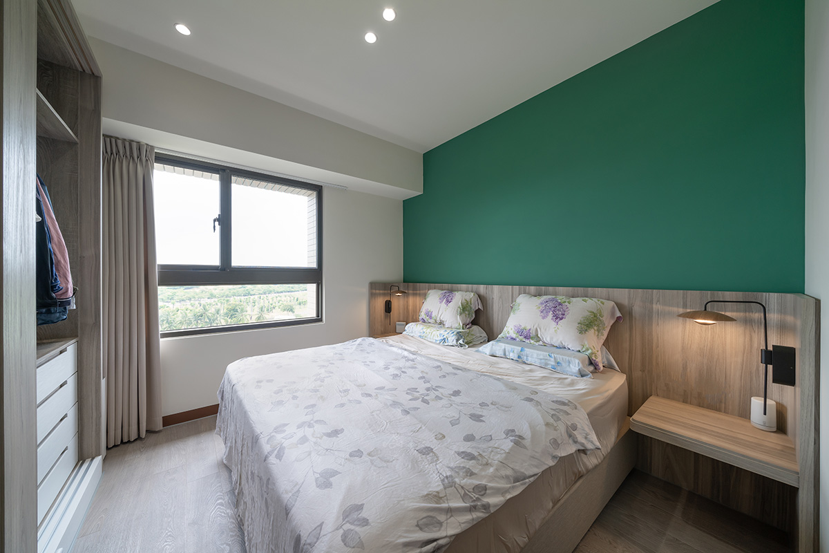 主臥室的床頭板上方使用了牆面跳色,主牆的顏色除了能夠展現出屋主的性格,飽和的綠和木紋色也相當搭配,每天回房看到喜愛的顏色都能產生滿滿的正能量,充飽電後再迎接新的一天!