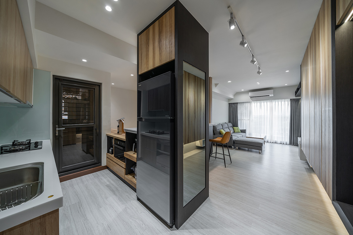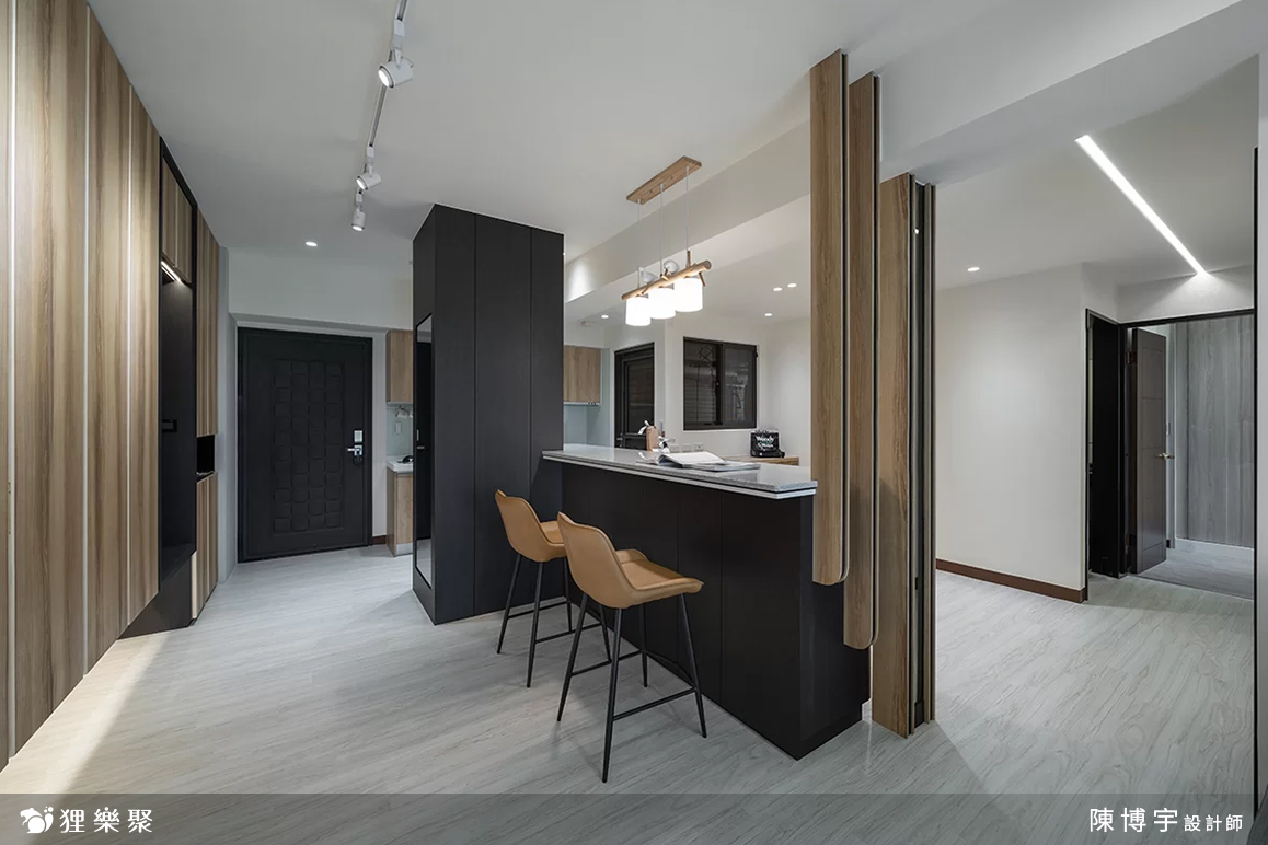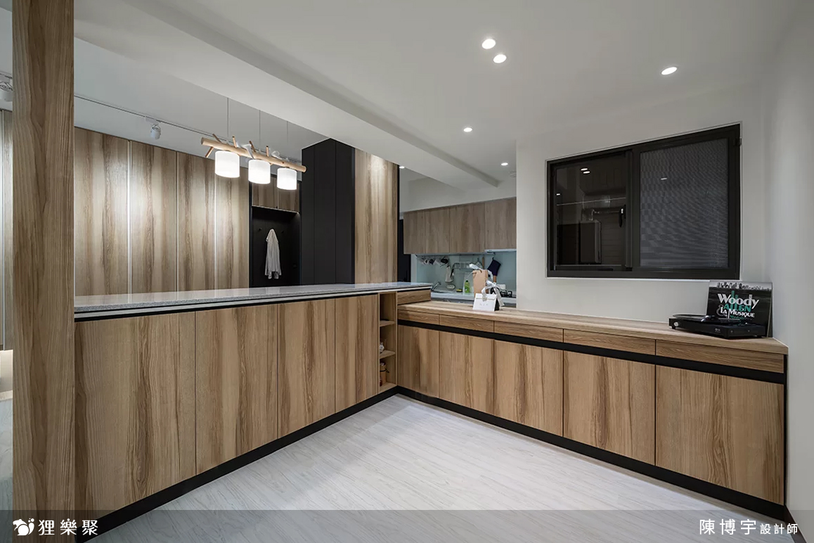 在空間佈局方面,進門後從玄關做一排鞋櫃、穿鞋椅(後方還可以再吊掛衣服、帽子)和收納櫃,頂天的櫃子固定在牆上,下方鏤空的形式在視覺感受上會更加輕盈,也省去蹲下才能拿取物品的力氣;而廚房設計為開放式,流理臺的對向規劃了電器櫃和冰箱櫃,後方再連接中島餐桌,動線順暢、使用上也相當順手;另外,設計師將三房中位於餐廳的後方的房間牆打除,變成開放空間後讓公共區域的視覺效果更加寬闊,平時屋主可以在這裡運動,如果家中有客人來訪過夜,鋪上床墊就能做為客房使用。