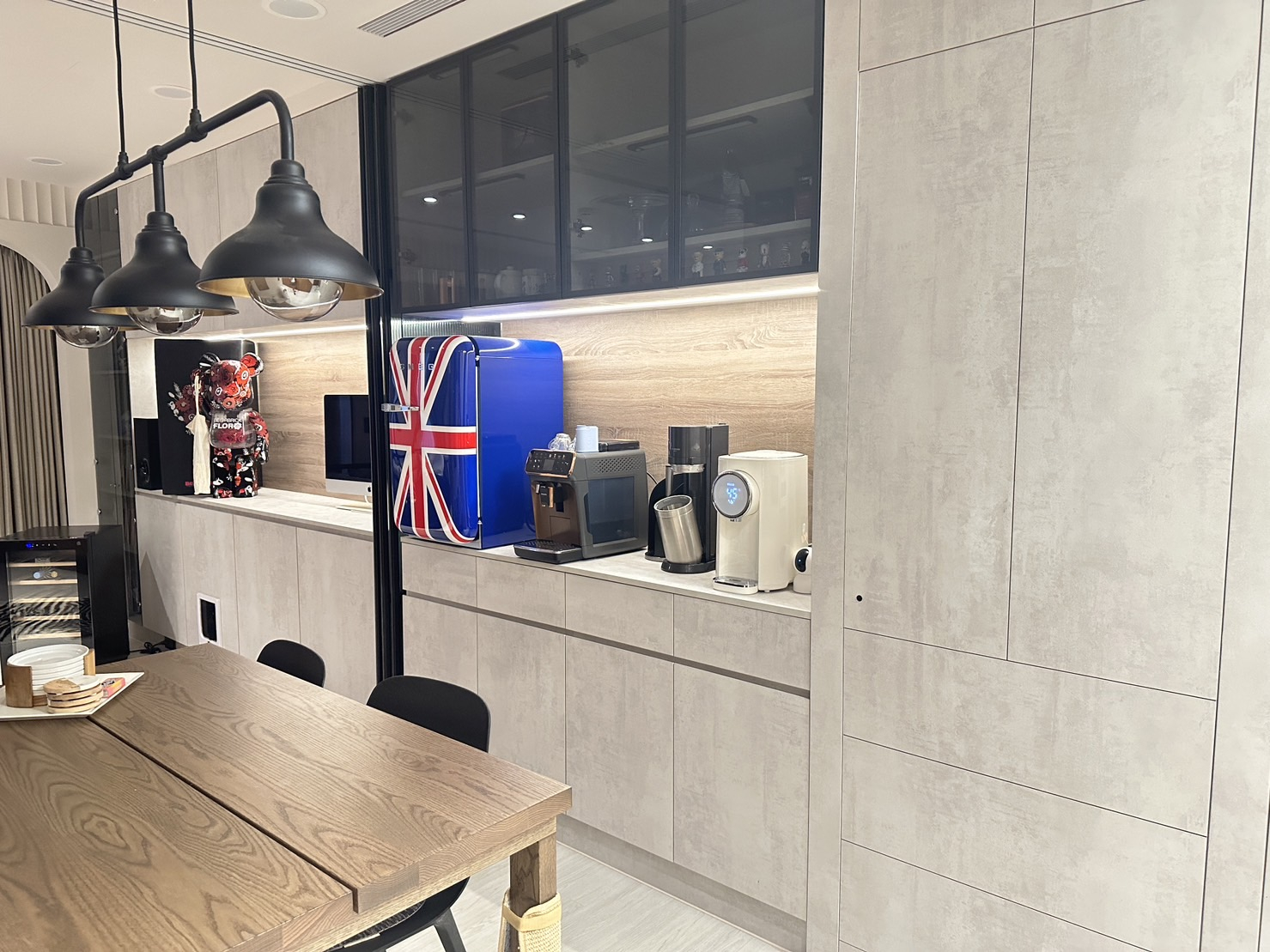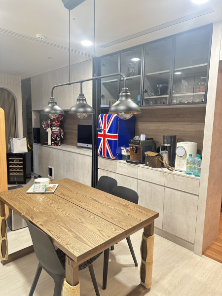 餐邊櫃採三段式設計,上方以灰玻+鐵件規劃了透明展示櫃,能收納杯盤也兼具展示機能;中段則為置物平台收納電器,方便屋主擺放常用的咖啡機、小冰箱等小型家電;下方則為抽屜+層板設計,能收整常用的碗盤與各類雜物。餐桌上方的鐵件吊燈與展示櫃相呼應,搭配木質餐桌,讓家時尚又充滿溫度。