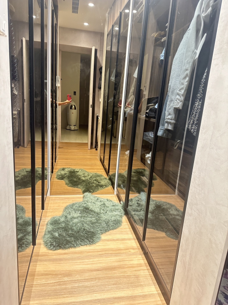 臥室機能回歸純粹,設計師以柔和的木與白色調創造放鬆的睡眠氛圍,同時在床頭為貓咪打造了能一層層往上、與櫃體上方貓洞連結的天空步道,讓屋主與寵物都能住得舒適又安心。更衣室部分以玻璃搭配鐵件設計,並細心規劃了高度不同的層板與吊架,讓屋主能收整洋裝、襯衫、大衣等不同類型的衣物。此外設計師也特別配置了包包、香水的收納空間,滿足屋主的各項收納需求。