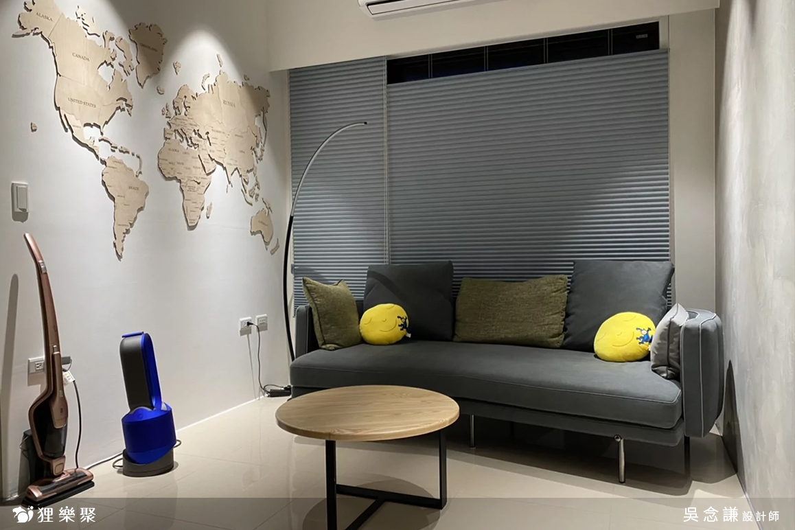 ▲ 牆上木作世界地圖,充滿趣味與藝術感木作櫃不僅提供了充足的收納空間,還為居住者帶來溫暖感,木材的紋理與灰色牆面形成了美妙的對比,使整個空間更加生動有趣。