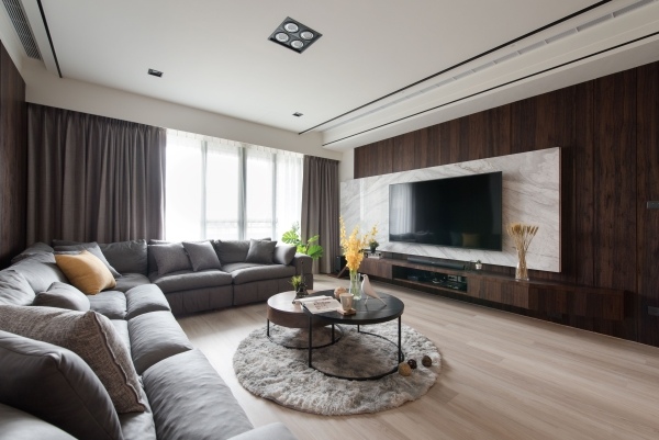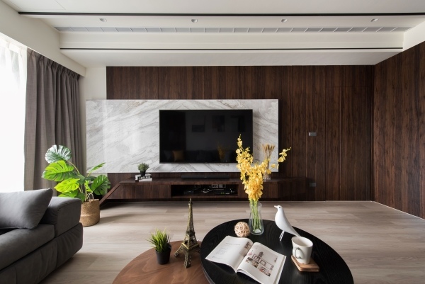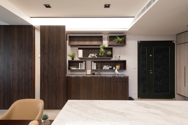 依客戶的喜好選擇了深色沉穩的木皮為基本色調,搭配些許跳脫的色彩點綴,讓空間增加更多活力。