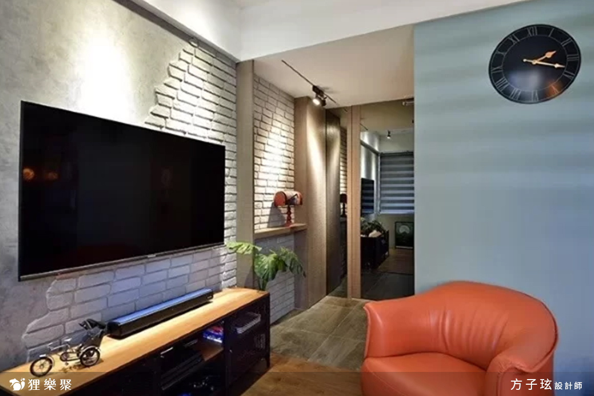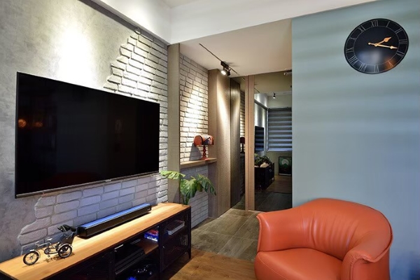 在裝潢方面,可以看到大量的工業風元素如鐵件、軌道燈、木頭、文化石等等,完成一個豐富溫暖的輕工業風設計宅。這個案例沒有另外做木工天花板,而是選擇吊隱式冷氣和軌道燈來完成天花板設計,保留了空間的高度,同時也將預算分配給其他部分;而客廳的文化石牆更是一大亮點,底部是仿清水模牆,上層再鋪上半邊文化石,仿舊的質感立刻透出濃濃的復古味道;另外,設計師利用沙發旁柱子深度的空間做了一面書牆,以木頭層板和鐵件完成,自然隨興又不失設計感。延伸閱讀:<< 老屋翻新減少預算這樣做,符合條件還能申請政府補助金! >>