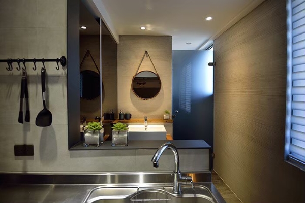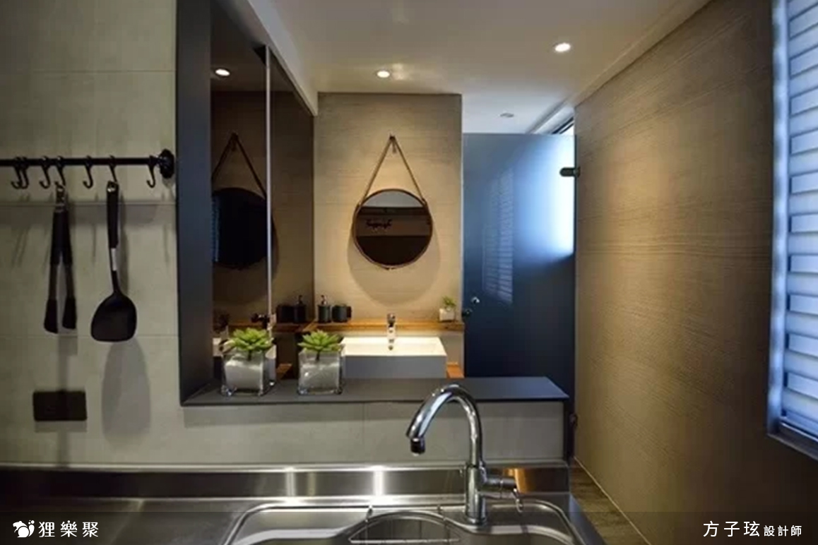 房屋的格局偏長型,屋主希望可以讓空間的視覺感受開闊一些,所以在舊屋翻新的基礎工程時,將位於中間的廚房選擇採用開放式設計,廚房後方的浴廁更將洗手台拉出來,把整個空間全部打通後可以一眼就望見底端,僅利用廚房的流理檯或吧檯來做空間的區隔,展現LOFT風具有高度通透性的特色。延伸閱讀:<< 老屋翻新懶人包,常見問題一次解答! >>