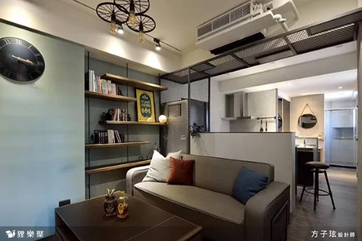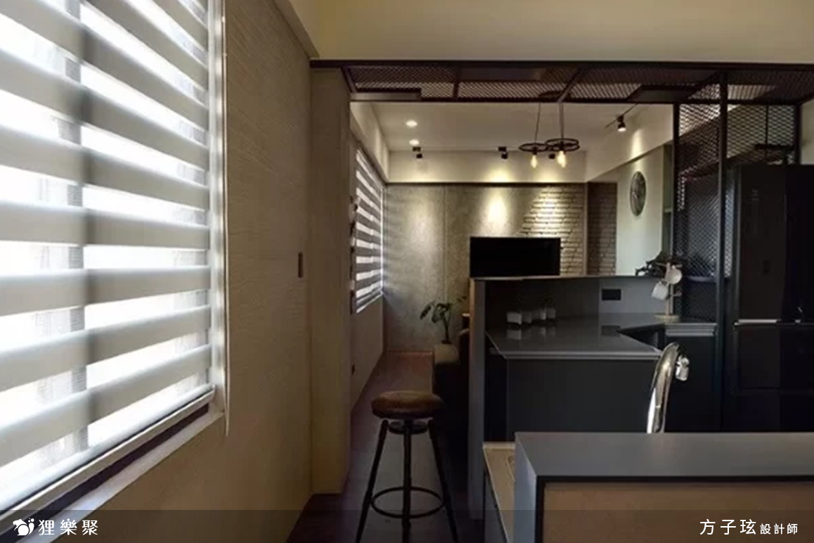 廚房和客廳中間使用了鐵網做出隔斷,具有區分空間的作用,同時鐵網也維持了空間的通透感,另外連接吧檯的地方以鐵網空出冰箱的位置,讓冰箱彷彿擁有自己的小房間一般,相當俏皮可愛,而鐵網也具備通風的功能,完全可以避免冰箱過熱的問題。工業風元素中,具有復古感的家具是一大重點,例如使用較深色的木紋搭配鐵件的電視櫃,或是灰色的雙人布沙發搭配一張亮眼的橘色單人椅,飽和的顏色能夠展現出蓬勃的生命力,完整了這個工業風設計時尚宅。