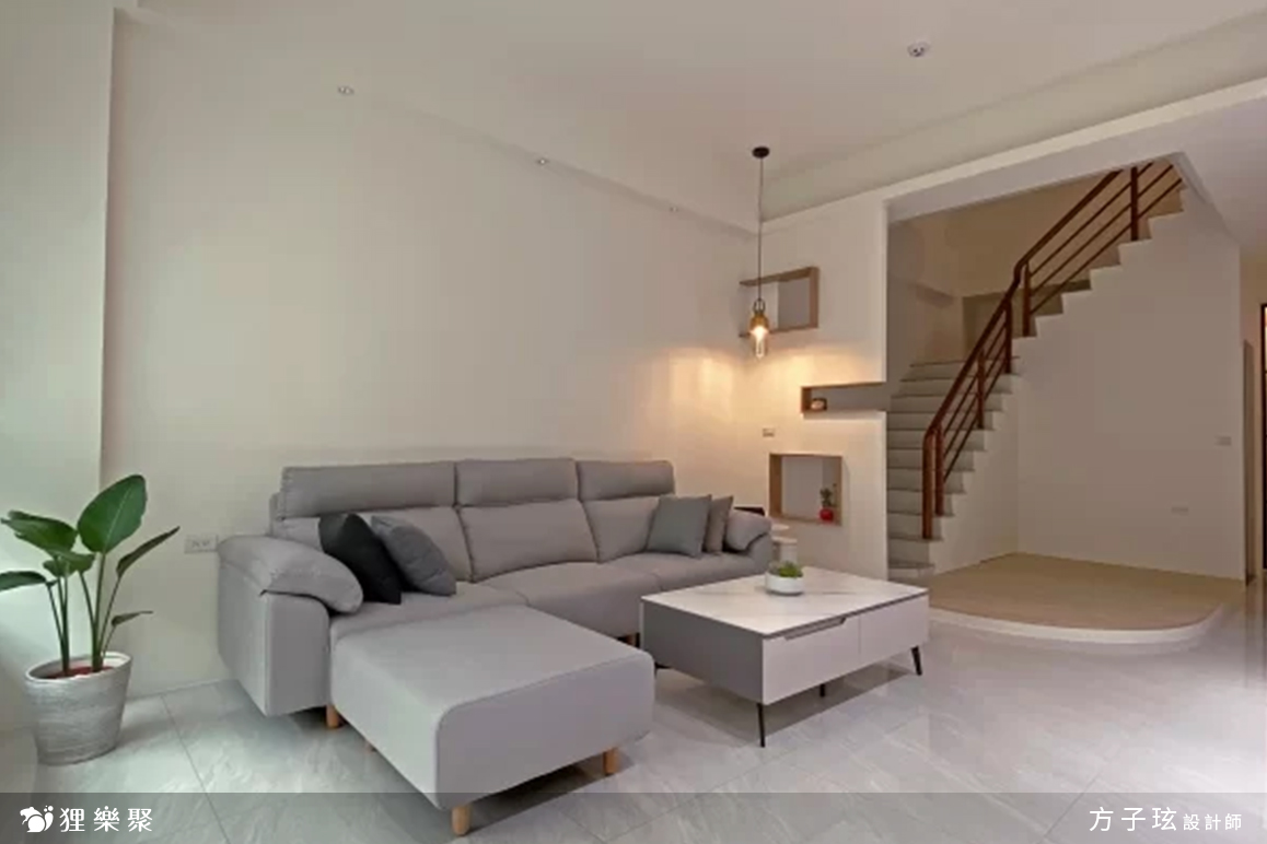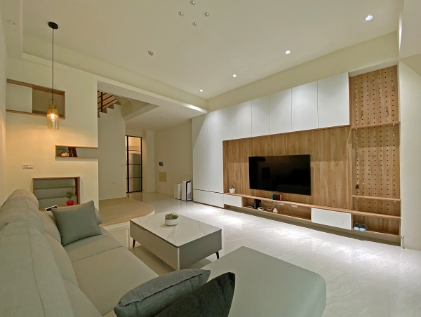 這個透天裝潢是一對新婚夫妻的新居,同時也象徵著他們獨立生活的開始,隨著時代的改變,年輕的客群需求不再繁複,僅稍微修飾原有的局部格局,並將重點放在電視牆設計上,完成一個機能與美觀兼具的家,同時也保留彈性空間,未來如有增加家庭成員就能夠使用。微溫氣息