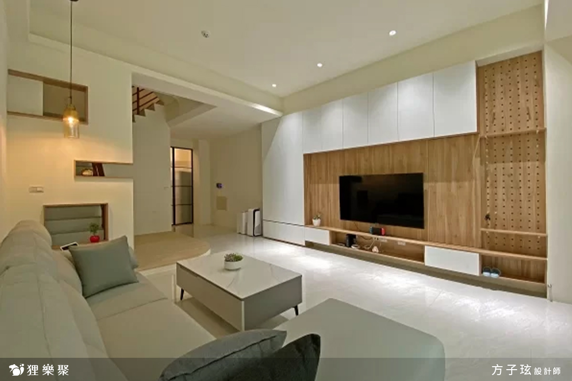 由於業主想把收納集中在電視牆一側,沙發旁僅在木作假牆局部設計鏤空櫃或嵌入櫃,在電視牆設計上,左側和電視上方規劃收納櫃,可以將雜物都藏進白色的門片內,下方則以抽屜搭配開放式的層板,可以放置小東西和一些電視相關的機台,右側較為吸睛的部分則是高及樑下的洞洞板,讓屋主入住後可以隨意、隨時間地彈性更動擺設的物品,讓電視牆裝潢擁有屬於屋主的個人溫度。延伸閱讀:<< 老屋翻新懶人包,常見問題一次解答! >>