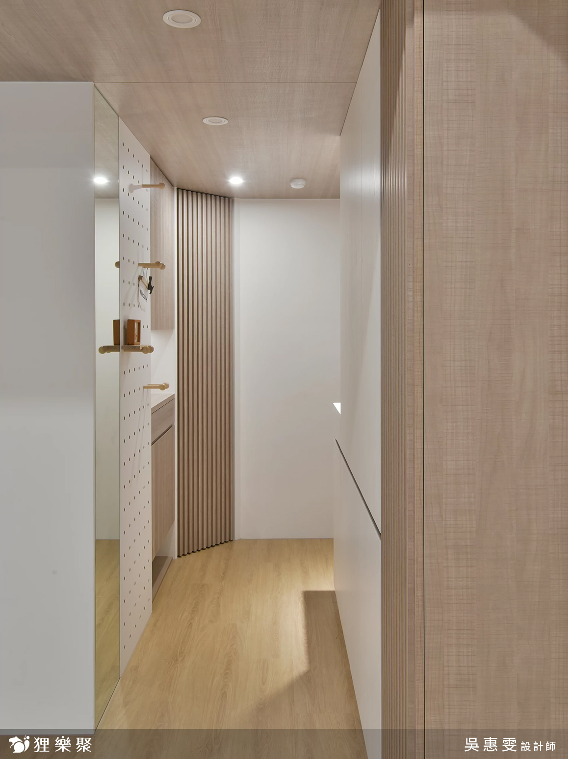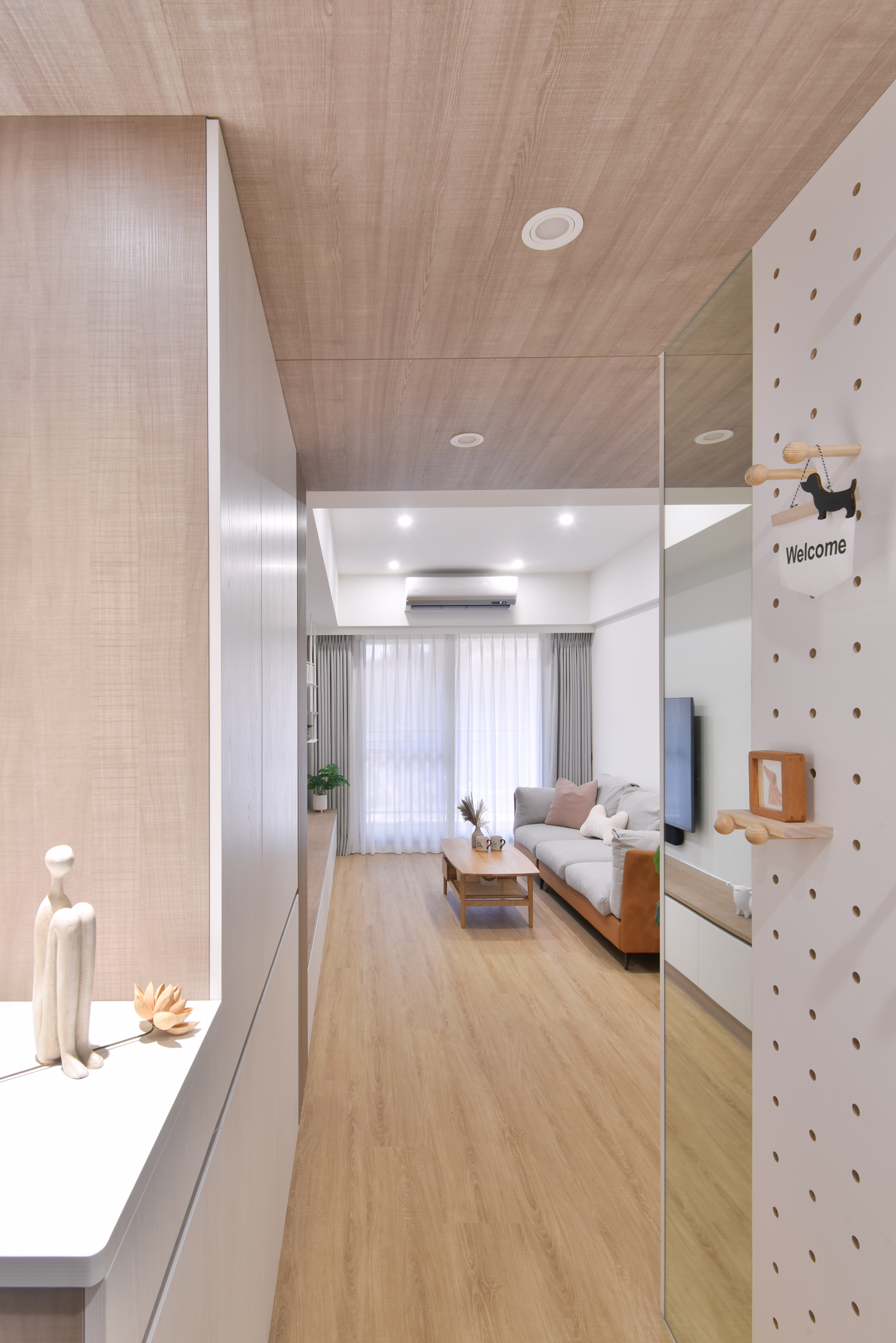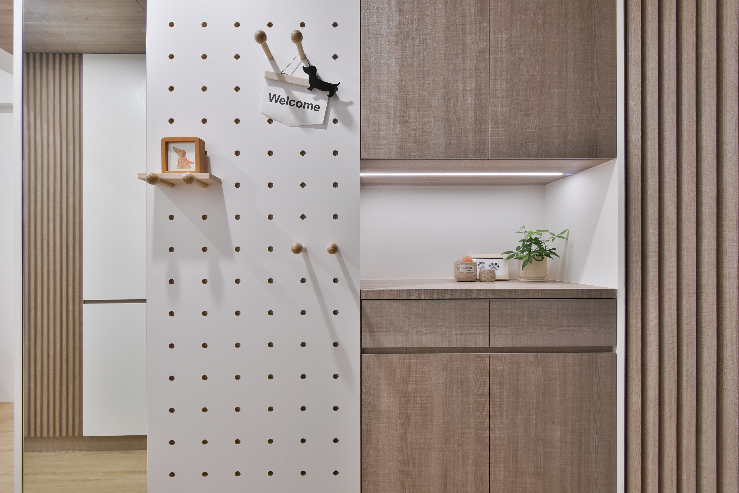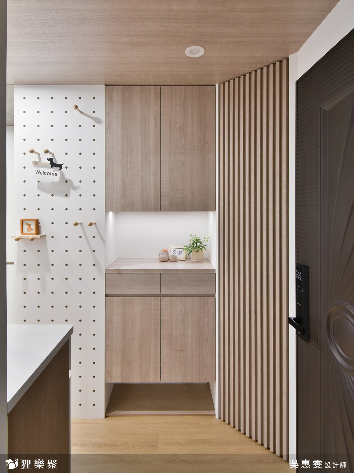設計師以木與白為空間主要搭配,一進門即可感受整體的溫暖氛圍,玄關雖然不大,但卻有著充足的機能性,除了基本的上下鞋櫃、吊櫃收納外,還配置了穿衣鏡與洞洞板懸吊區,方便屋主進出門整理儀容、拿取鑰匙等小物,另外也利用畸零處結合木格柵門片,規劃了迷你儲藏間,能收整居家各類備品與雜物。