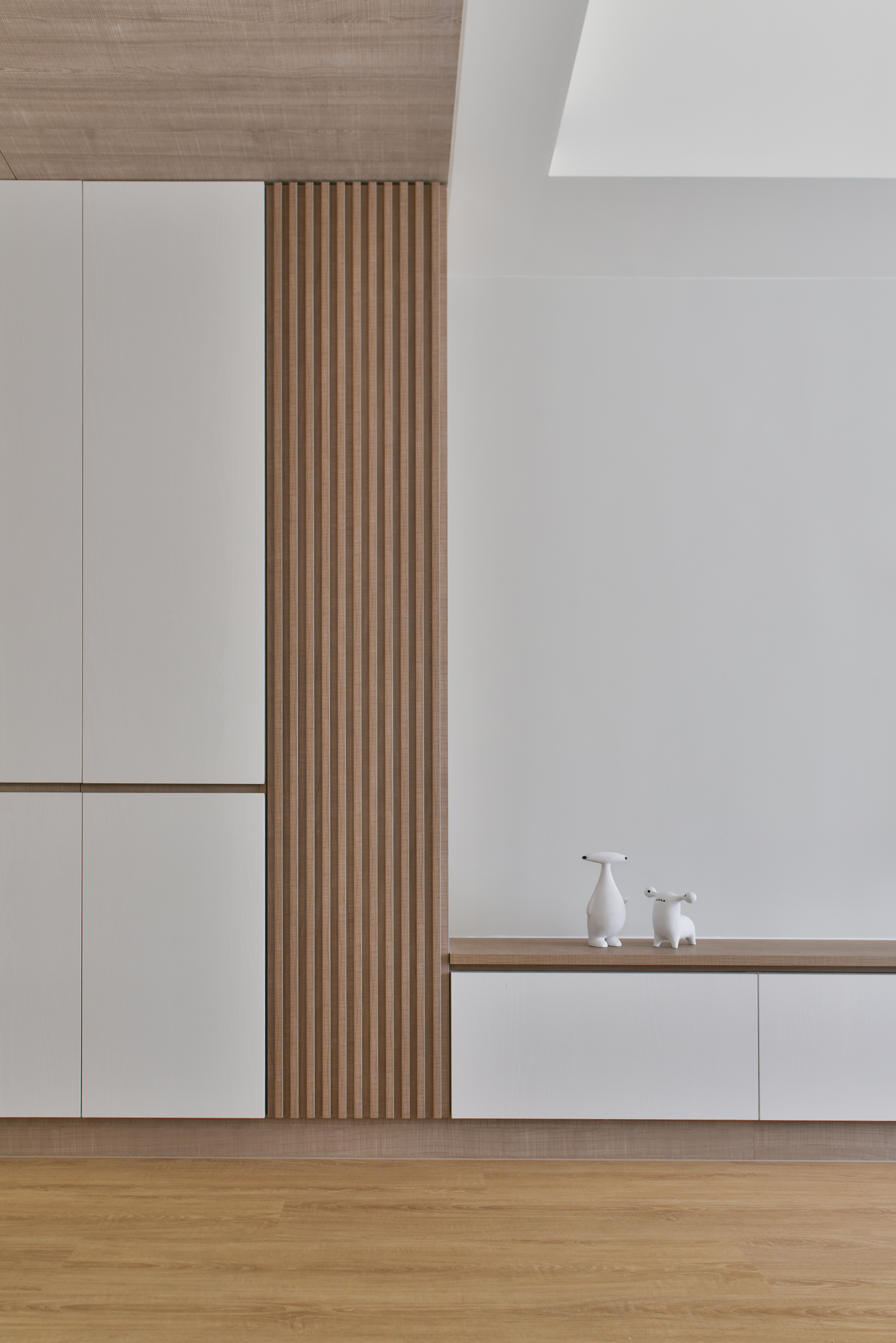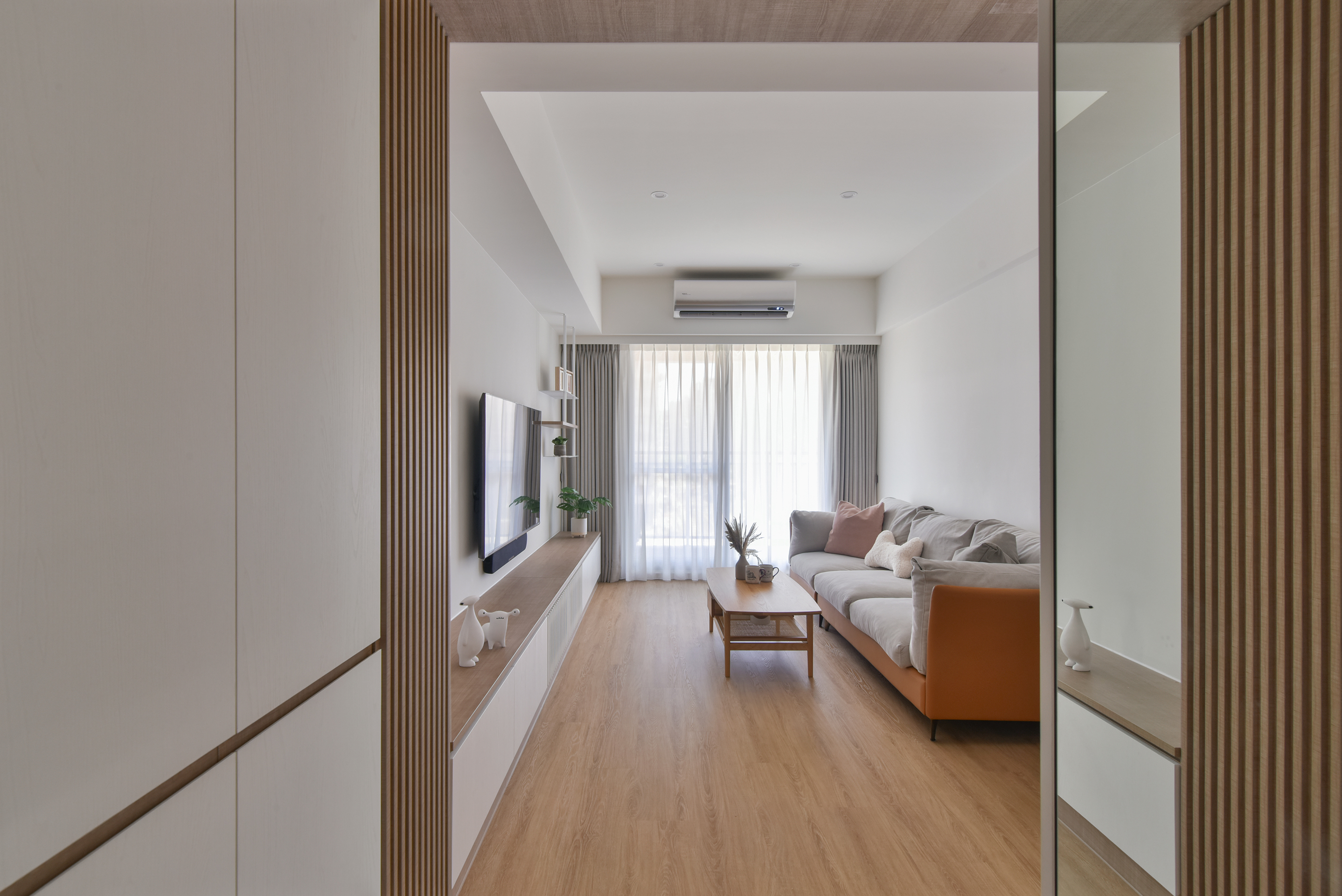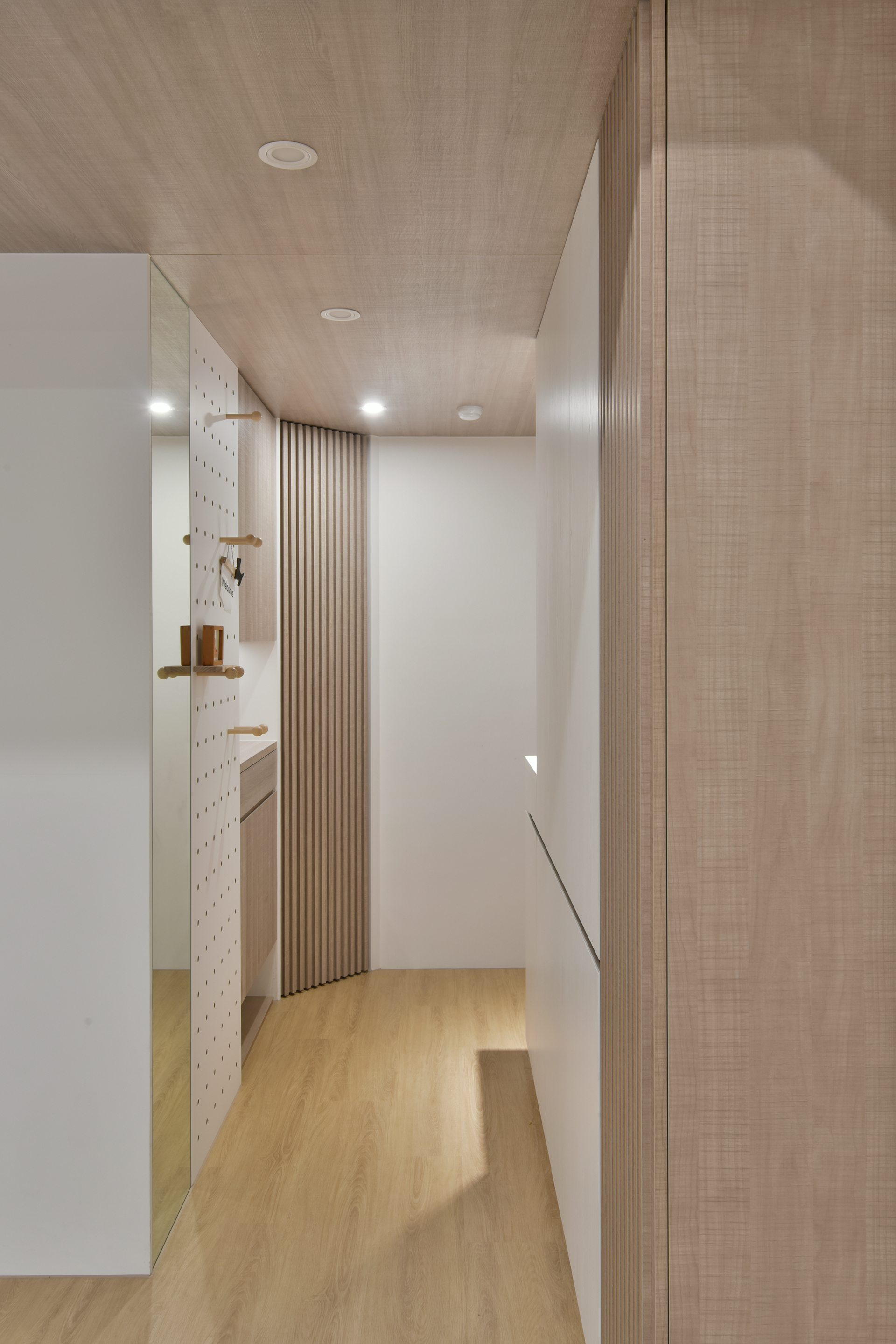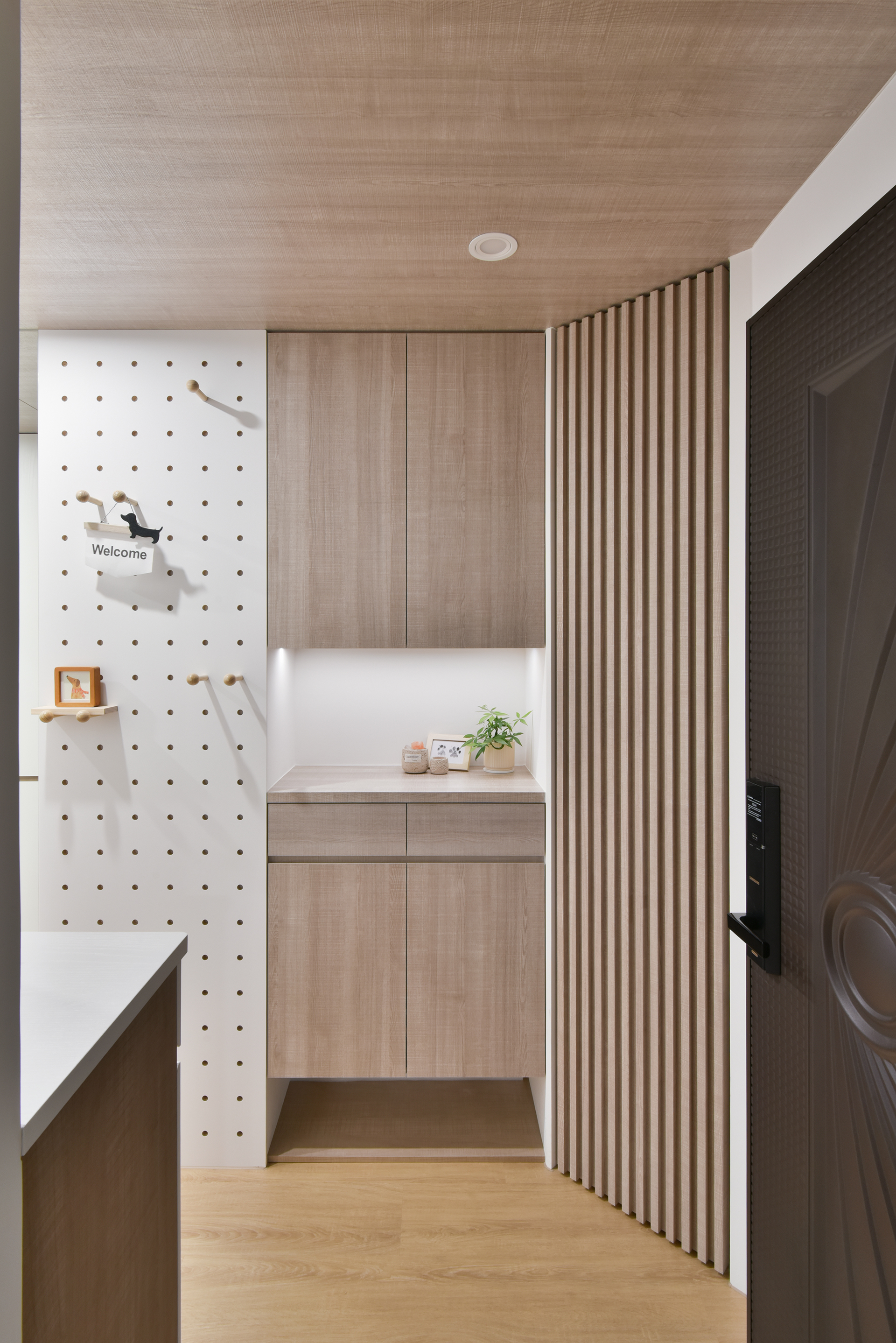 設計師以木與白為空間主要搭配,一進門即可感受整體的溫暖氛圍,玄關雖然不大,但卻有著充足的機能性,除了基本的上下鞋櫃、吊櫃收納外,還配置了穿衣鏡與洞洞板懸吊區,方便屋主進出門整理儀容、拿取鑰匙等小物,另外也利用畸零處結合木格柵門片,規劃了迷你儲藏間,能收整居家各類備品與雜物。