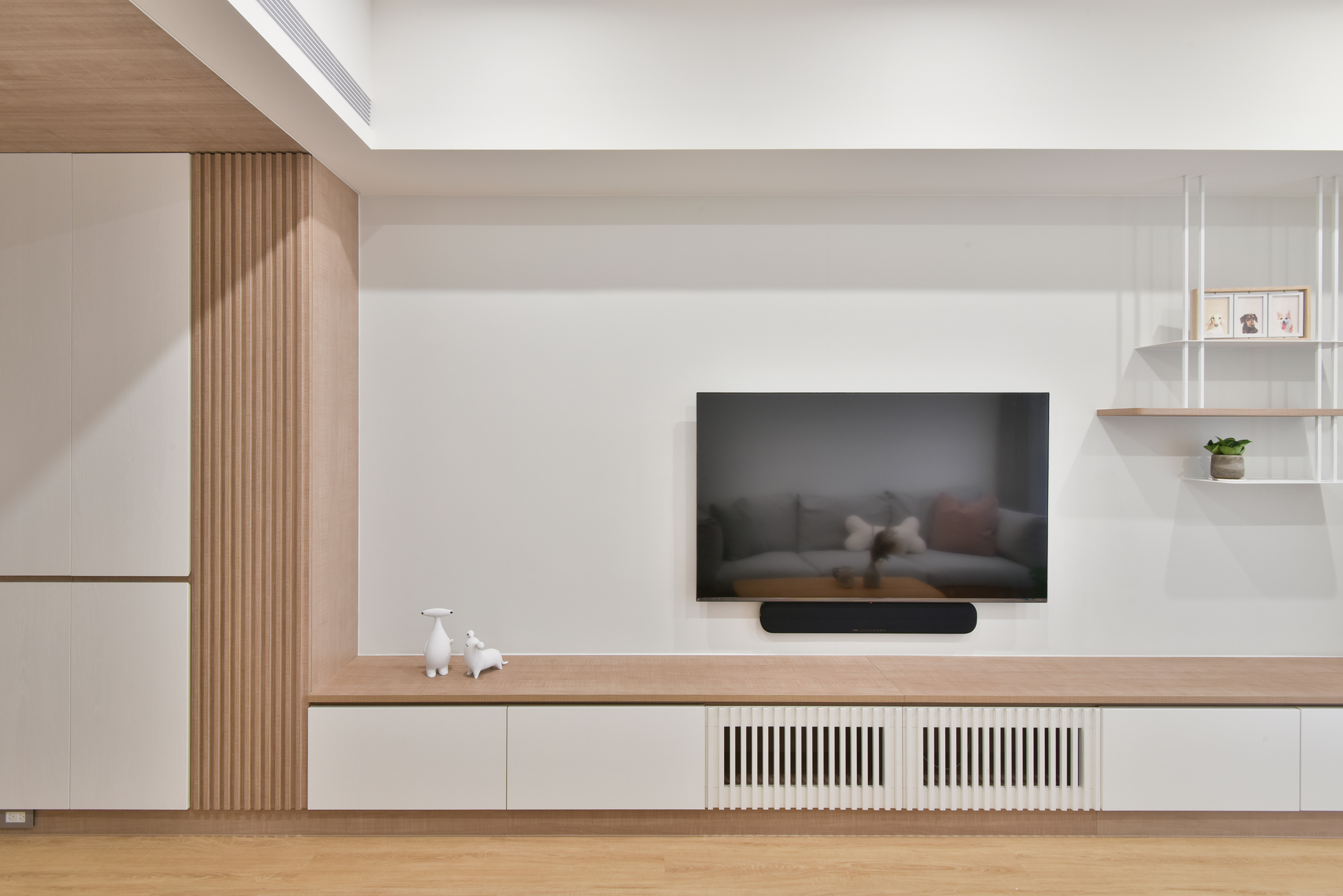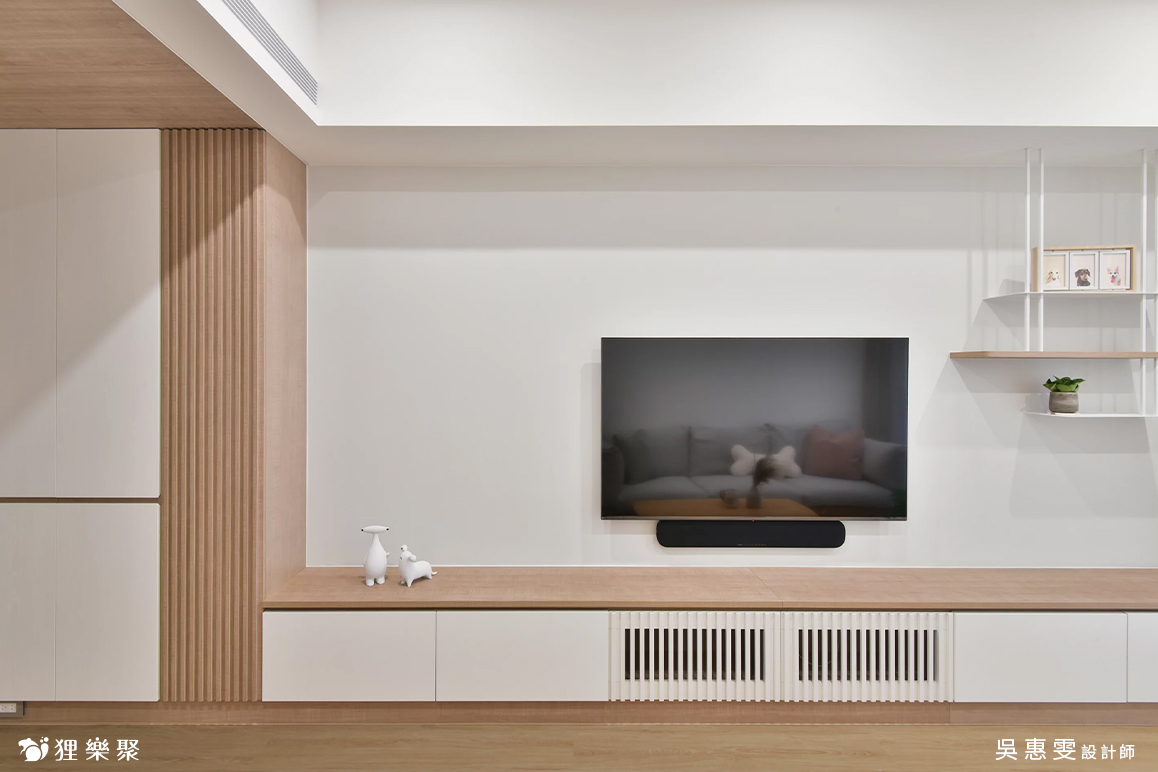 客廳淺灰的電視牆面呼應沙發背牆,搭配白色鐵件展示架、格柵櫃體,整體層次更顯豐富。為了給2人1狗開闊的生活空間,公領域捨棄了餐廳,將用餐機能整合至茶几,不僅使客廳放大,也讓整體居家視覺開闊。此外,設計師也將走道底端櫃體下方規劃為狗狗的小房間,同時滿足人寵需求,創造令人心曠神怡的居家氛圍。