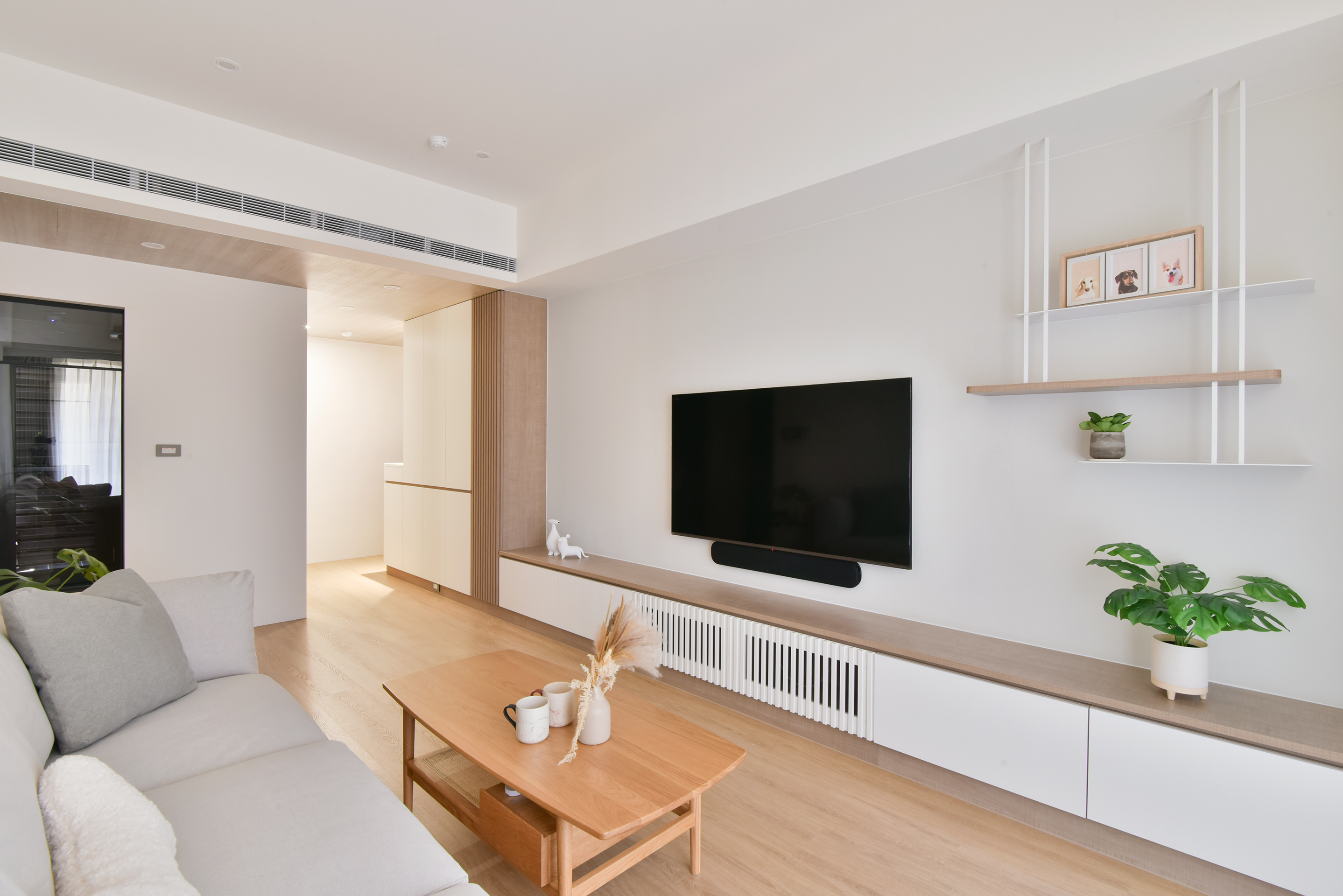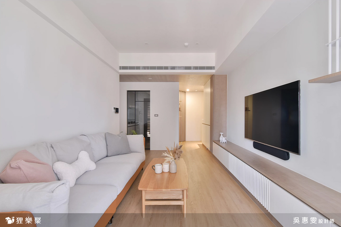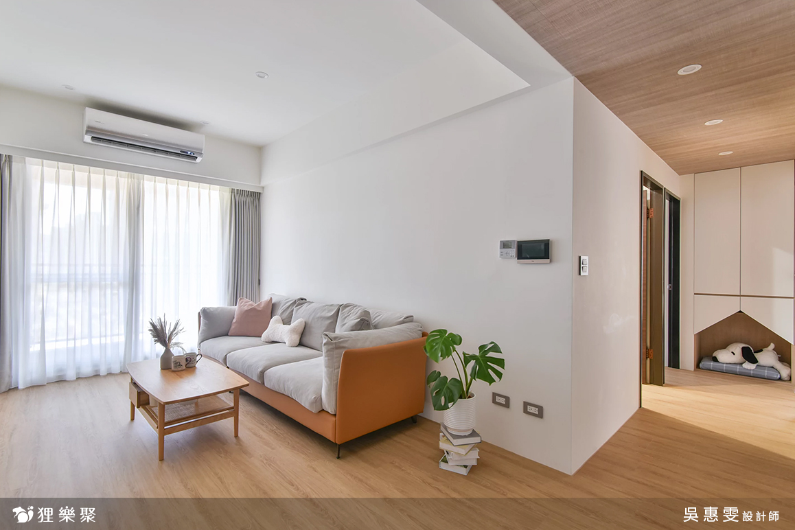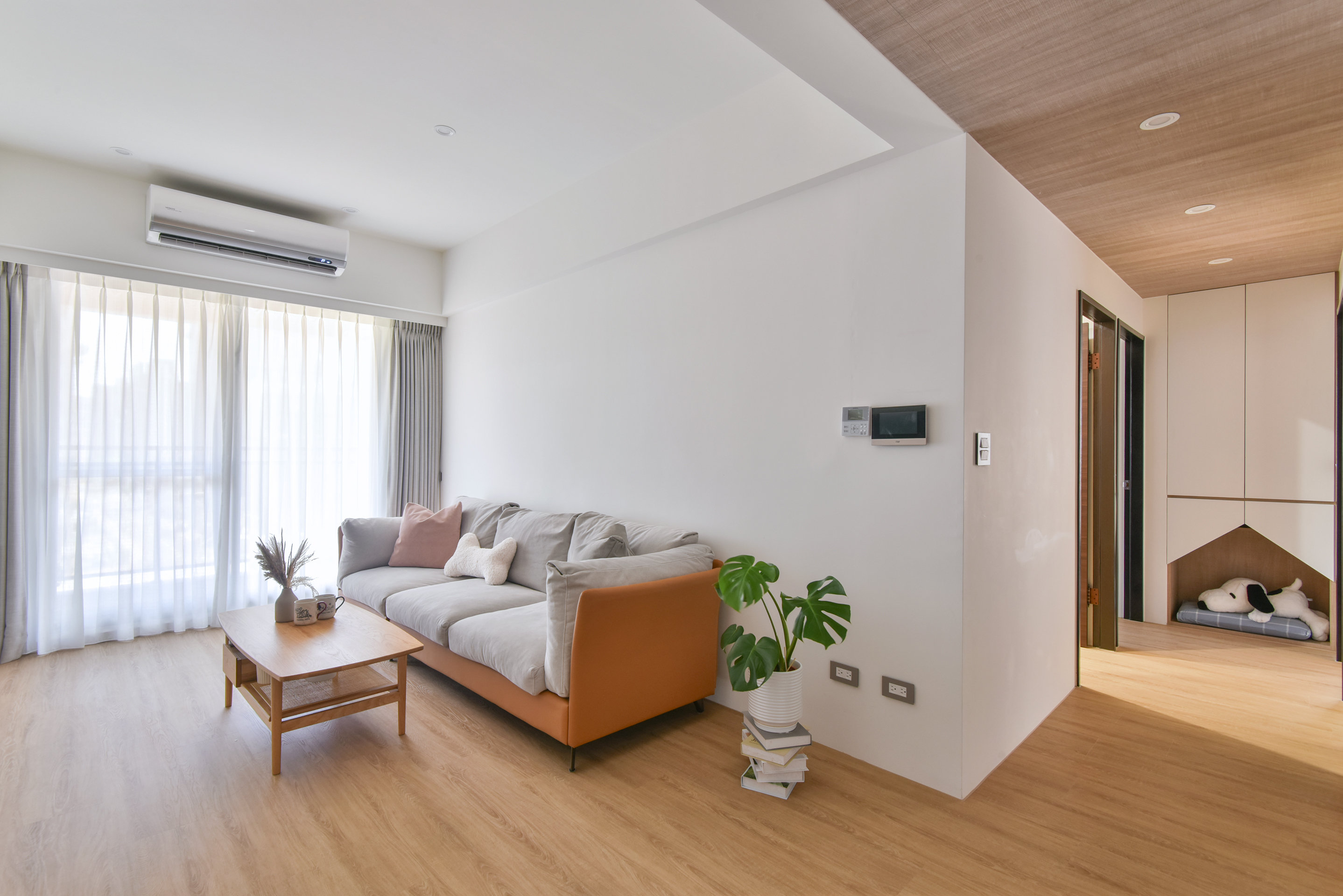 姐妺倆帶著一隻狗狗買下了這間新成屋,喜歡簡約風格的他們,希望整體空間儘量通透、放大,並期待能給狗狗舒適的生活環境。設計師以木皮為主穿梭整個空間,搭配白色、淺灰與奶油色,營造出溫馨且優雅的氛圍,同時將公領域機能整合,捨棄餐廳,充分運用牆面空間,以洞洞板、層架等創造充足且方便的垂直收納,使整體視覺開闊,並結合櫃體,為狗狗規劃專屬的休息小窩,打造簡約舒適的溫馨寵物宅。屬於姐妹倆的溫潤簡約宅