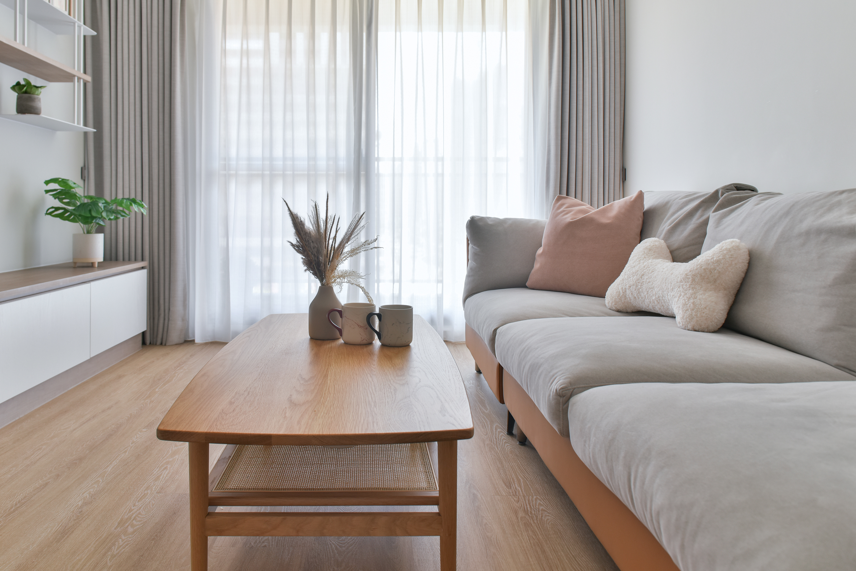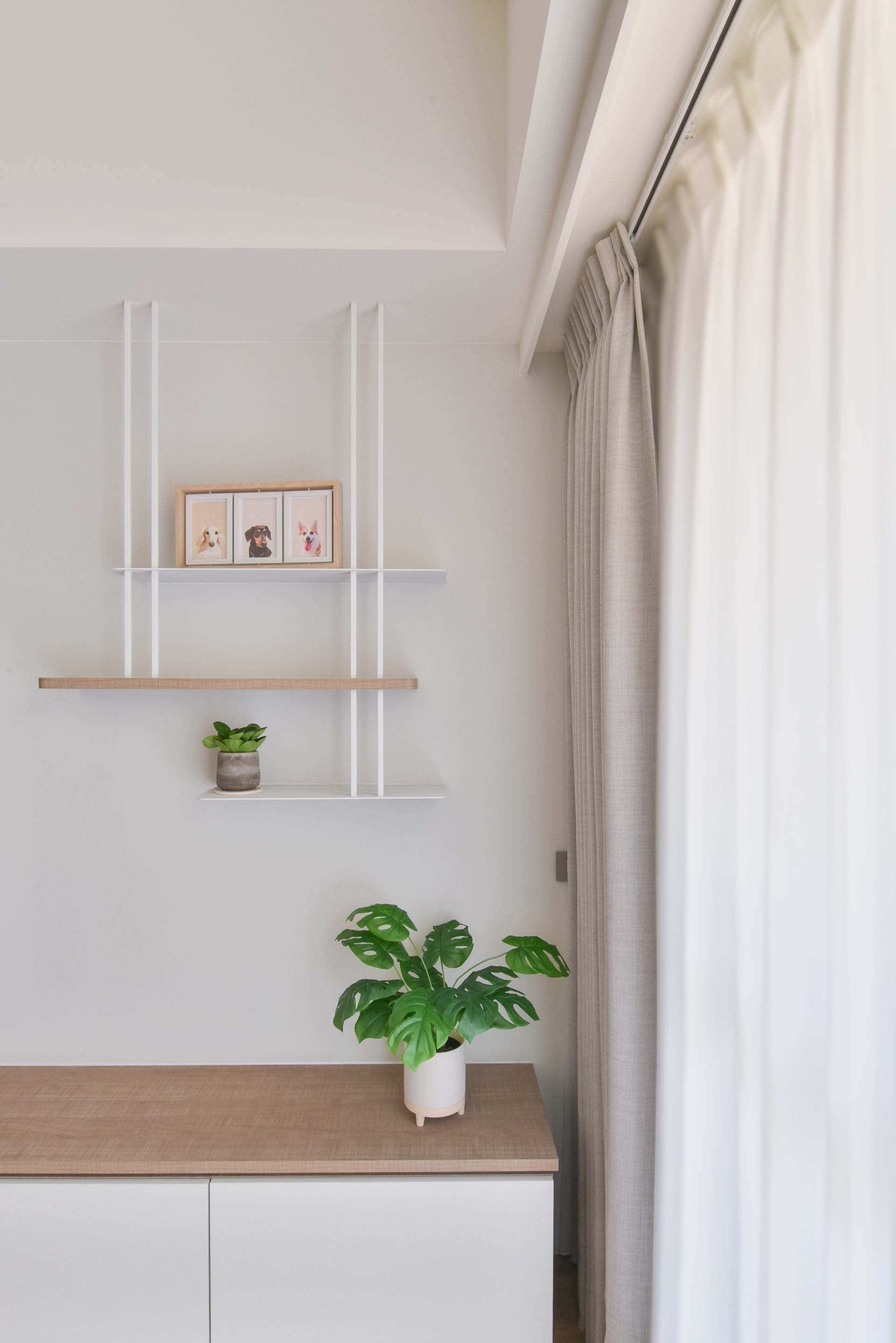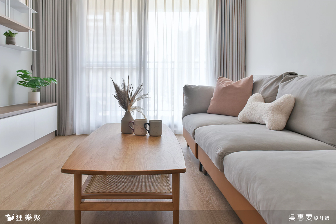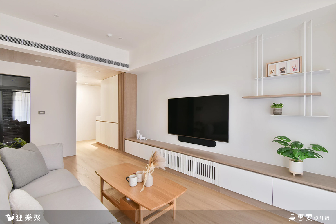 姐妺倆帶著一隻狗狗買下了這間新成屋,喜歡簡約風格的他們,希望整體空間儘量通透、放大,並期待能給狗狗舒適的生活環境。設計師以木皮為主穿梭整個空間,搭配白色、淺灰與奶油色,營造出溫馨且優雅的氛圍,同時將公領域機能整合,捨棄餐廳,充分運用牆面空間,以洞洞板、層架等創造充足且方便的垂直收納,使整體視覺開闊,並結合櫃體,為狗狗規劃專屬的休息小窩,打造簡約舒適的溫馨寵物宅。屬於姐妹倆的溫潤簡約宅