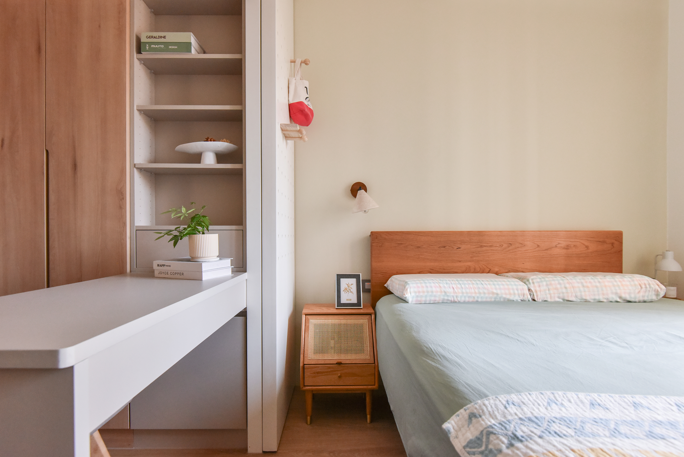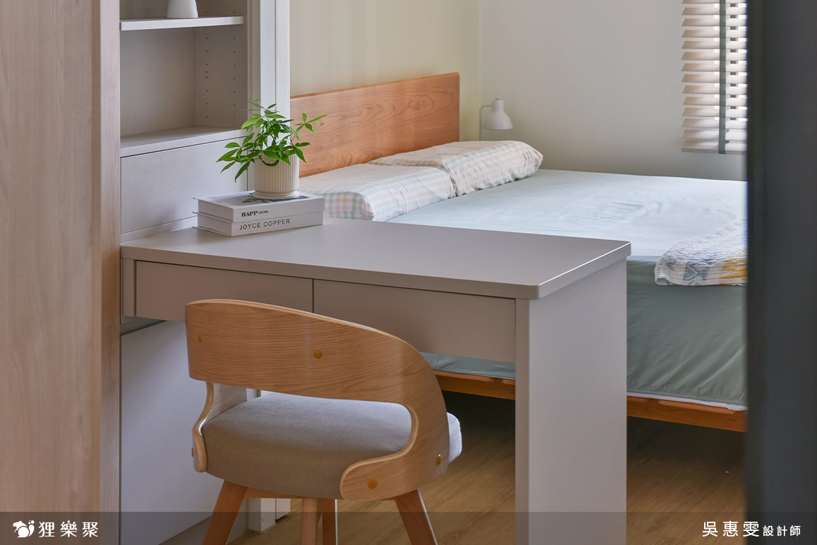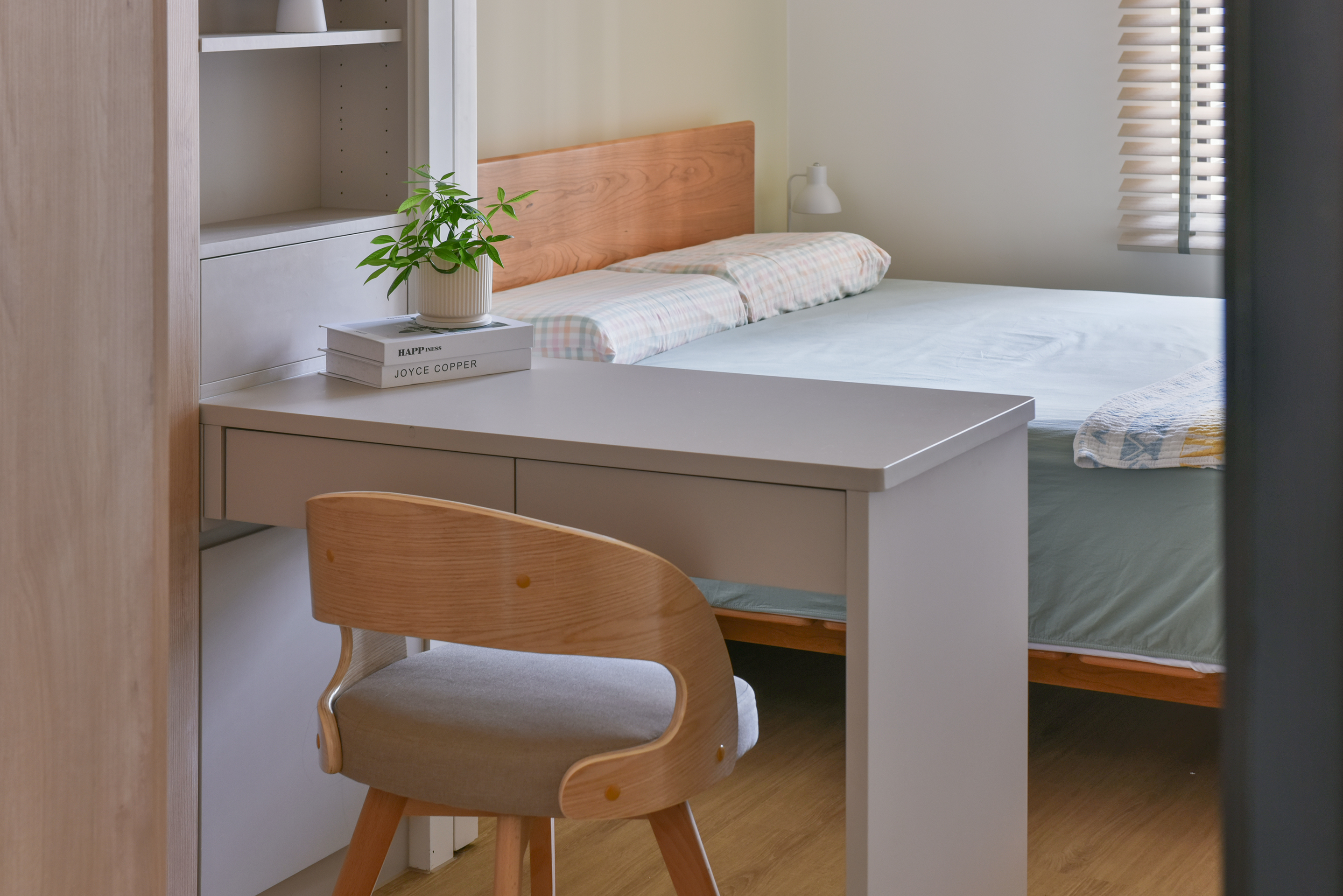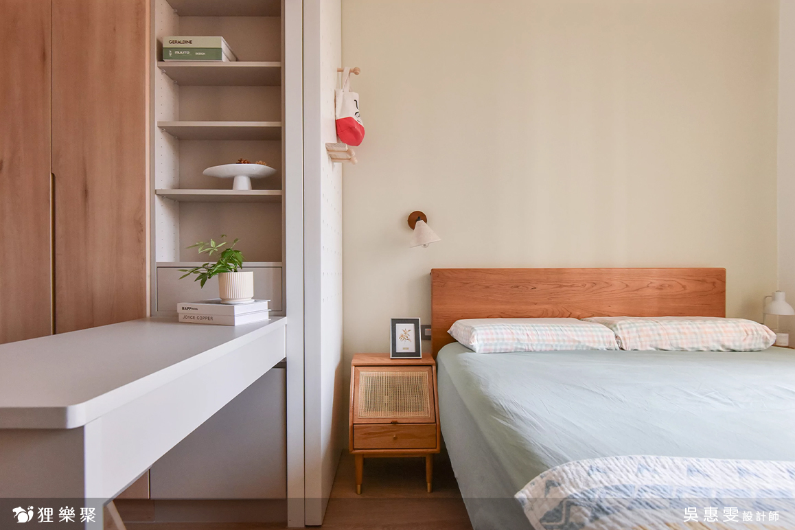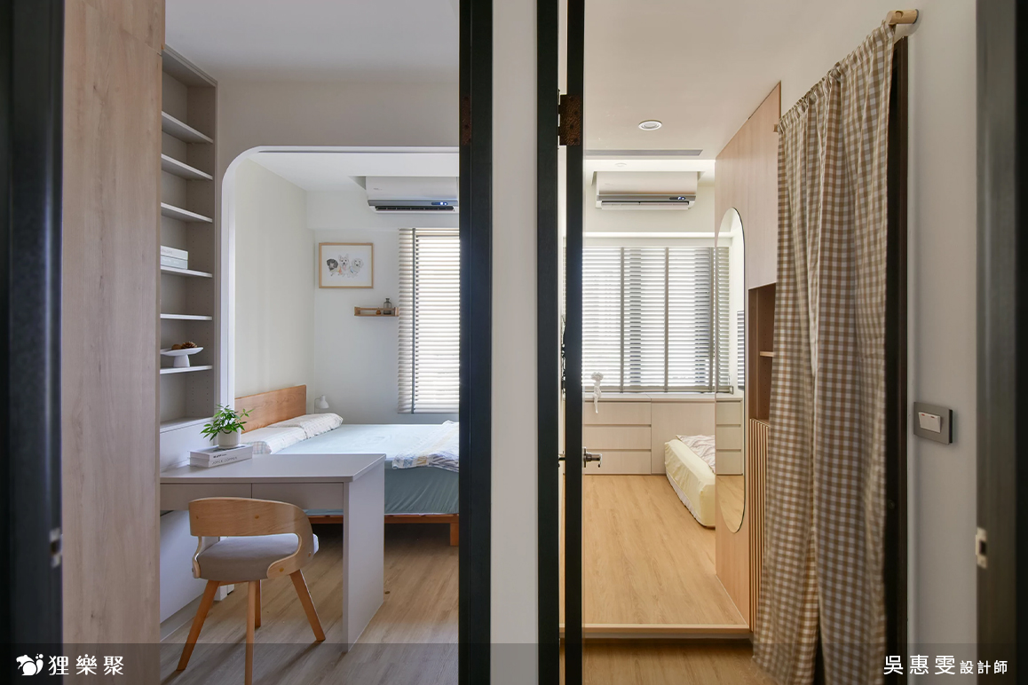 姐妹倆休息、睡眠的臥室,其一利用推拉鏡與造型牆區隔出梳化更衣區與睡眠區,木材質結合奶油色的床頭牆面,使空間散發悠閒放鬆的氛圍。主臥室部分,為了讓主浴到房間更有區隔感,設計師透過高架地板分隔空間機能,打造和諧舒適的居家生活。