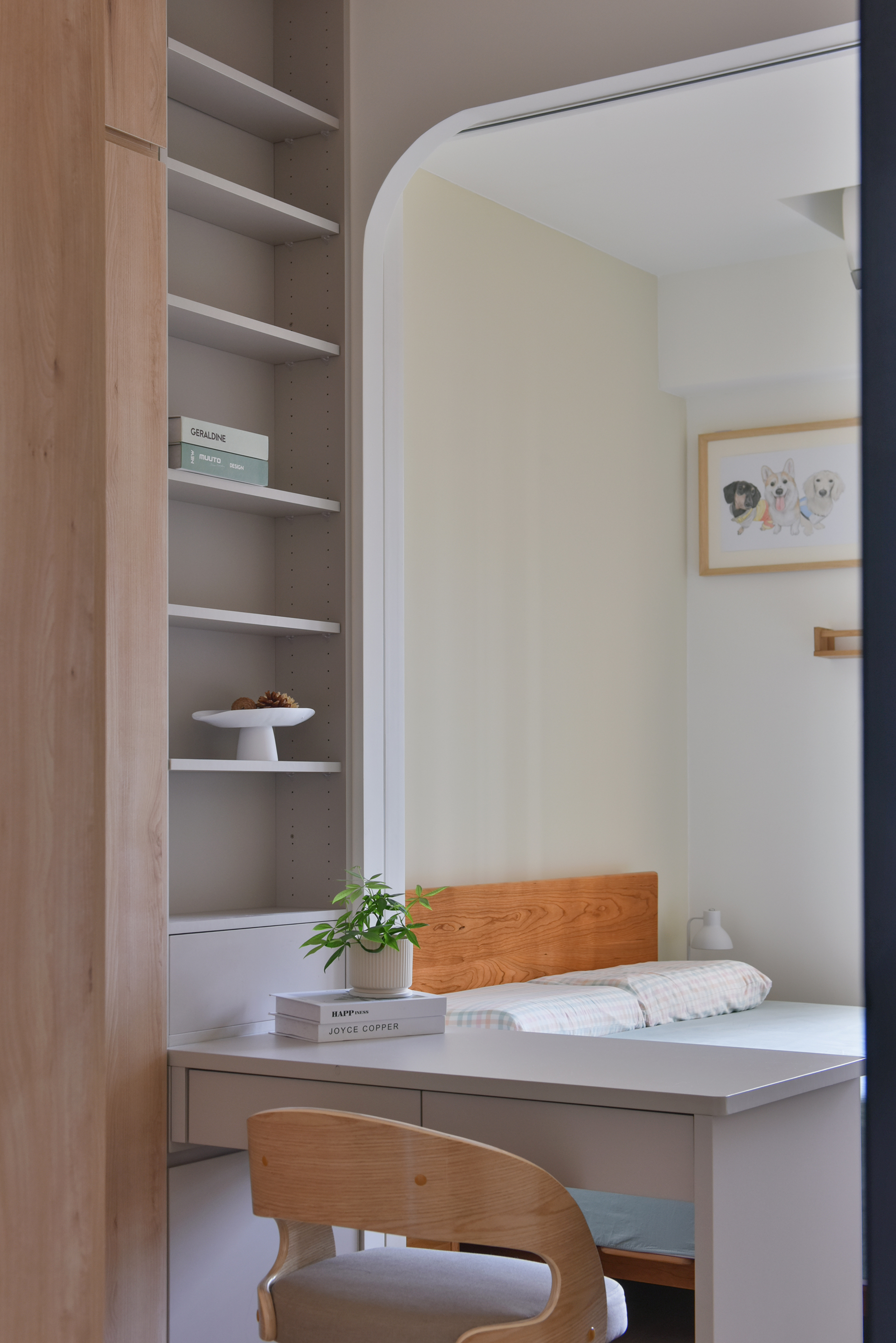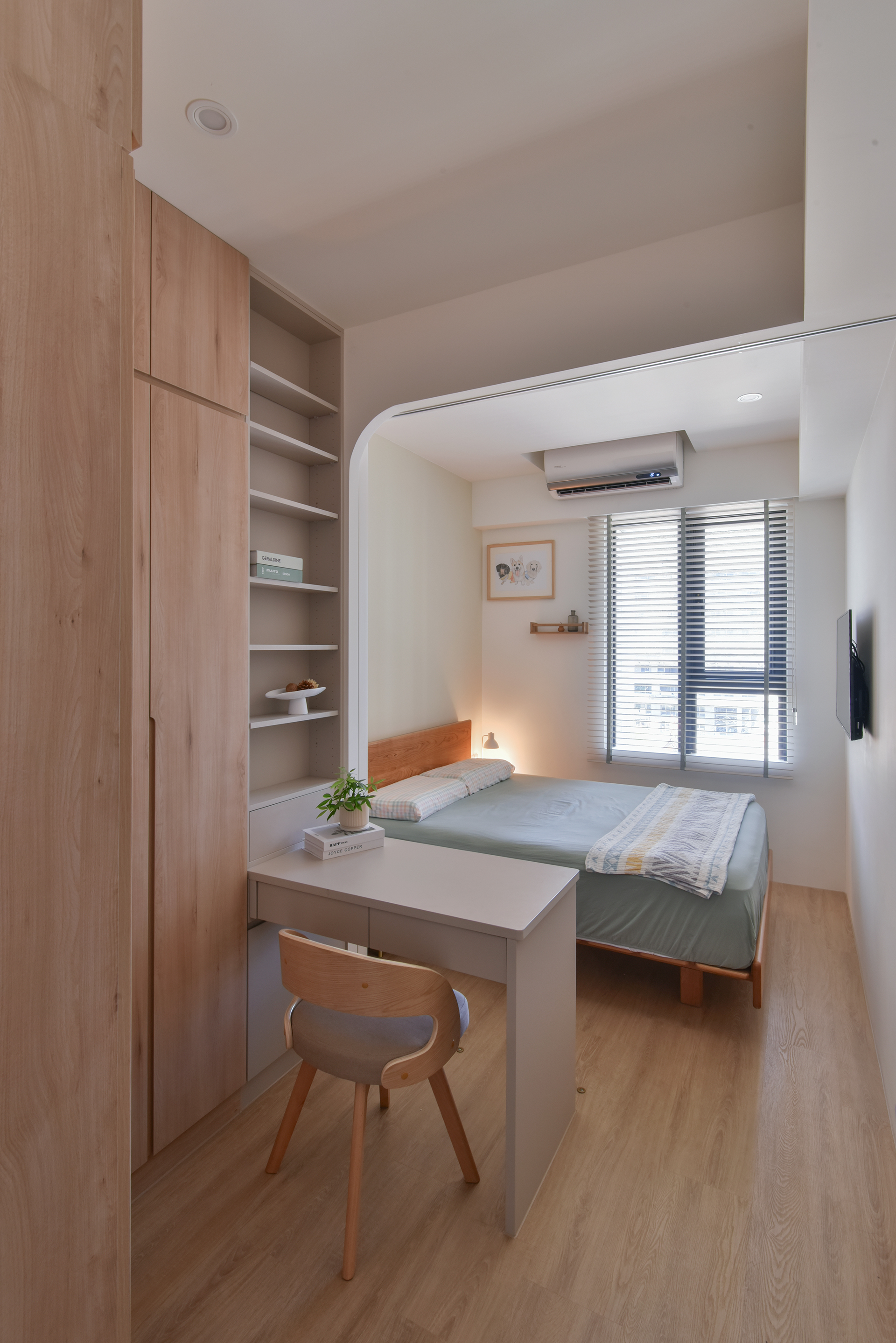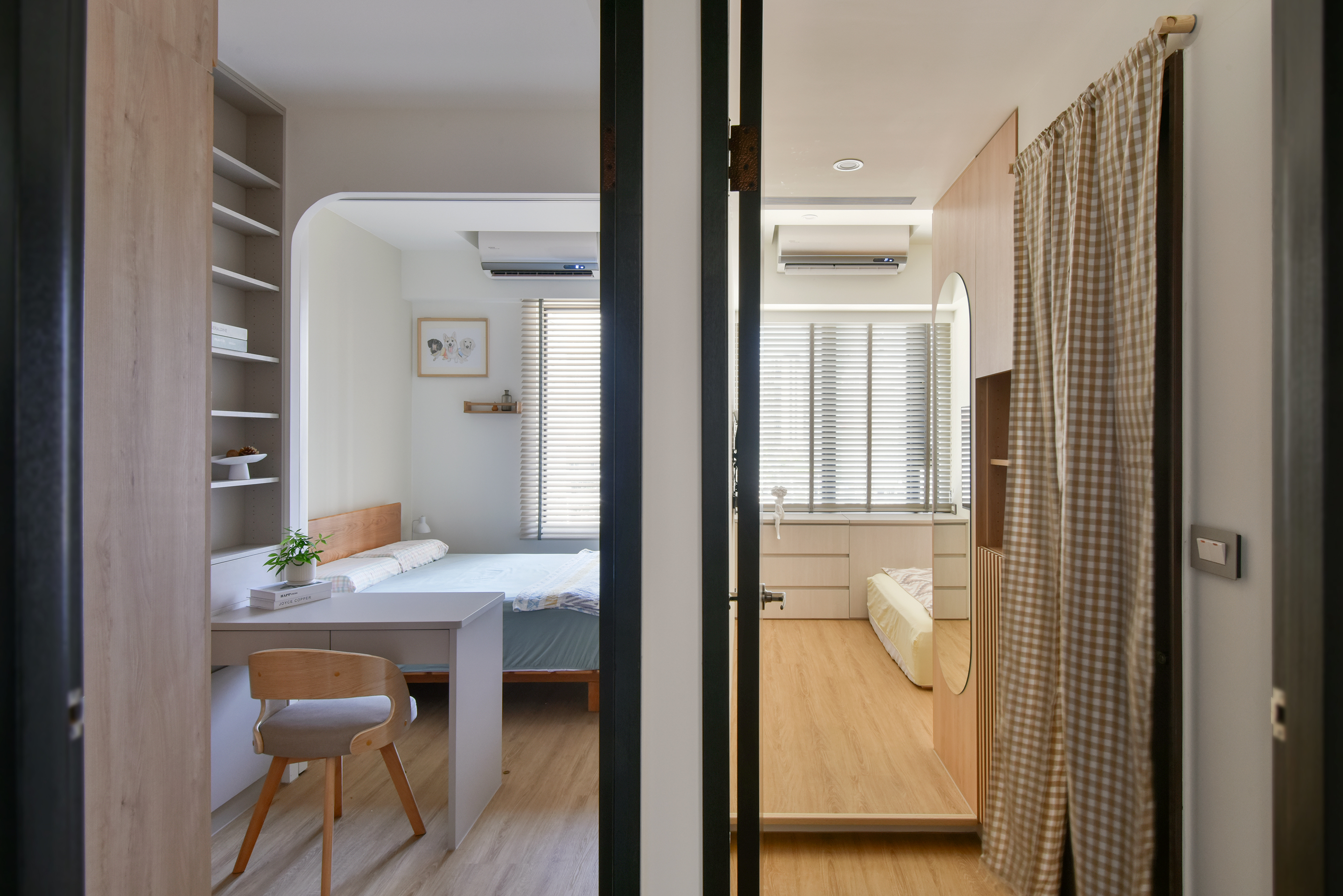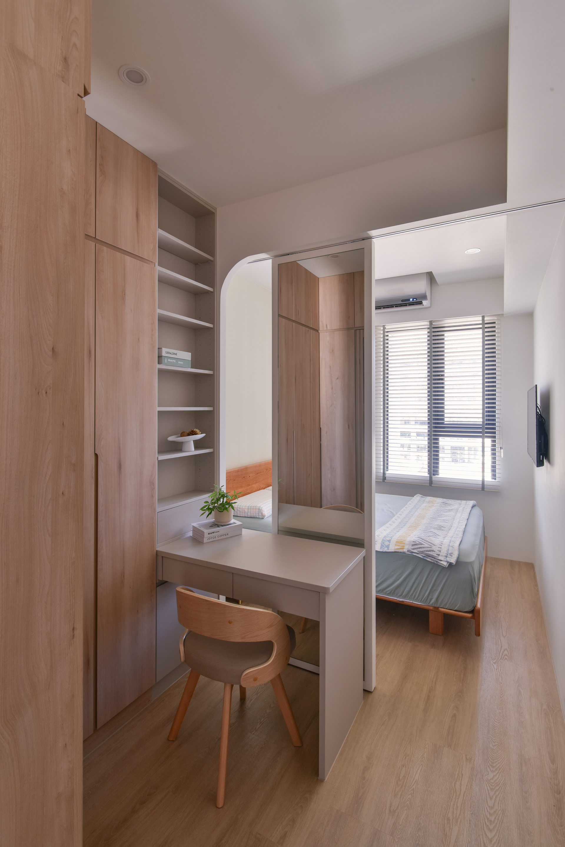 姐妹倆休息、睡眠的臥室,其一利用推拉鏡與造型牆區隔出梳化更衣區與睡眠區,木材質結合奶油色的床頭牆面,使空間散發悠閒放鬆的氛圍。主臥室部分,為了讓主浴到房間更有區隔感,設計師透過高架地板分隔空間機能,打造和諧舒適的居家生活。