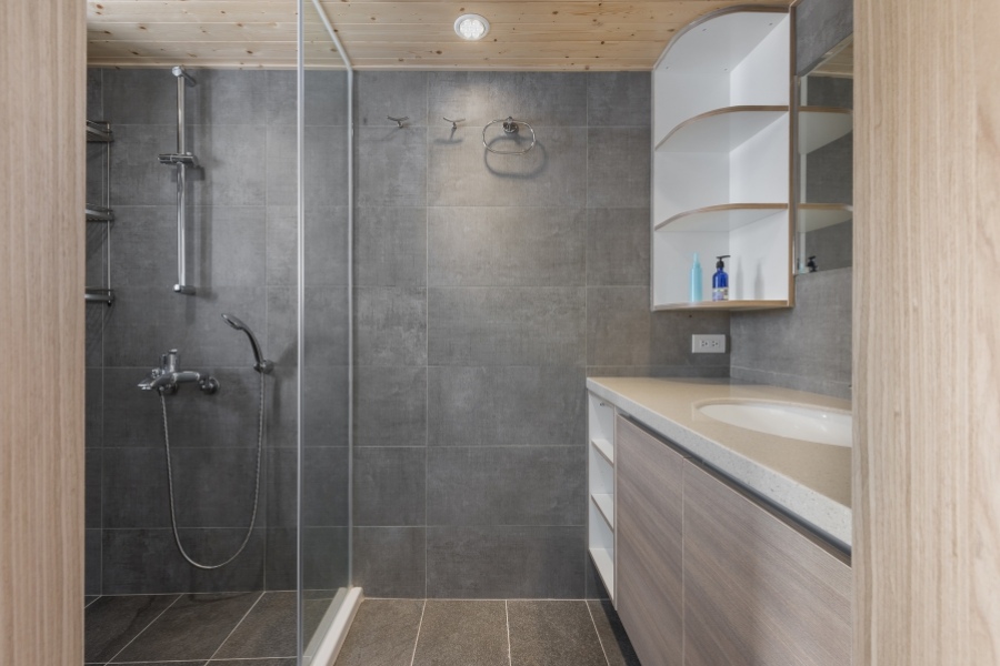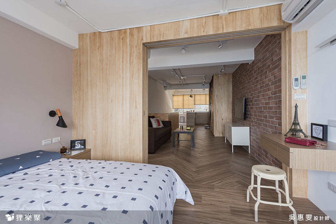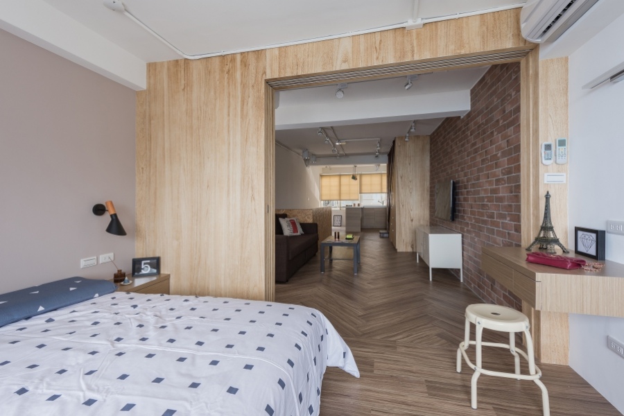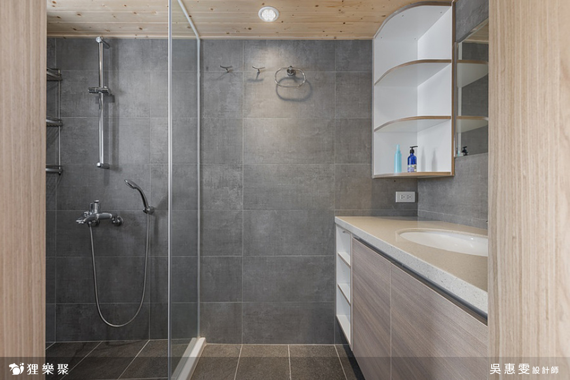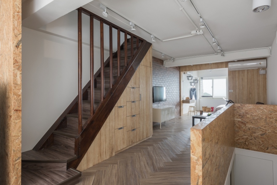 樓梯隔牆的材質利用OSB板來呼應電視牆的工業風磁磚,OSB板是由實木壓碎後在壓製成板料,具有不易變形又環保的特點,保持了木頭材質的紋路,又創造出豐富且強烈的視覺效果。而地板雖是塑膠地磚,在工法上使用人字貼後,除了增加美式的氛圍外,也把整體質感向上提升不少。三樓部分為浴室及廁所,整體以灰色帶水泥刷紋的磁磚營造飯店的高級質感,再搭配木頭材質的櫃體及天花板,呼應著小套房的設計。