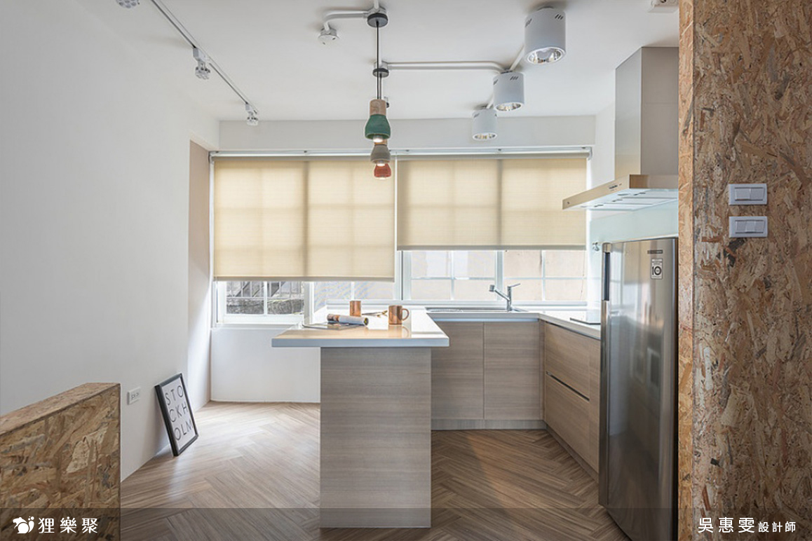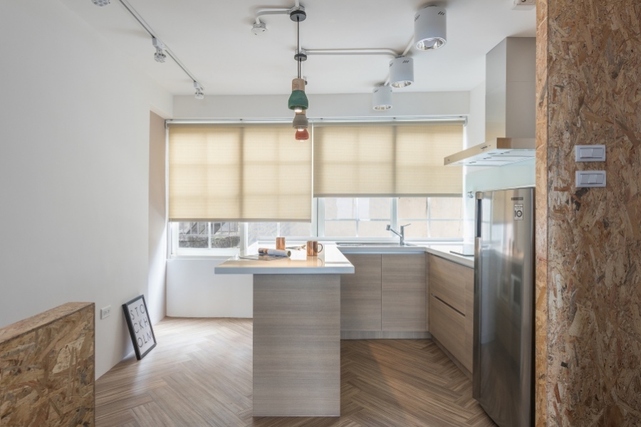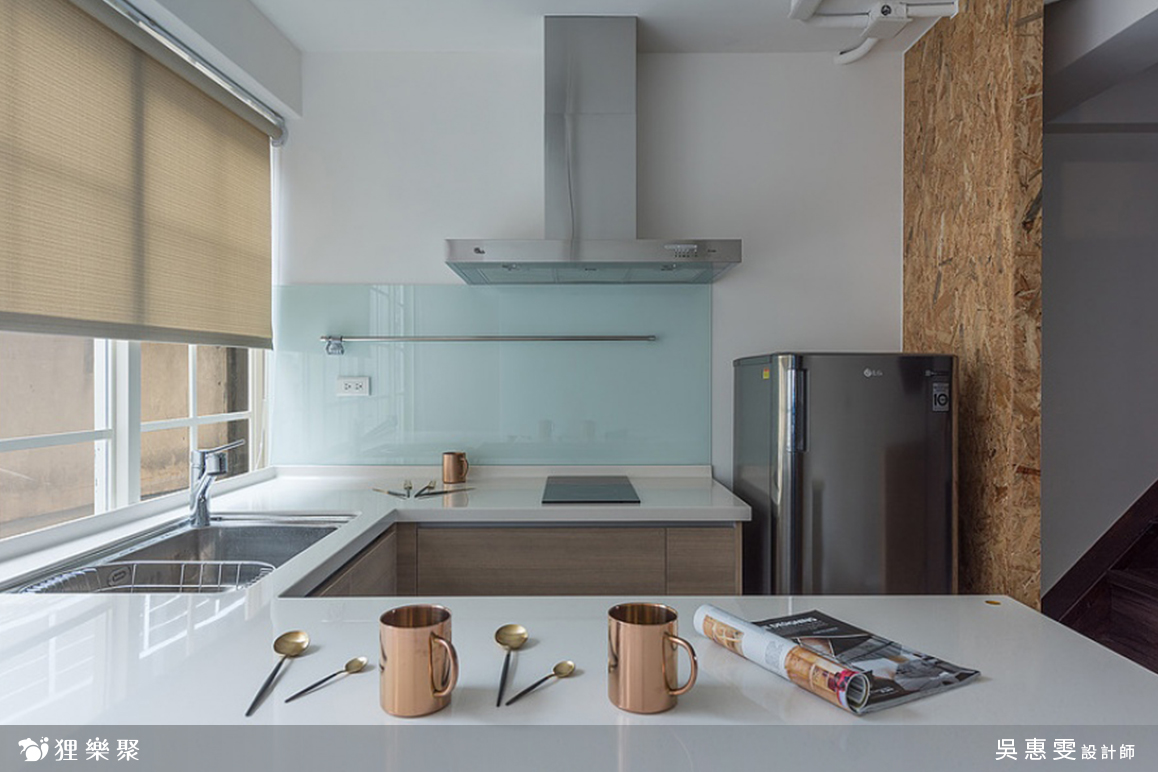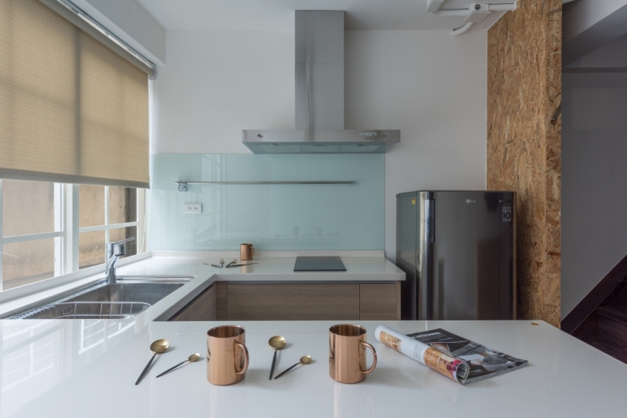原有樓梯鋸掉第一階後,轉向於走道,並在廚房與樓梯間立一道隔牆,使廚房空間更完整。而ㄇ字形開放式廚房可作為會議桌使用,平時也可以作為工作或用餐空間。