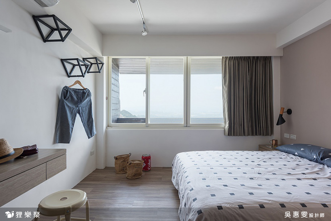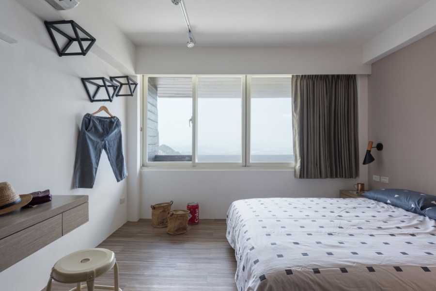 臥室部分則利用簡單的造型衣架及床頭跳色創造美式休憩氛圍,搭配大面窗戶,窗外的山海景更是讓人洗滌了整天工作後的疲憊感。