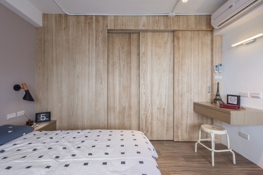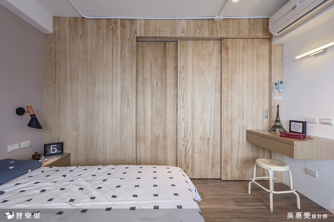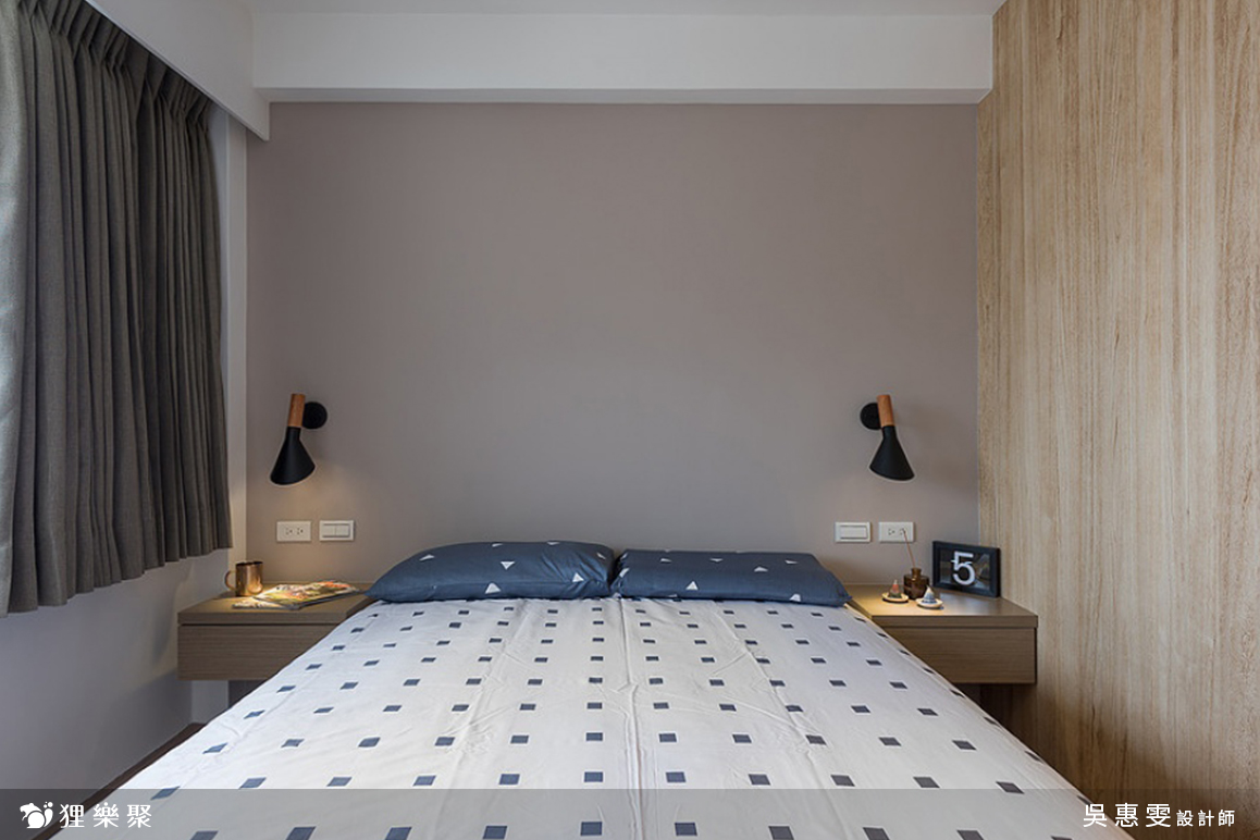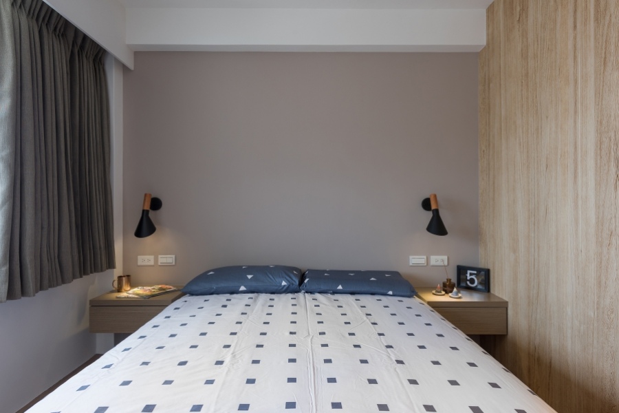 由於此屋高並不高,因此不做天花板,燈具的管線直接外露,並噴上與天花相同的白色,而床頭燈具的部分選擇了金屬材質的造型壁燈做照明,散發出濃濃的工業風。臥室部分則利用簡單的造型衣架及床頭跳色創造美式休憩氛圍,搭配大面窗戶,窗外的山海景更是讓人洗滌了整天工作後的疲憊感。