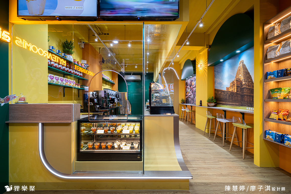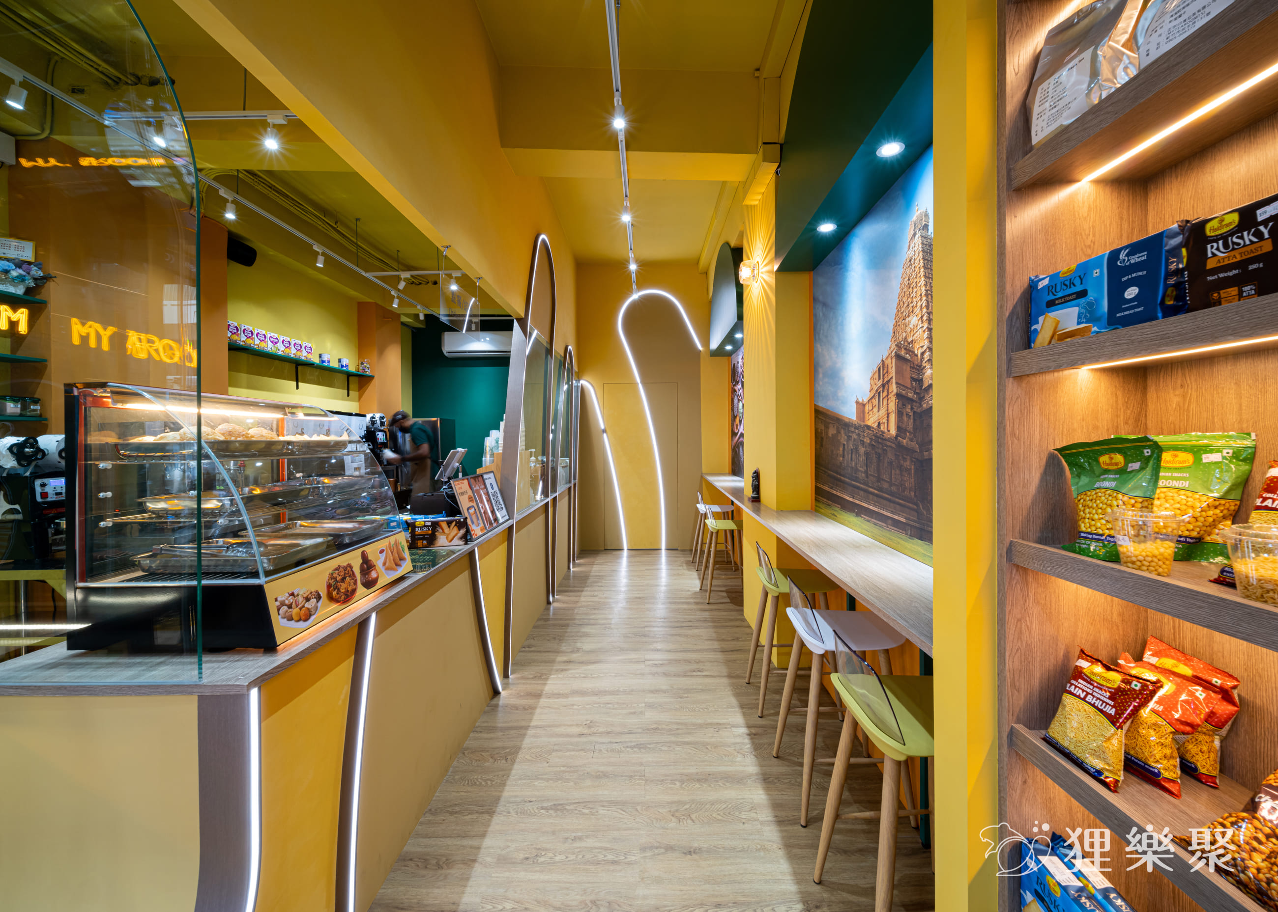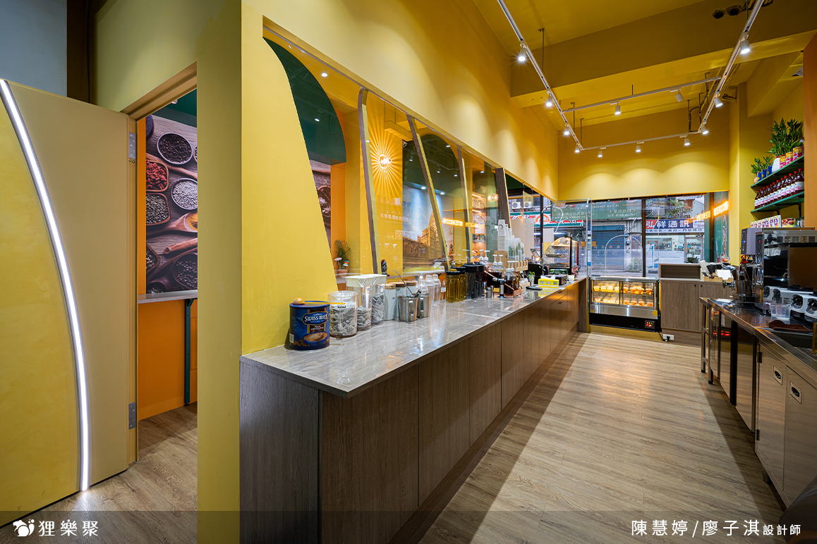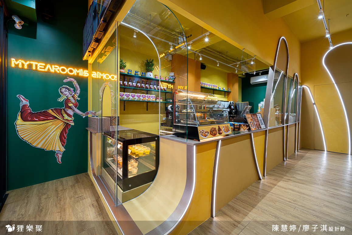 展示櫃上擺放著精緻的印度零食,提供來客挑選。透明玻璃能清楚看見後面的工作環境,而吧檯上高起的設計,免去了拉茶表演時,溢出噴濺造成的清潔不易。由光帶勾勒而成的曲線延續至內側,這些線條發想自拉茶時茶湯所呈現的優美線條,鏤空設計不但能維持雪克杯、飲料桶等用具一覽無遺,也為整間店注入輕快活潑的氛圍。