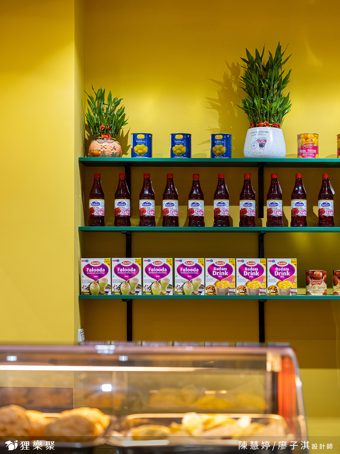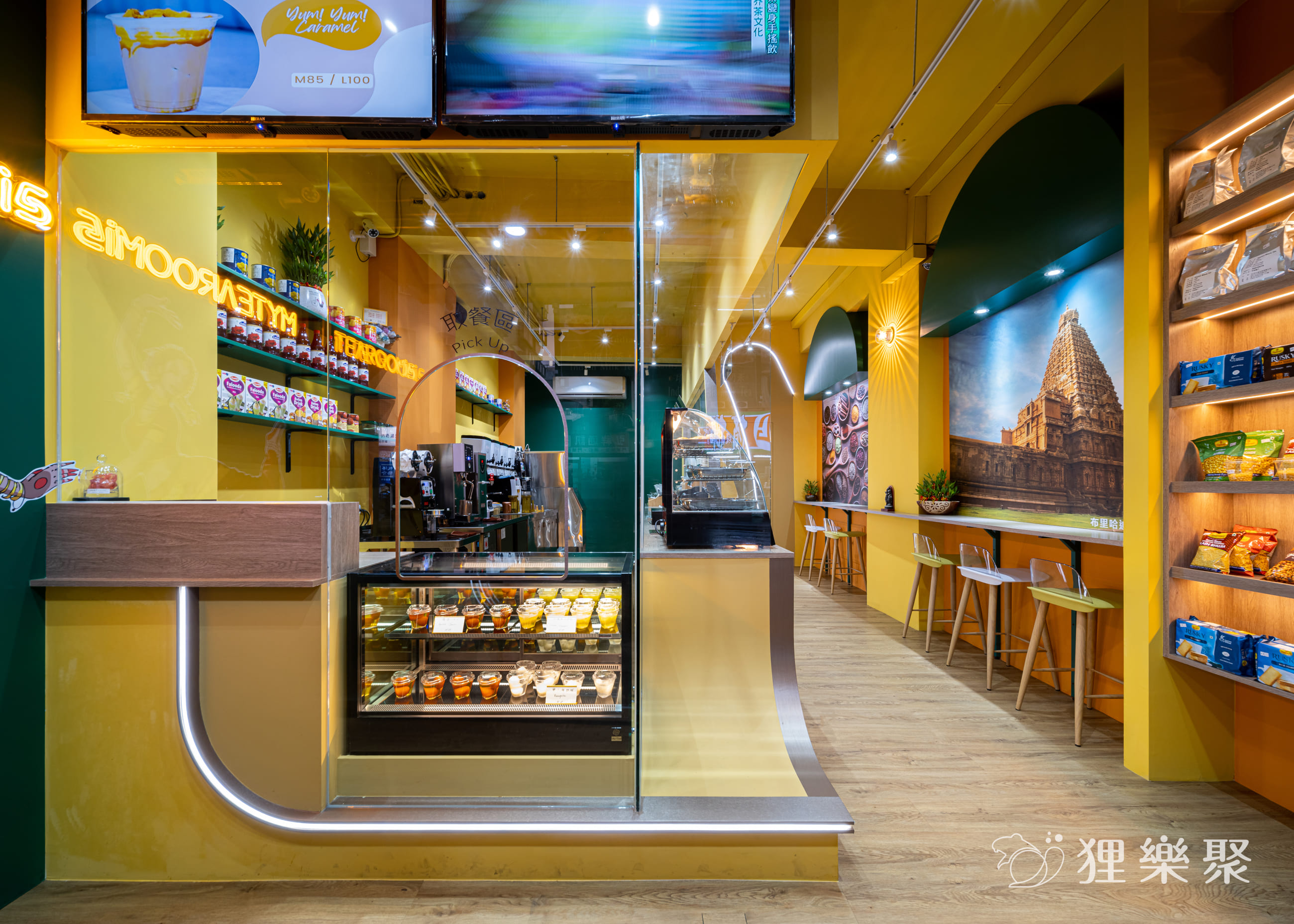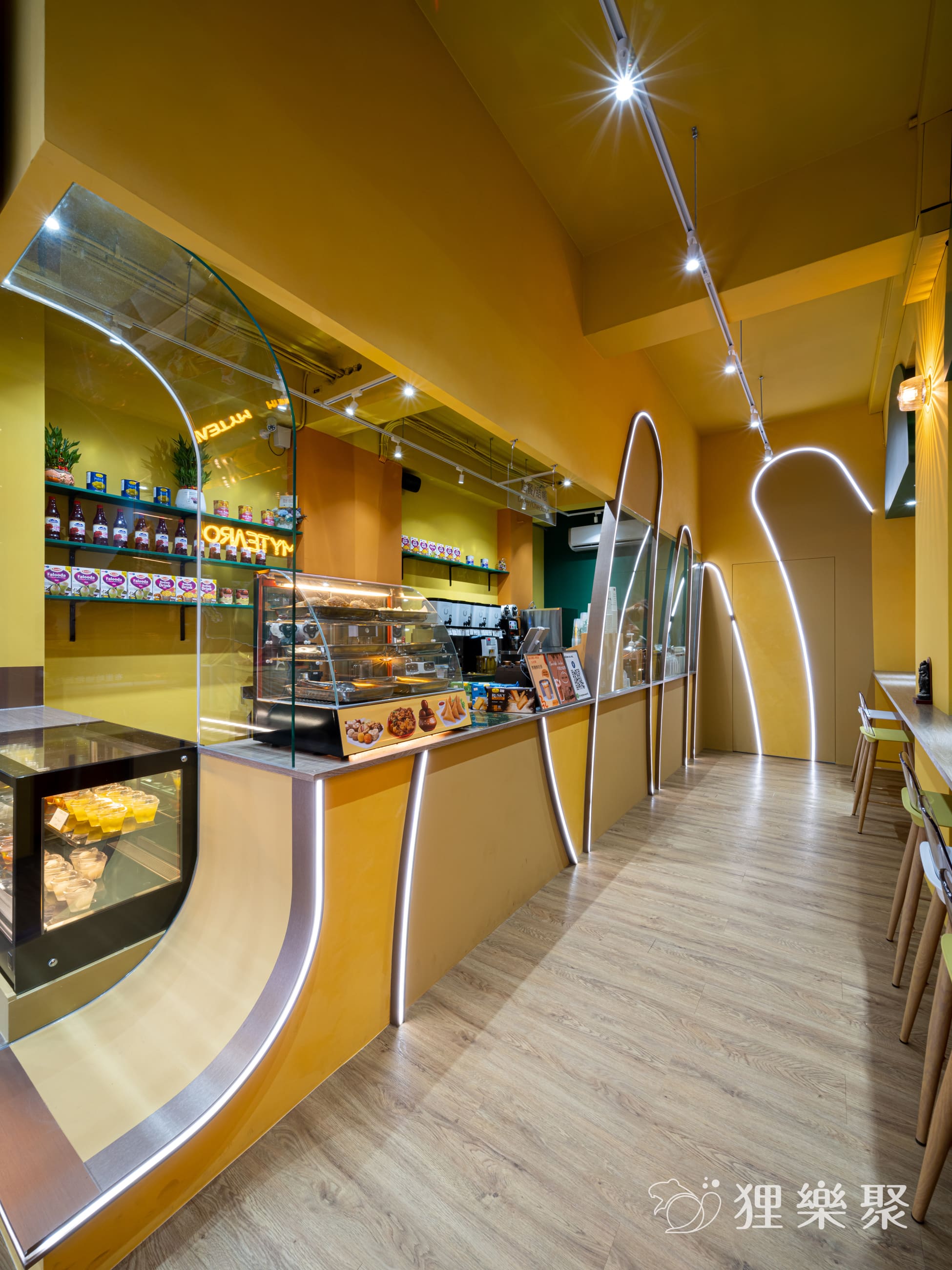 展示櫃上擺放著精緻的印度零食,提供來客挑選。透明玻璃能清楚看見後面的工作環境,而吧檯上高起的設計,免去了拉茶表演時,溢出噴濺造成的清潔不易。由光帶勾勒而成的曲線延續至內側,這些線條發想自拉茶時茶湯所呈現的優美線條,鏤空設計不但能維持雪克杯、飲料桶等用具一覽無遺,也為整間店注入輕快活潑的氛圍。