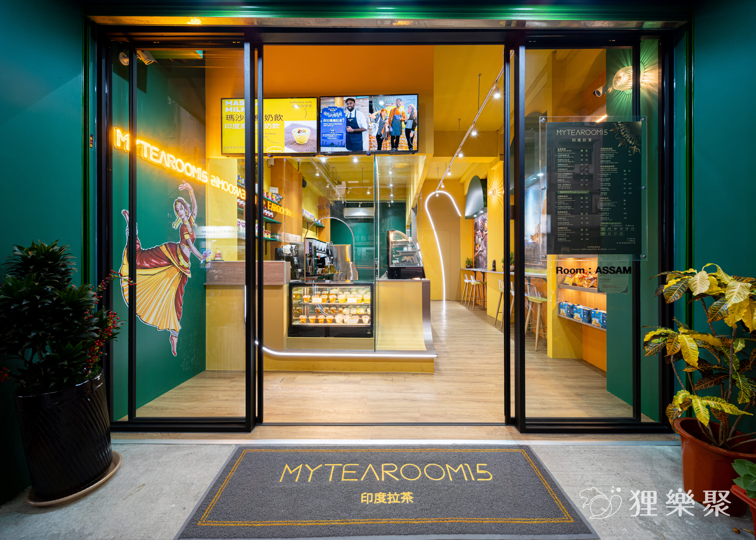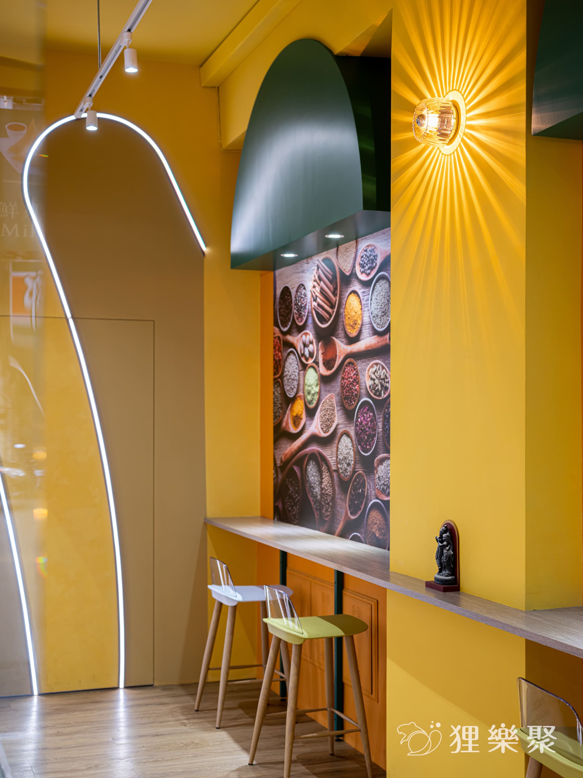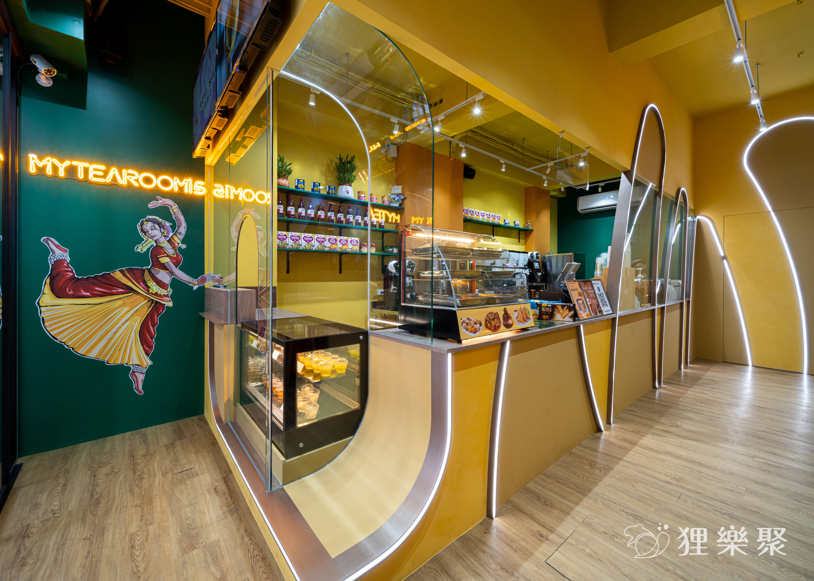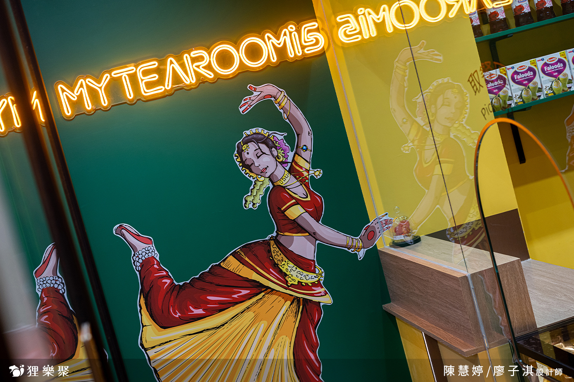 設計理念:這次幫印度老闆設計異國風情的飲料店。我們將拉茶的動作作為造型發想,使用LED光帶讓整體空間猶如製作拉茶般的流動,並使用印度國旗的顏色作為整體設計視覺的顏色基調。加入霓虹燈與跳舞的女人作為異國風情互動的整體氛圍,