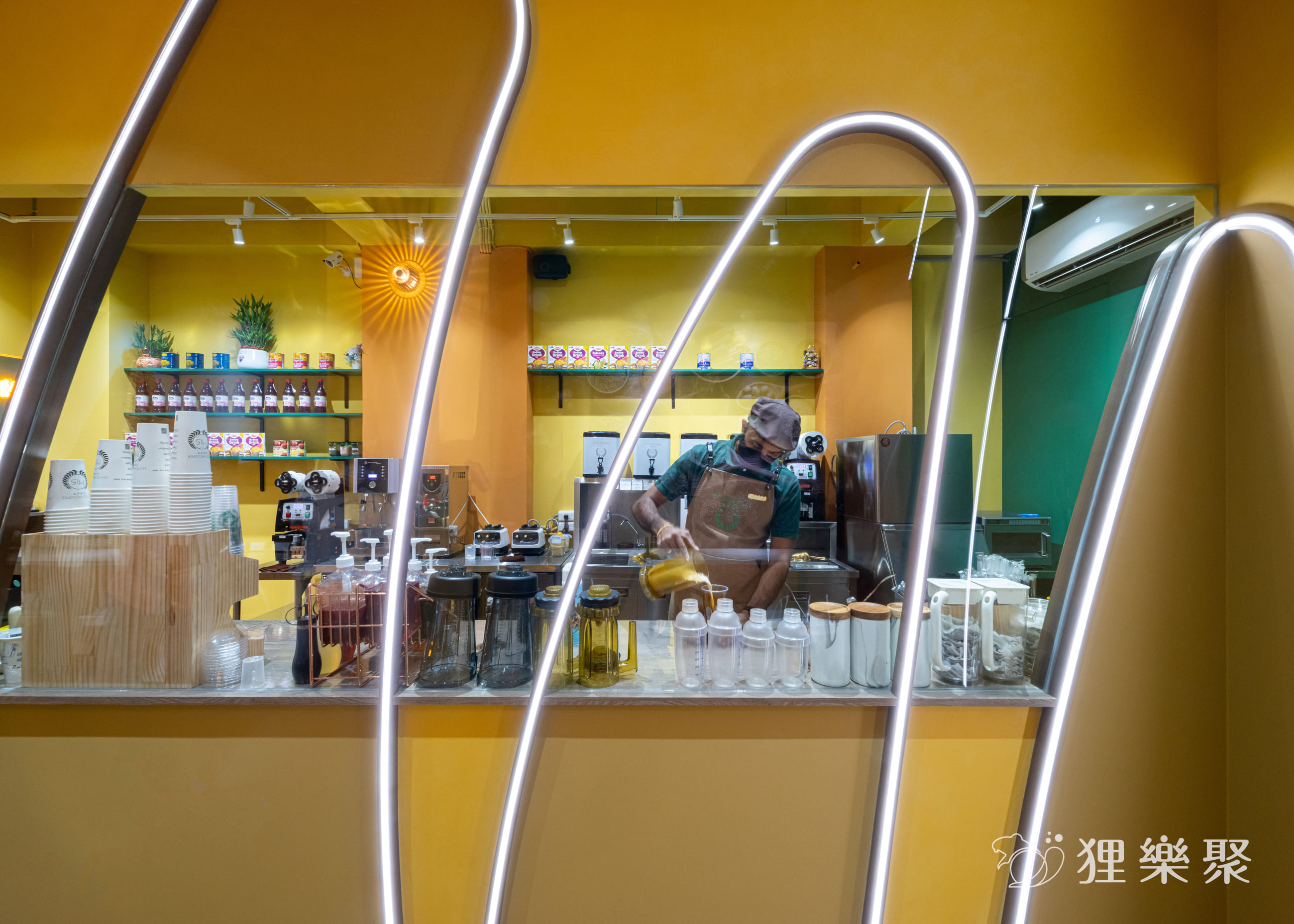印度拉茶製作過程中,華麗的手法令人目不轉睛,杯與杯來回流轉、甩動的茶湯,會產生細緻的泡沫,讓奶與茶完美交融,彩帶般被反覆拉長的拉茶,香濃又美味。花式拉茶不同於一般手搖店,動作需求比較大。我們特意預留表演用的大舞台空間,將封口機、工作檯與水吧檯等設備,都移至後方一字型擺放,確保拉茶完成後工作動線順暢。延伸閱讀:<< 裝潢設計費用又爆了?學會預算分配變身成裝修精算師 >>