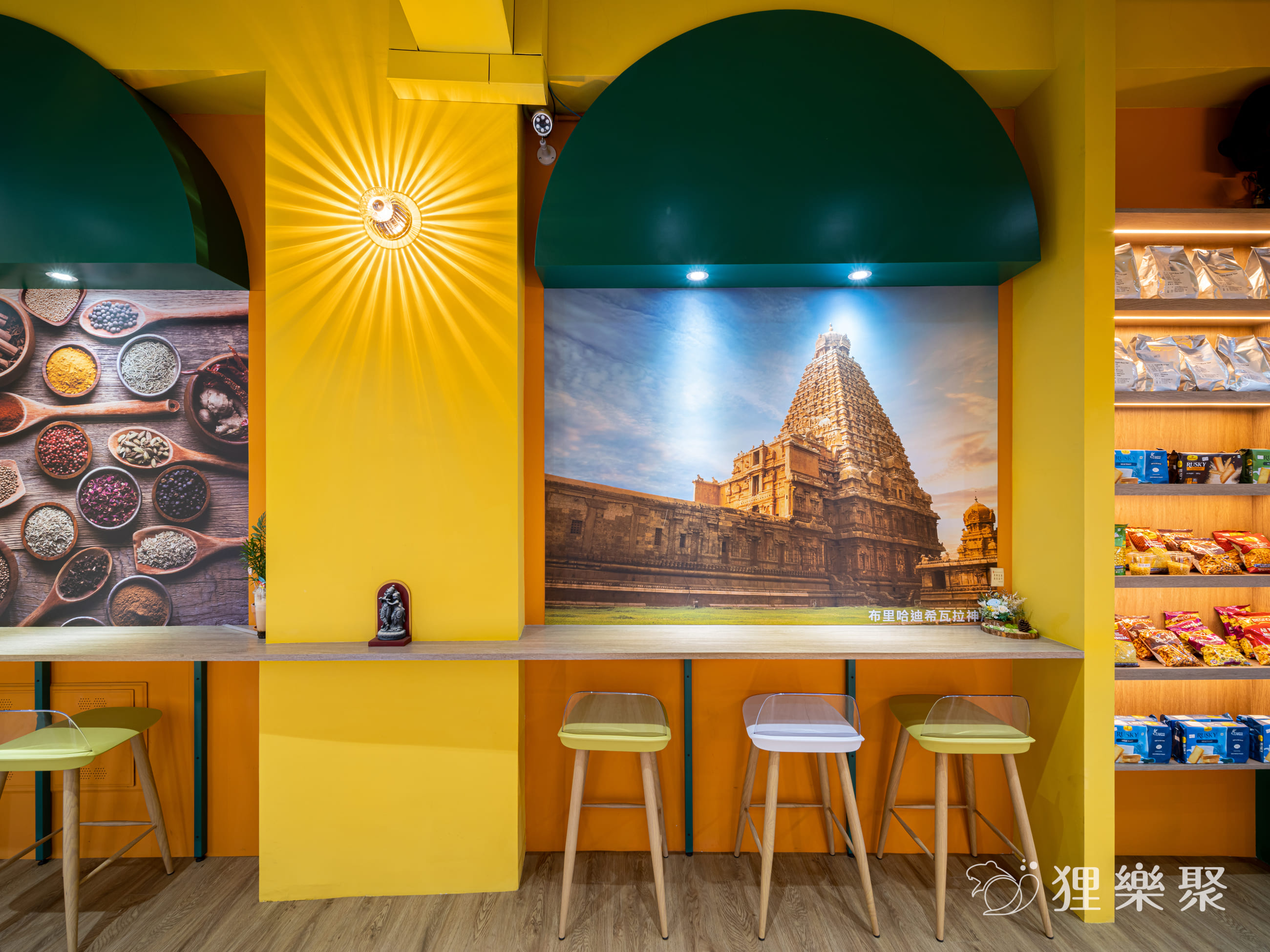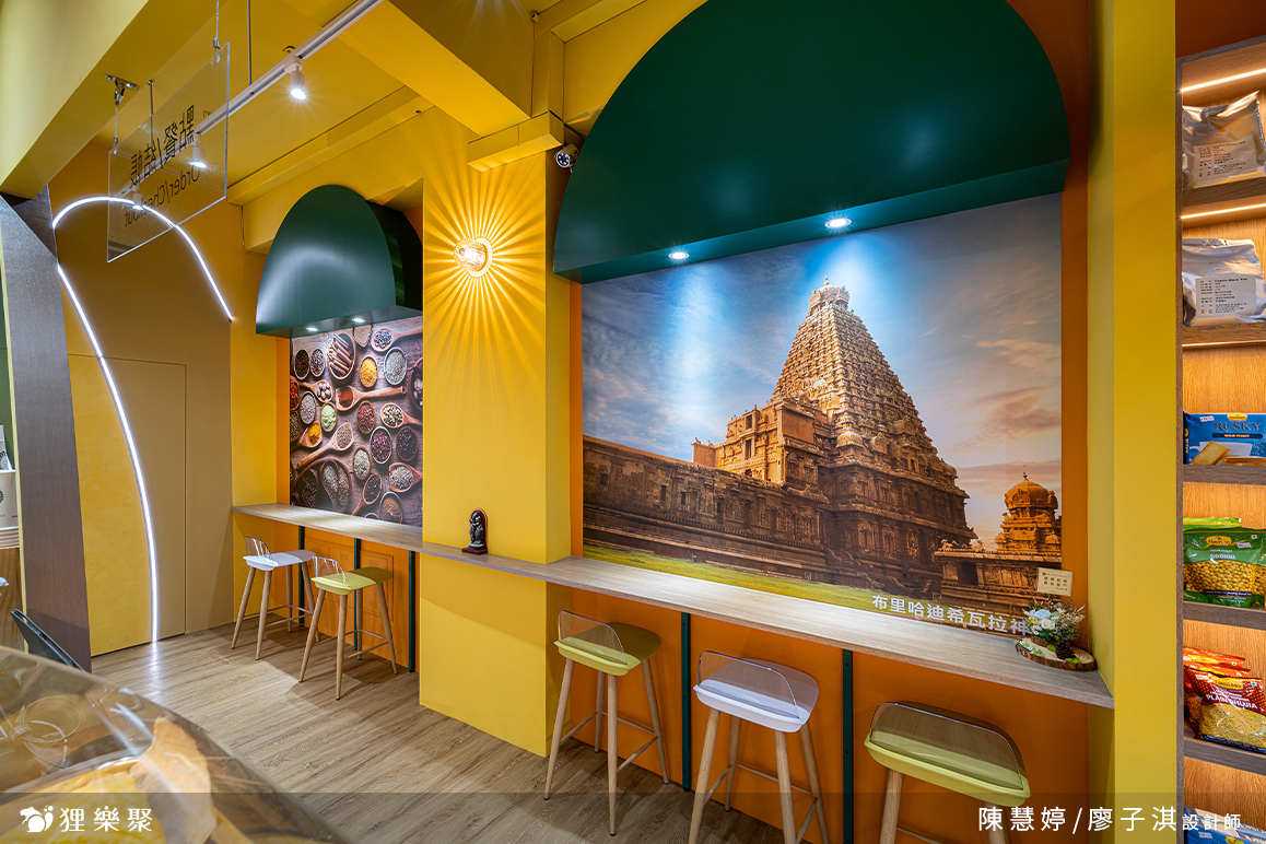 身穿傳統服飾的舞者翩然起舞,以舞姿展現當地的文化;色彩繽紛的香料,獨特的風味對人體十分有益,家家戶戶總有相傳的獨特秘方搭配,對於當地人來說更是不可或缺的存在。老闆說,大家對印度的印象多半是北印的泰姬瑪哈陵,而這座布里哈迪希瓦拉神廟位於南印,有著更加悠久的歷史,也是印度最高的神廟。 傳說這座聖塔太高,連影子都無法落到地面,是一座沒有影子的廟。因此我們取其無影的概念,挑選太陽造型的燈具驅散陰影,讓整間店散發著光明、熱情與活力。