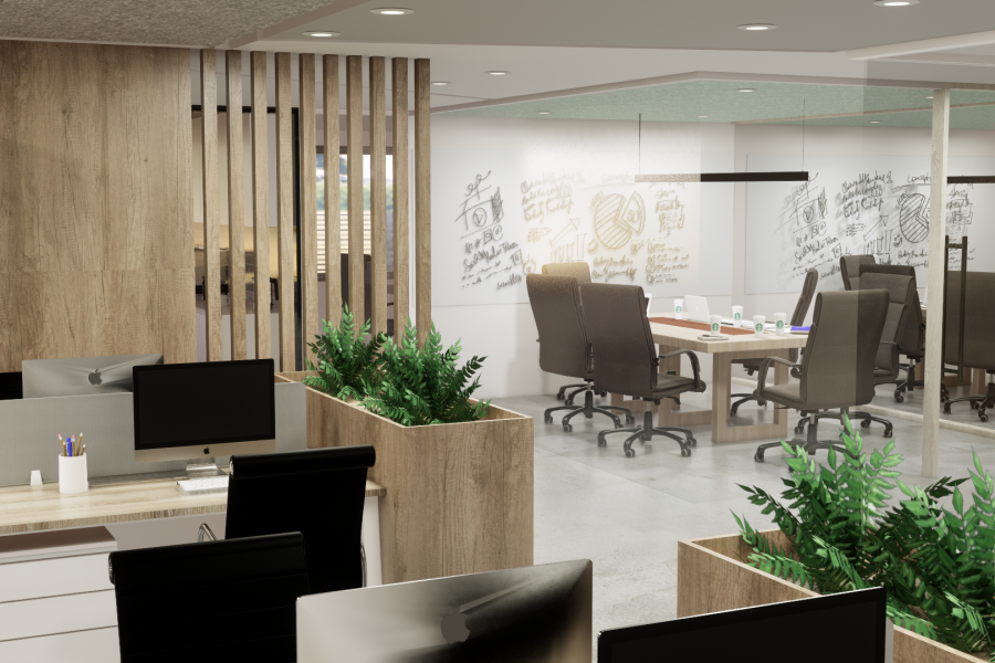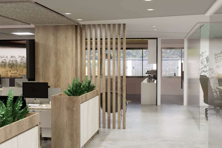 設計理念:開闊的空間感,搭配木質色,呈現舒服清新的現代辦公室。