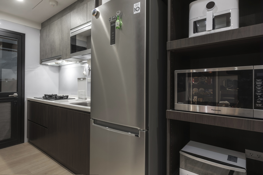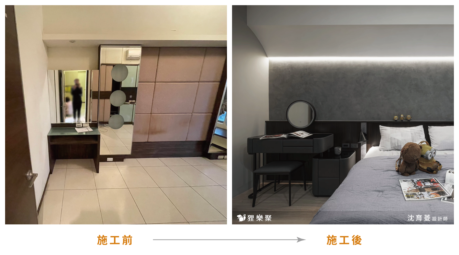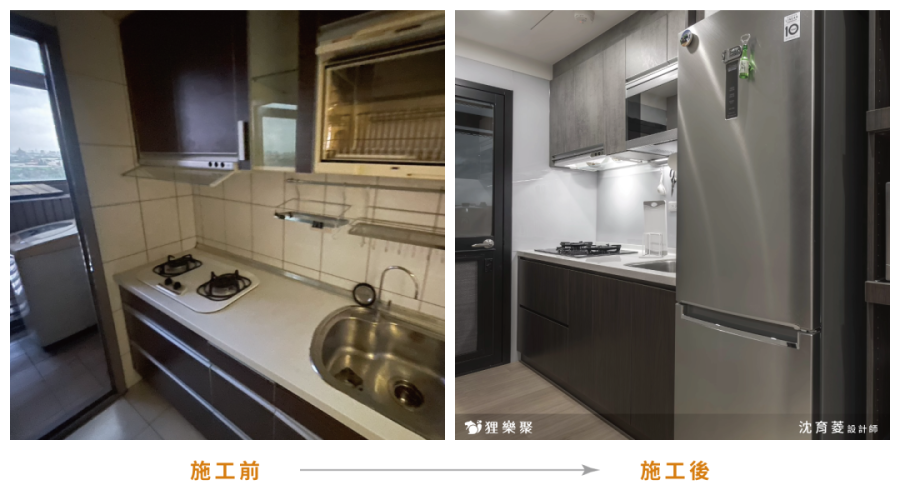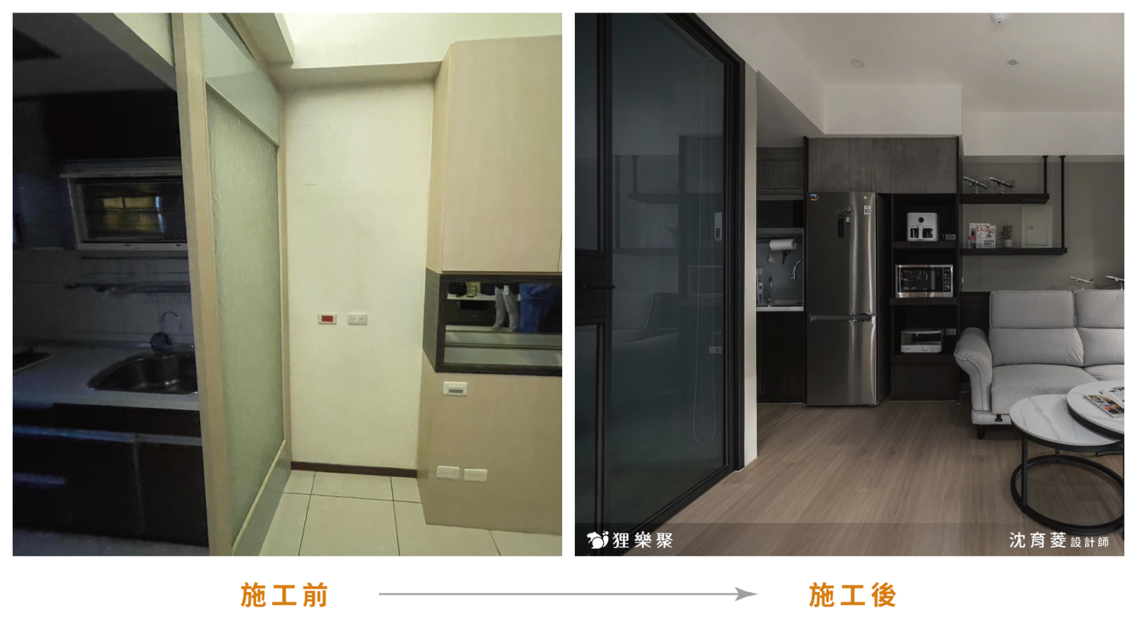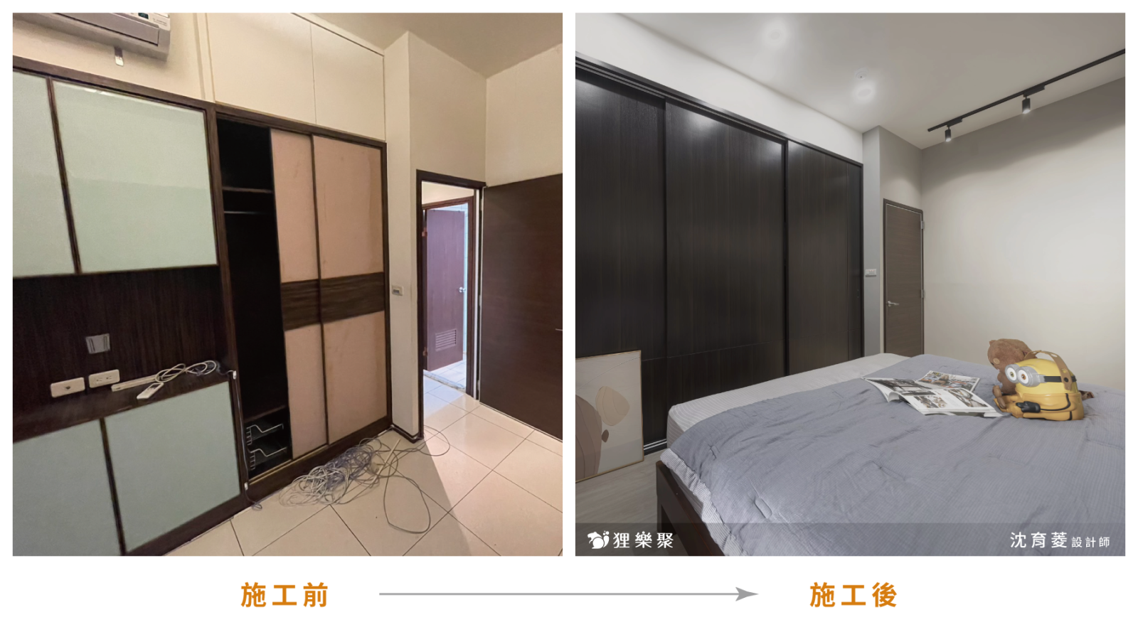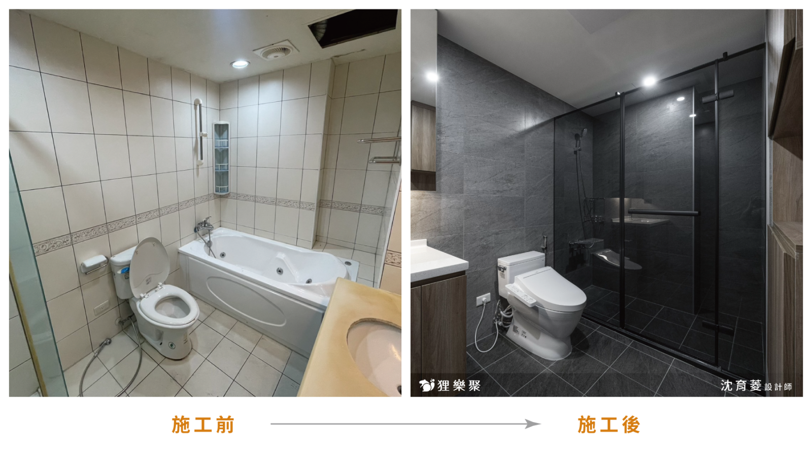 本次翻新涵蓋全屋格局與機能調整,尤其著重廚房與衛浴空間的升級。廚房依循收納動線規劃上下櫃,整併家電設備,打造出便利的電器櫃與操作平台;而原先老舊的衛浴空間,則拆除了原先少用的浴缸,重新施作防水,以黑玻淋浴拉門打造乾溼分離衛浴,隔絕水區,提升整體安全性,讓機能與視覺體驗同步升級。臥室則依屋主需求簡單更新系統櫃收納,並針對主臥壓樑問題設計收樑造型牆,以化解風水疑慮。